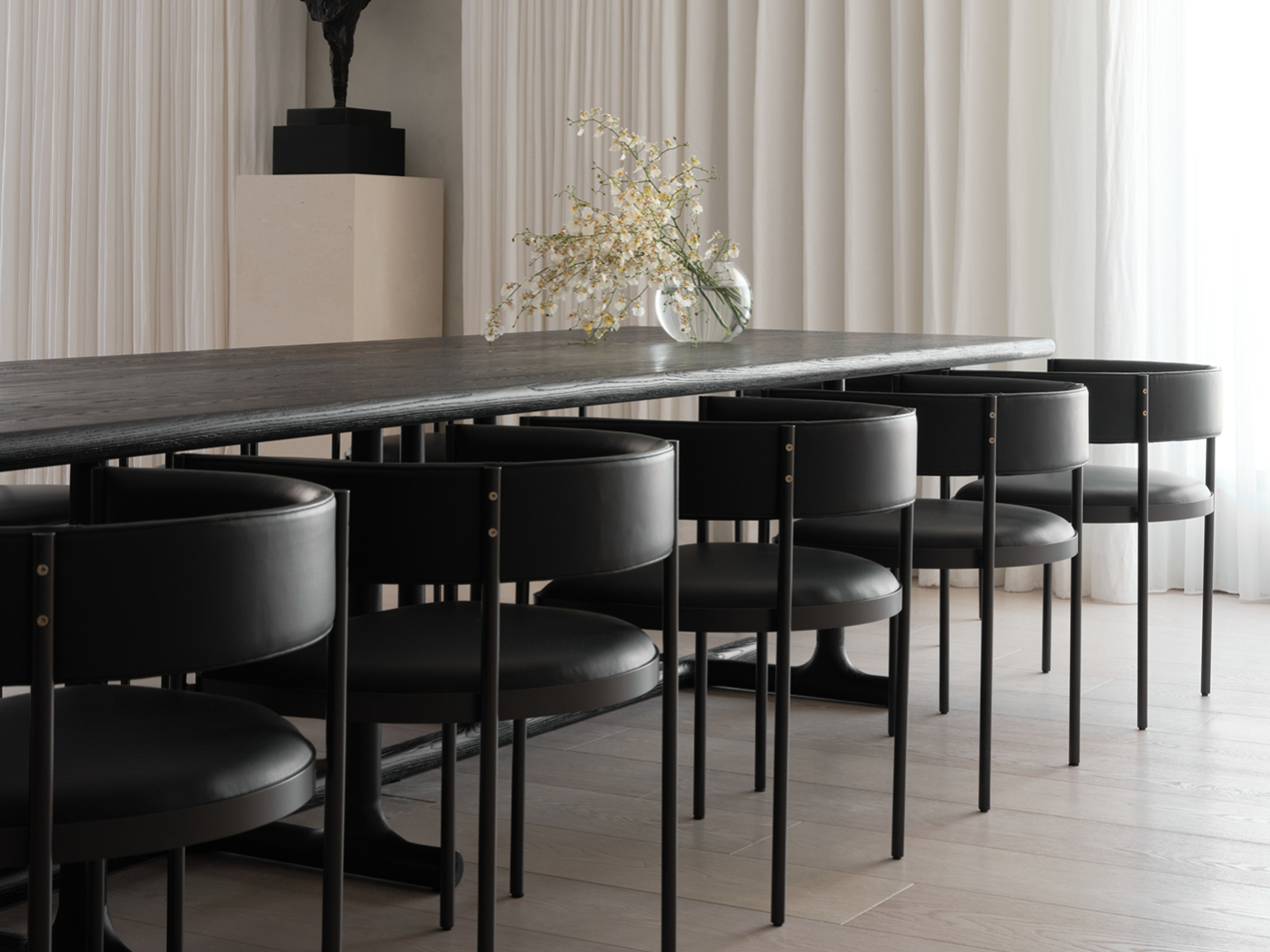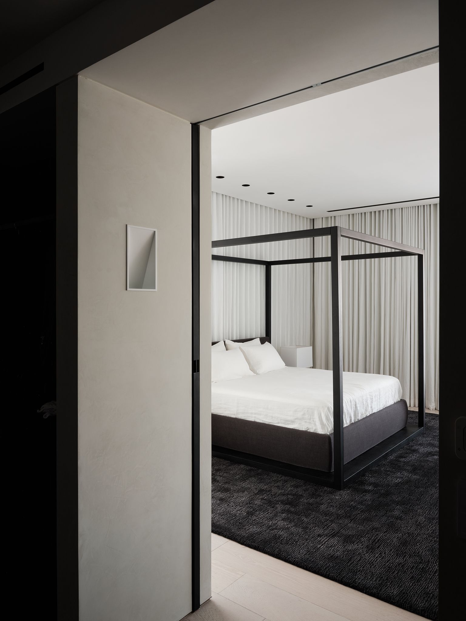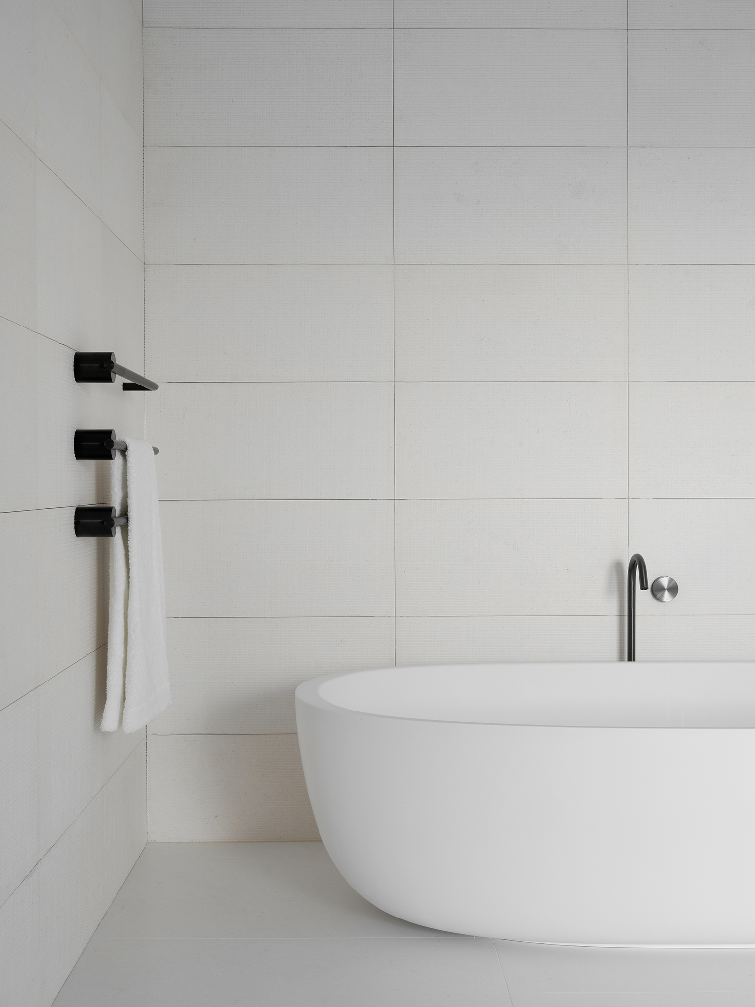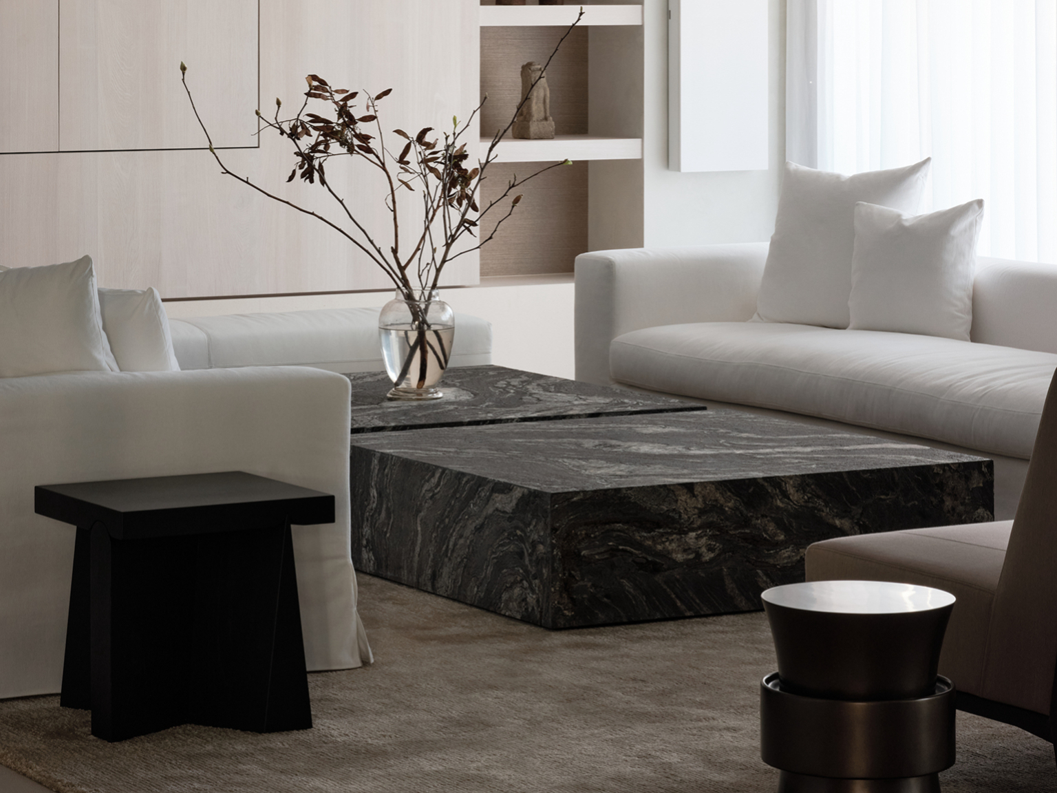 La palette di colori beige e nero si ripete in tutto l'appartamento, con variazioni nelle texture e nelle finiture, seppur mantenendo una forte coerenza cromatica. Il rovere trattato con calce e le pareti in stucco lustro sono utilizzati in tutta la casa.