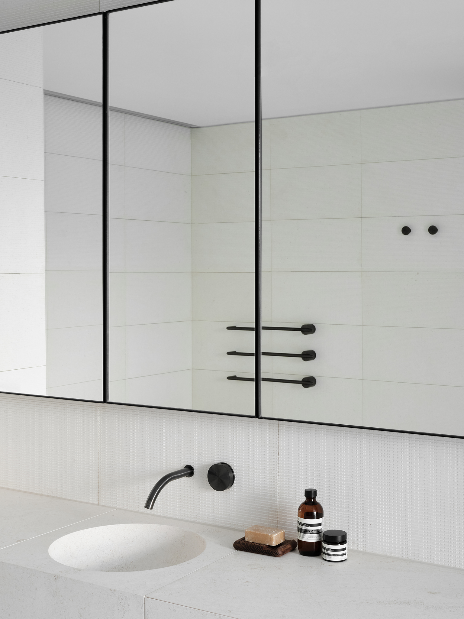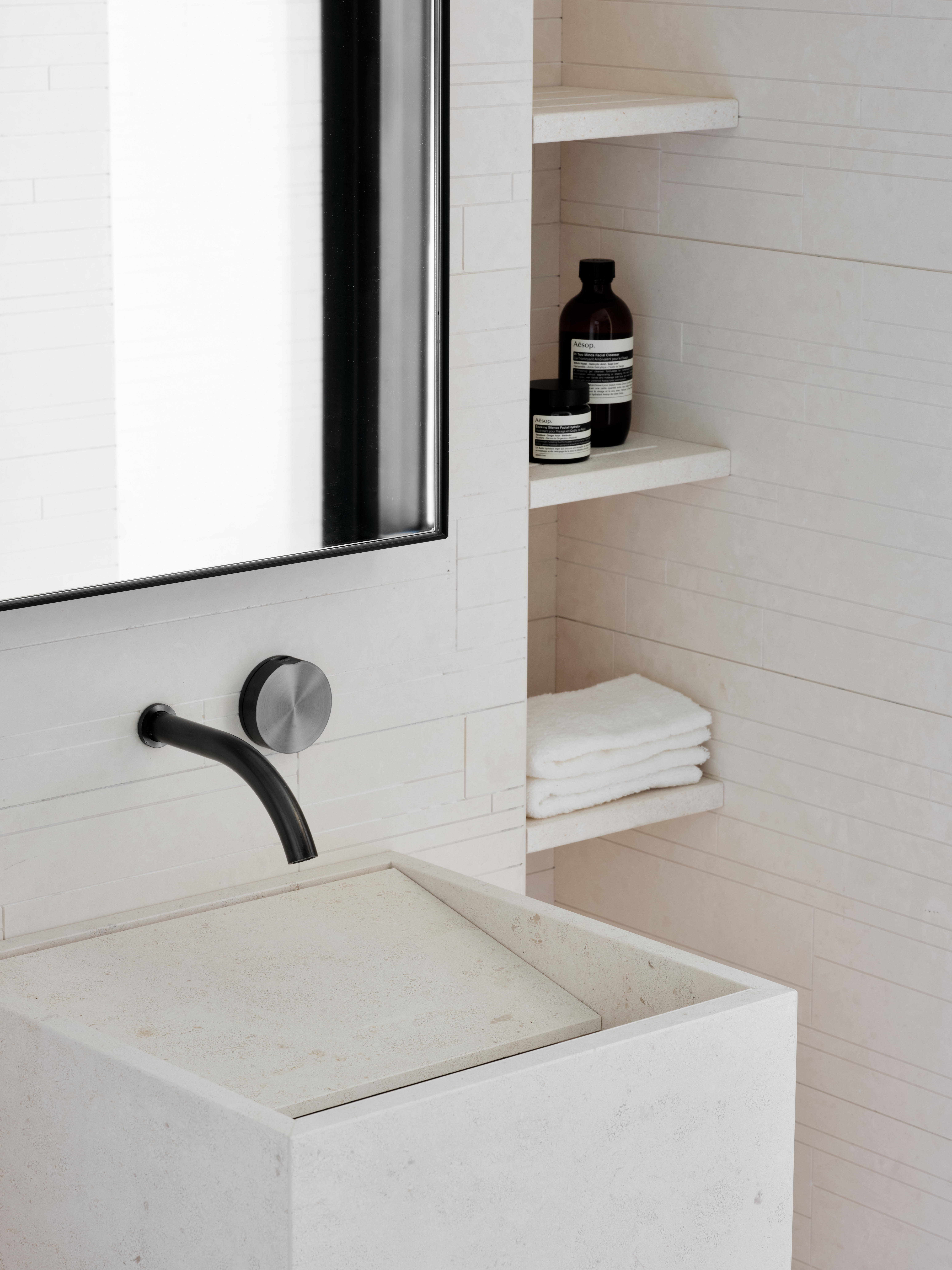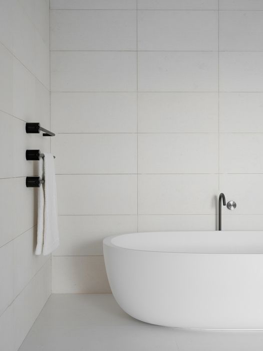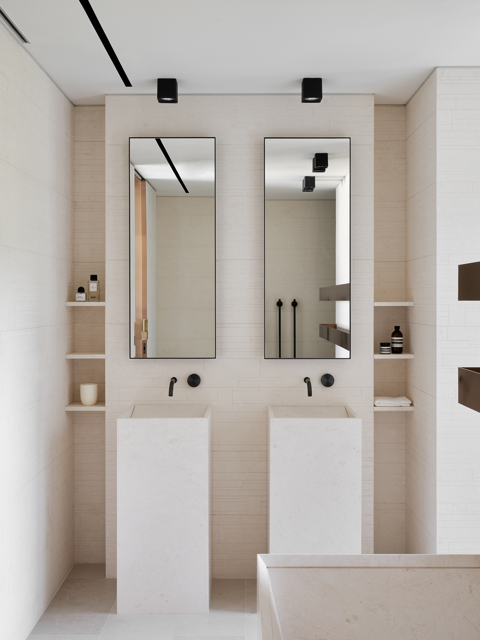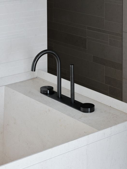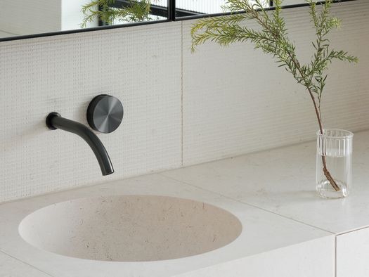 I bagni sono rifiniti in pietra calcarea: qui gli accessori e i rubinetti CEA delle collezioni Giotto, Equilibrio e Free Ideas in finitura Black Diamond danno vita a un ambiente semplice e armonioso con soluzioni personalizzate e curate nel minimo dettaglio.