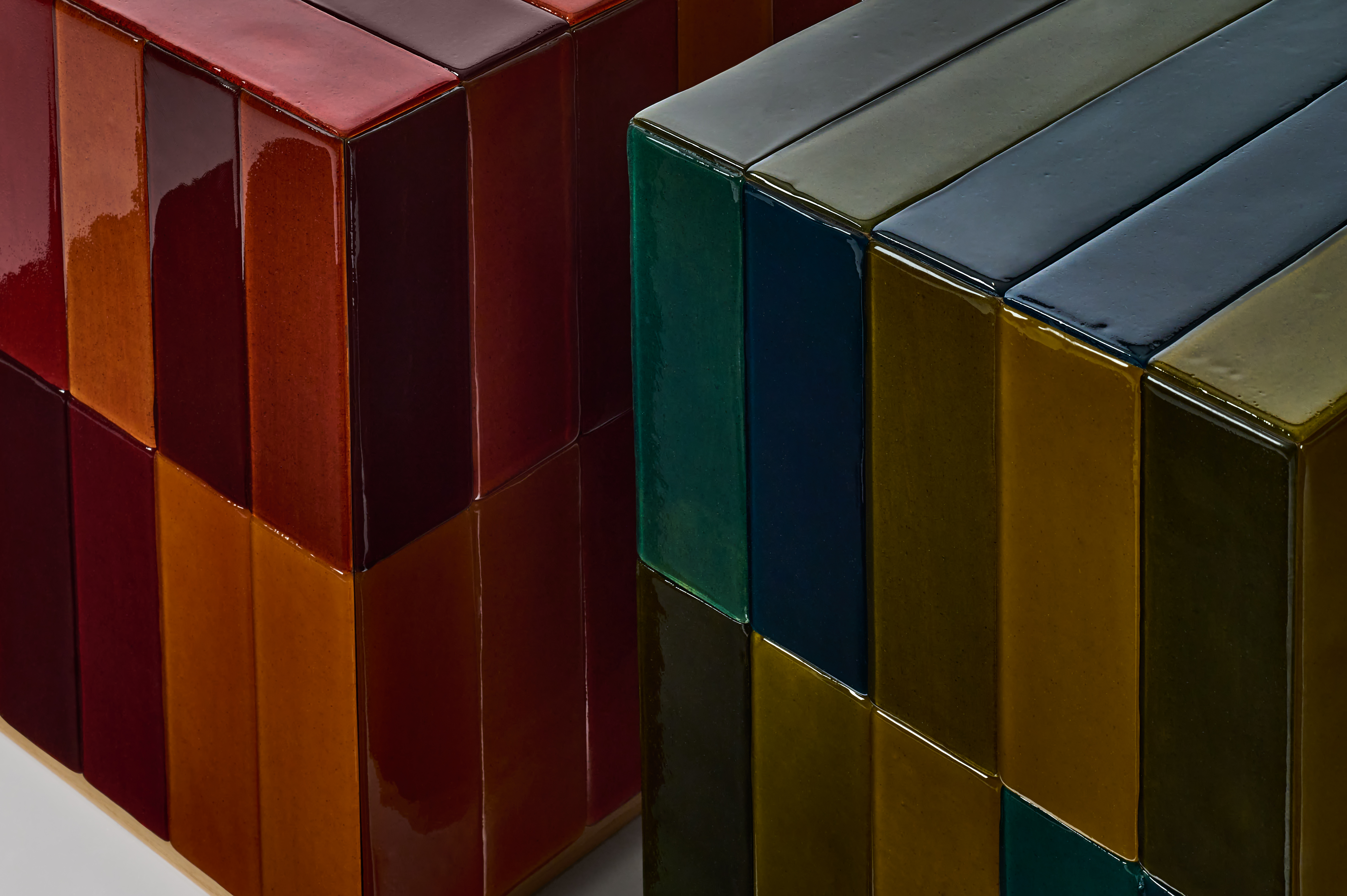 Elementi in ceramica smaltata pensati per creare sequenze lineari, griglie grafiche o mosaici dinamici. Il sistema di illuminazione Glowtile