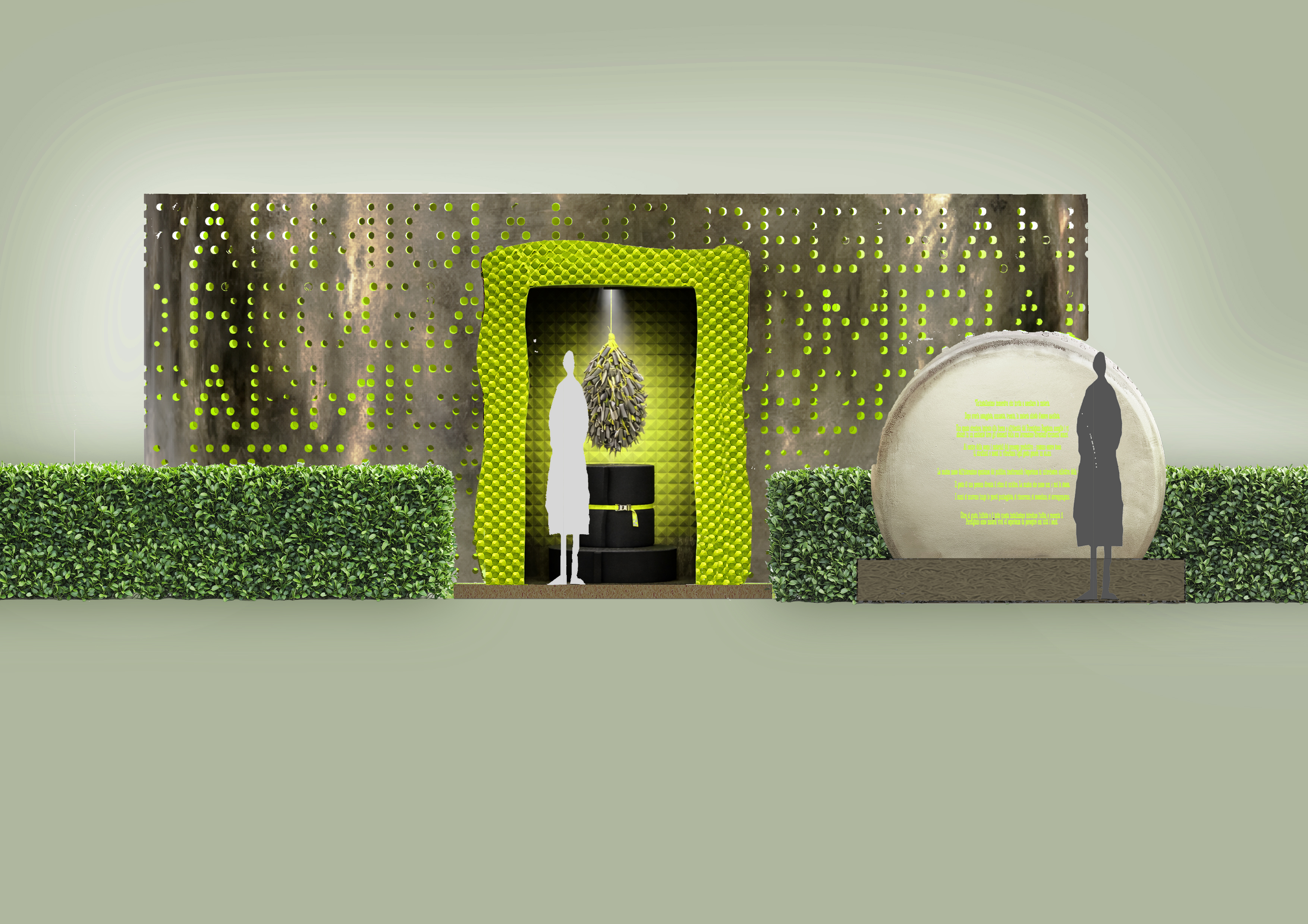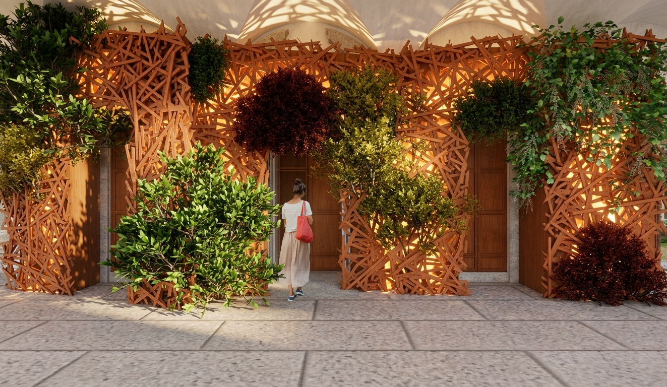 Nel portale della Hall dell’Aula Magna si incontra Innesti, progettata da Silvio De Ponte per Idealverde, una struttura composta da listelli di legno di recupero intrecciati e arricchita da vegetazione rampicante che riflette sul passaggio dalla materia inerte a quella vivente.