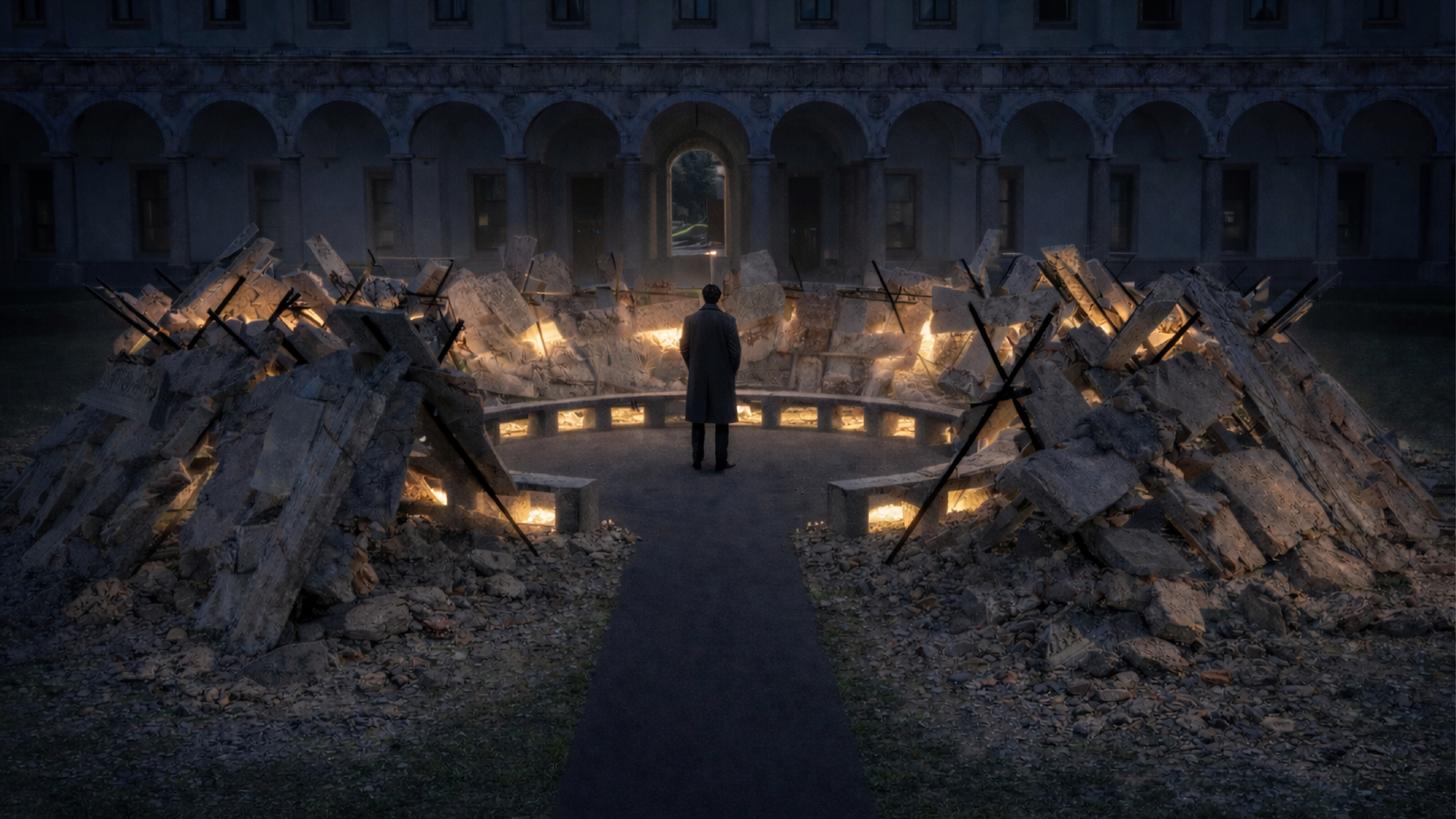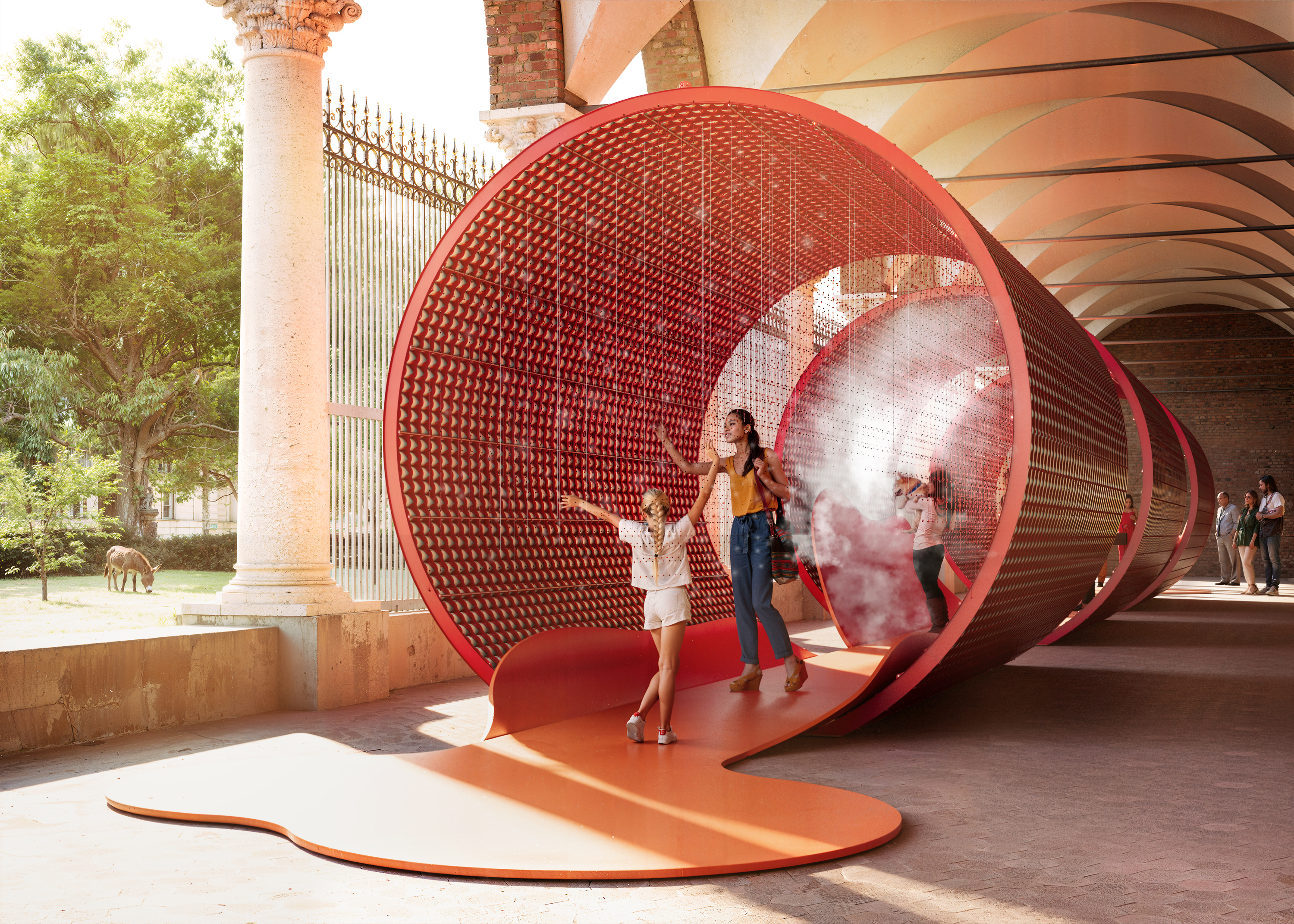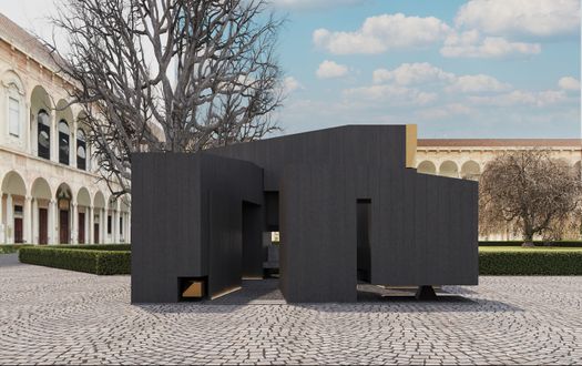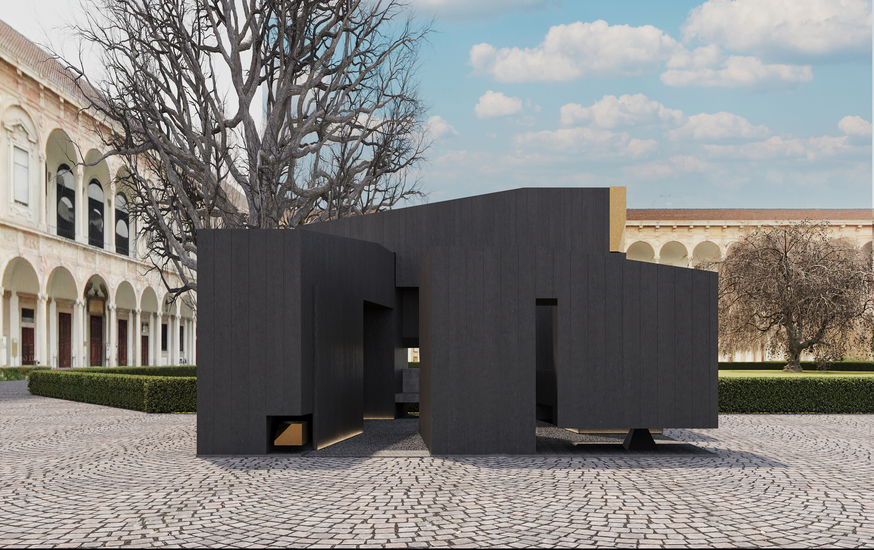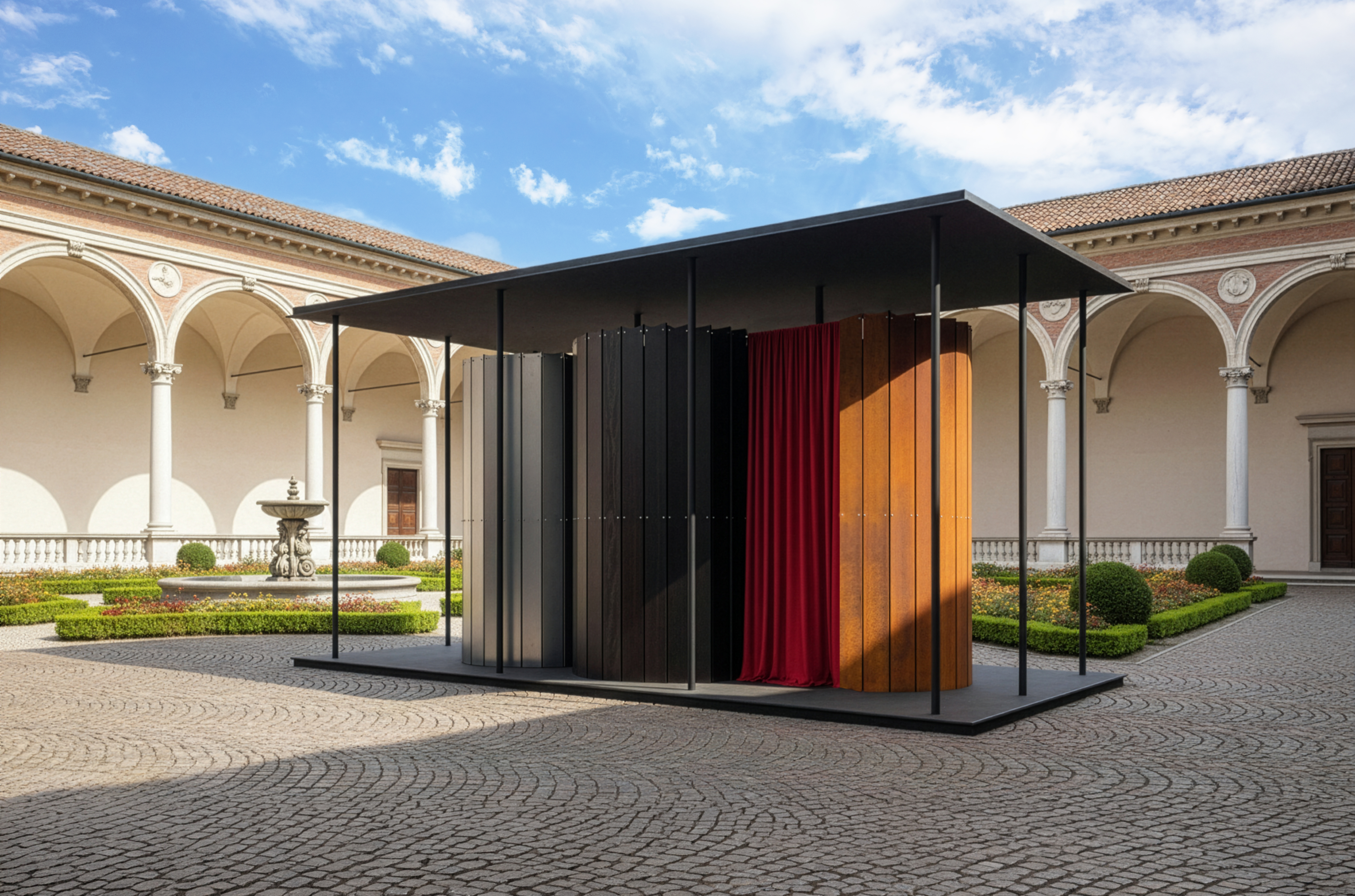Il Cortile d’Onore ospita numerosi interventi che interpretano la materia come memoria e trasformazione. Mater, progettata da Alessandro Scandurra con Holcim Italia, utilizza macerie rigenerate per costruire una struttura circolare simbolo di comunità e ricostruzione.