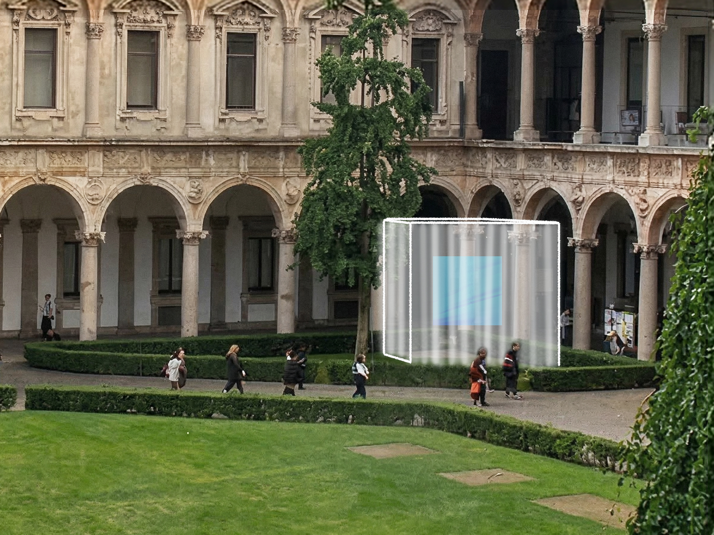 Nei cortili dell’università la materia diventa paesaggio, memoria e sperimentazione architettonica. Nel Cortile del ’700 Piero Lissoni realizza UN_Material per Sanlorenzo, che ricostruisce la forma dell’imbarcazione heritage SHE attraverso sezioni in scala reale rivestite di tessuto semitrasparente.