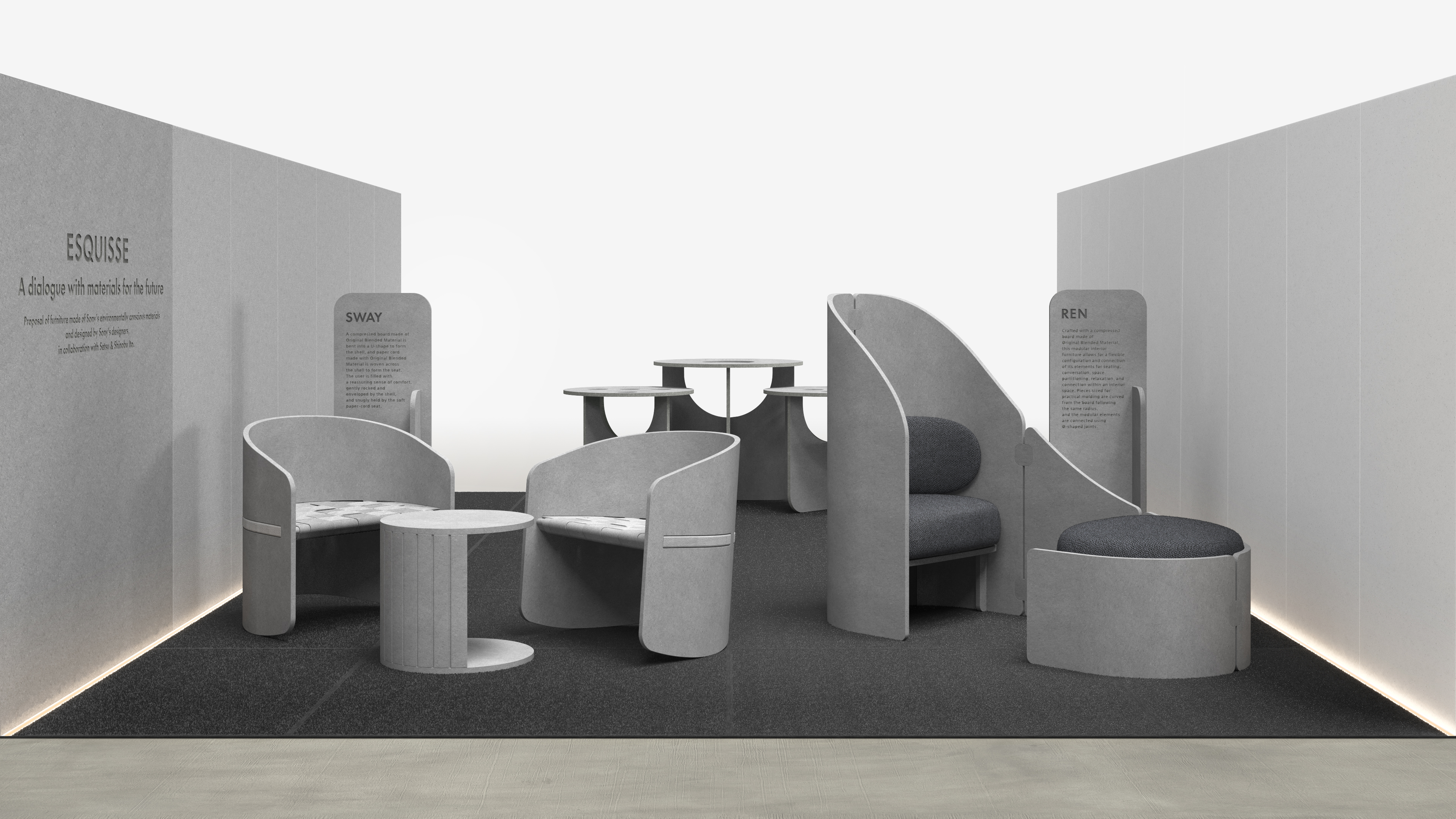 All’interno della Hall dell’Aula Magna il tema della materia viene interpretato come processo creativo e tecnologico. Con Esquisse, Setsu & Shinobu Ito collaborano con Sony Creative Center – Sony Group Corporation presentando arredi modulari realizzati con materiali innovativi come Original Blended Material e Triporous.