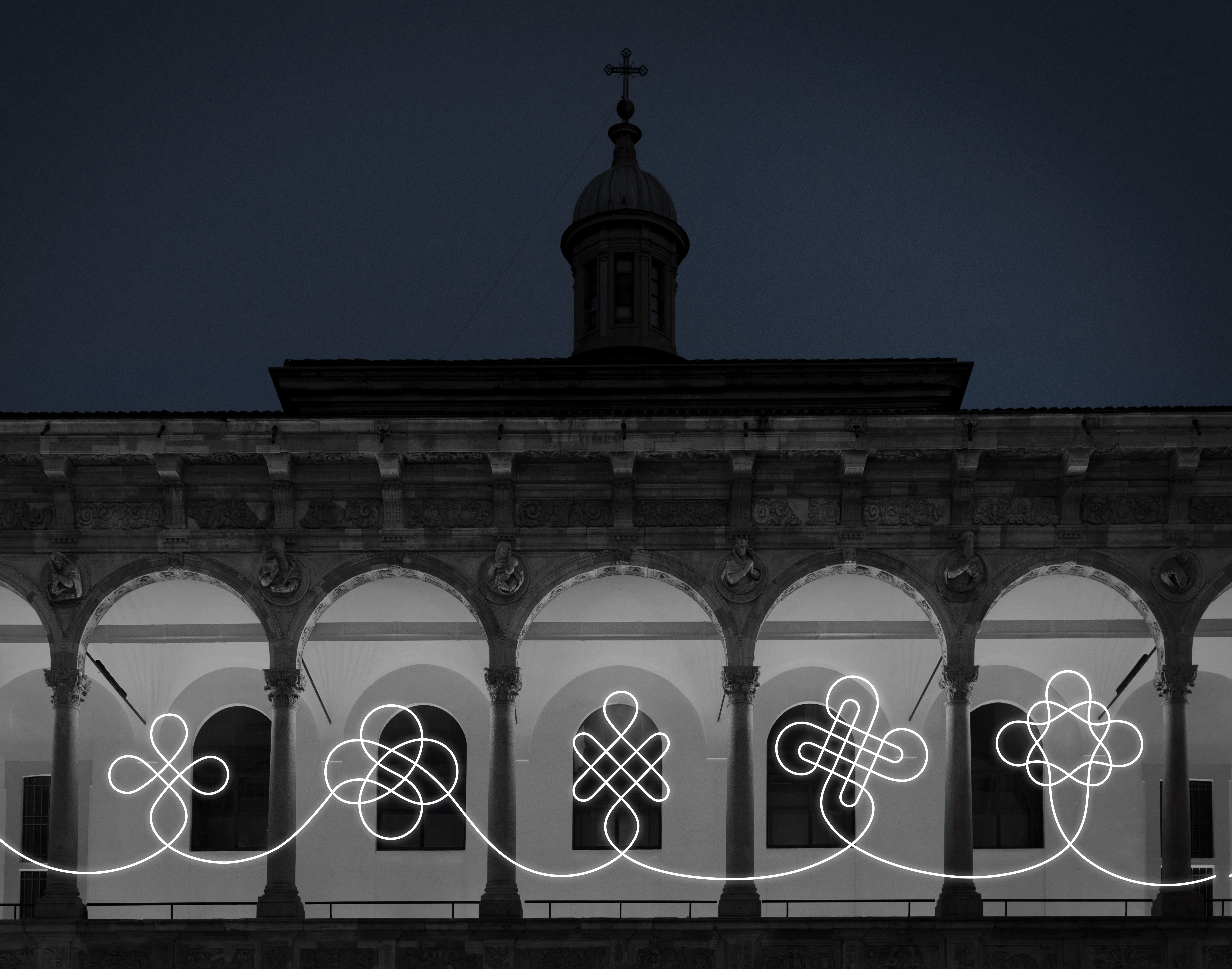 Il percorso prende avvio dalla facciata con Luce Massiccia alla Statale ideata da Alexander Maria Bellman del Gruppo C14 – Milano Design Studio e realizzata con Ilti Luce (Nemo Group), che esplora la compenetrazione tra luce e materia ispirandosi alle stelle massicce e alle teorie quantistiche.