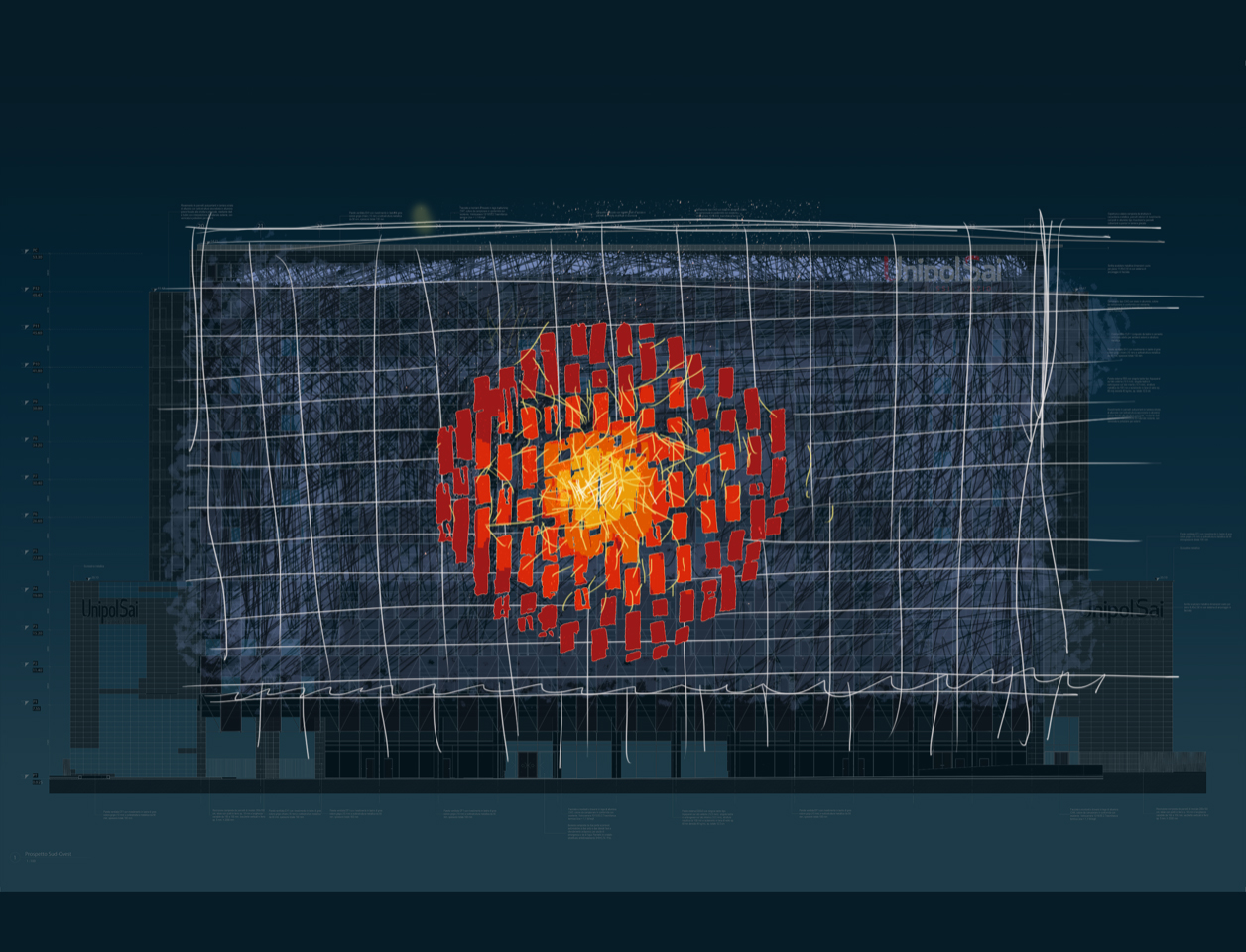 Con Light Our Fire, Studio Azzurro trasforma la facciata dell’edificio Urban Up | Unipol – De Castillia 23 in un organismo luminoso, pulsante di energia e materia in costante metamorfosi. Dopo acqua e aria, è la terra a emergere come protagonista: origine silenziosa e ponte verso il fuoco, elemento primordiale e forza creatrice.