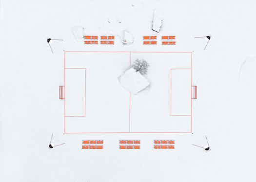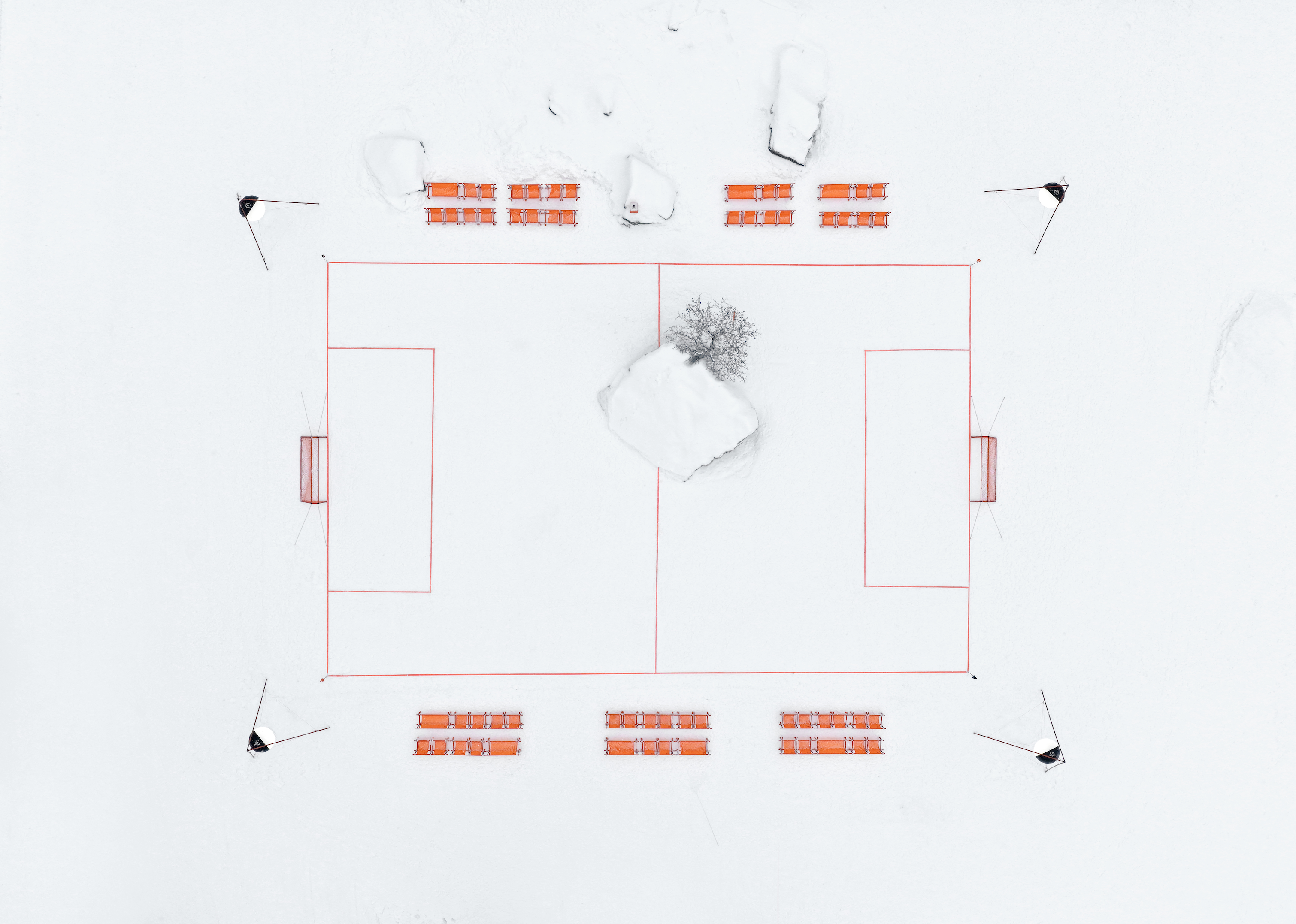Come il campo da gioco, anche le sedute sono progettate per essere trasportate e assemblate direttamente sul posto, spesso dagli stessi spettatori. L’infrastruttura diventa così parte dell’esperienza collettiva, coinvolgendo il pubblico nella costruzione temporanea dello spazio.