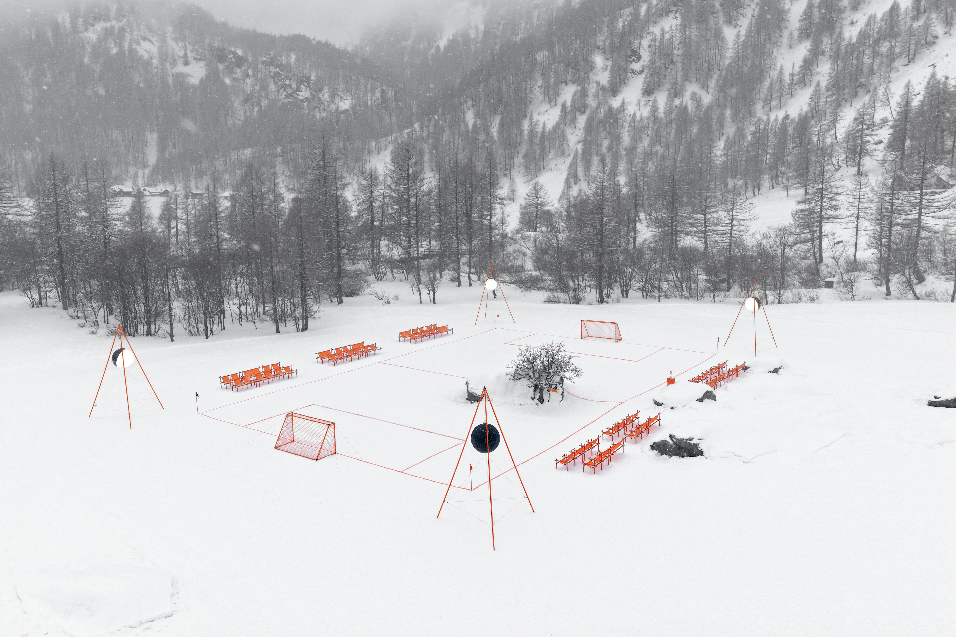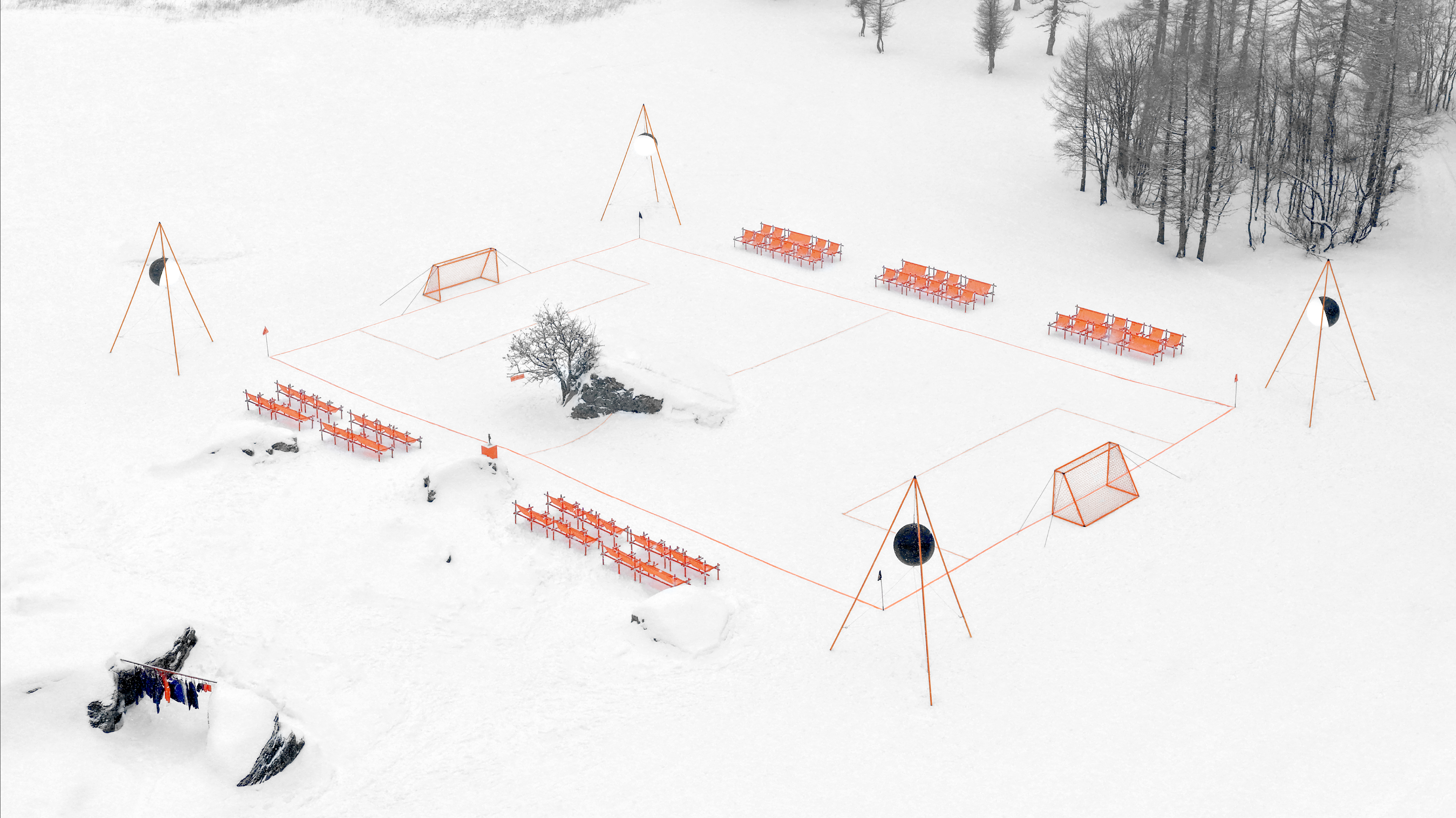 Il cuore del progetto è l’All Conditions Pitch, concepito come una struttura ultraleggera che può essere trasportata persino a piedi. Amsterdam Berlin ha sviluppato il sistema tenendo conto delle condizioni reali dei campi sportivi temporanei, dove variabili ambientali – neve, rocce, terreni irregolari – possono influire rapidamente sull’installazione.