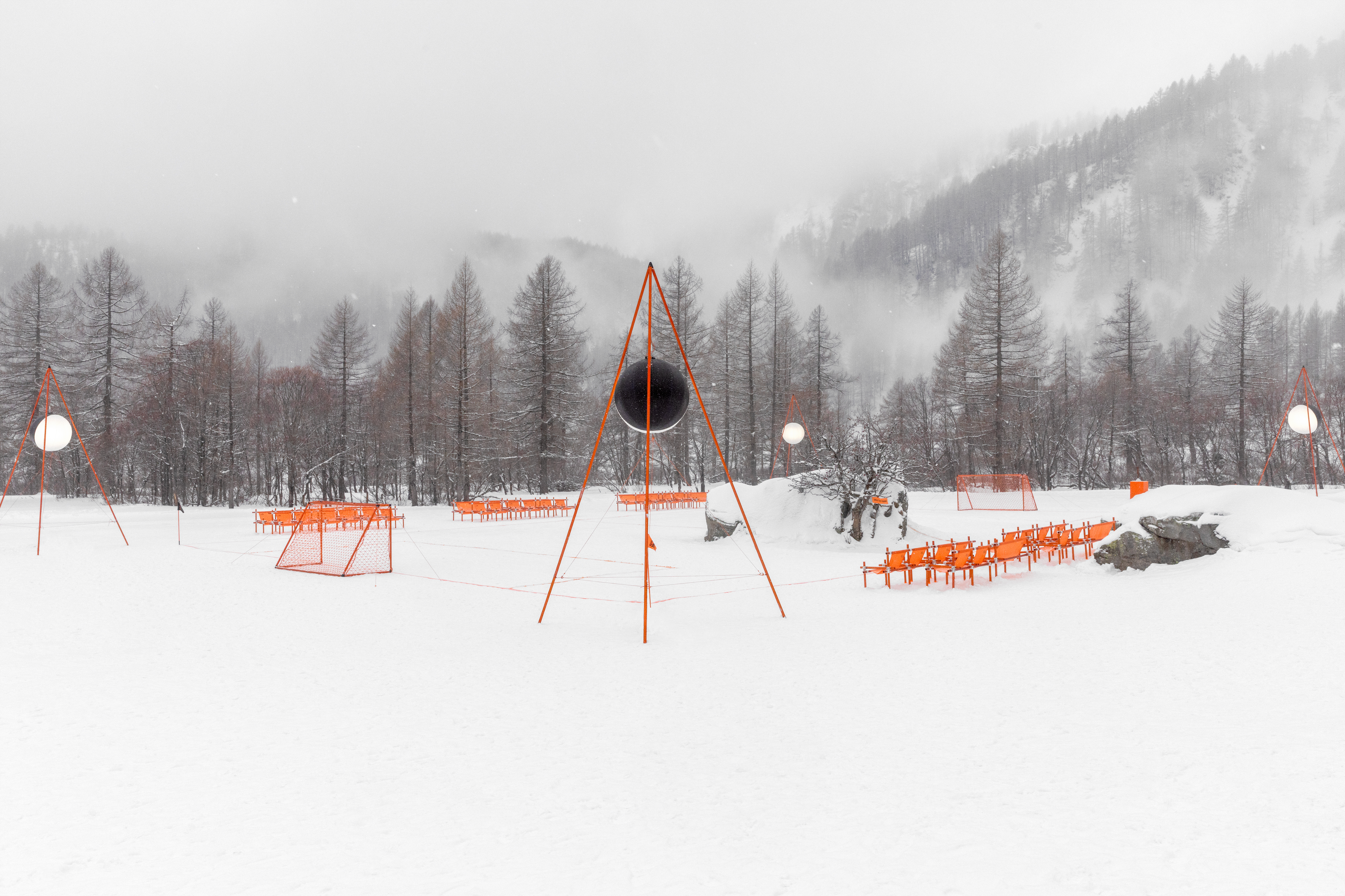 Le porte pieghevoli, realizzate con tubi di alluminio anodizzato arancione da 50 mm, si assemblano tramite connessioni a scatto e sono stabilizzate da ancoraggi progettati su misura per garantire solidità anche su superfici instabili. Accanto al campo, strutture portanti alte fino a 7 metri sostengono grandi lampade sferiche da 1,20 metri di diametro, inserite in telai leggeri in alluminio che trasformano l’illuminazione in un elemento scenografico.