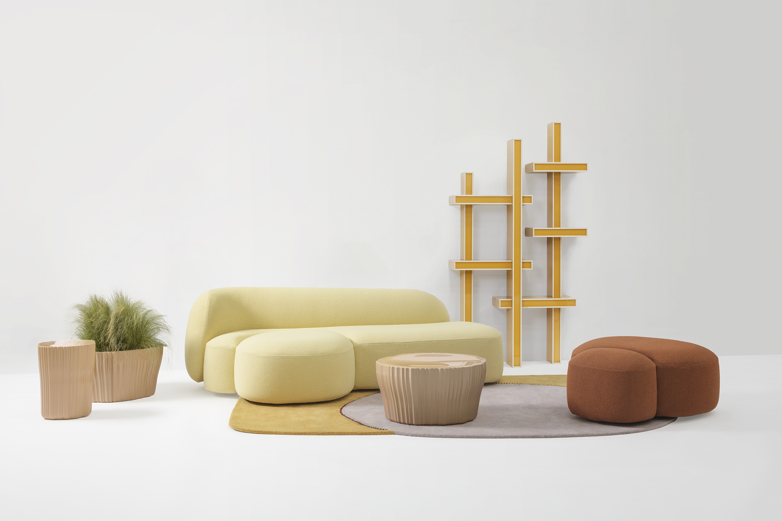 Divani, poltrone e pouf, disponibili in diverse dimensioni, si connettono tra loro in modo organico, dando vita a configurazioni sempre nuove. Nessun elemento vive isolato: ogni modulo contribuisce a un insieme aperto in continua trasformazione che supera l’idea di struttura rigida. Le sedute possono essere spostate e riorganizzate con facilità, rispondendo a esigenze che cambiano nel tempo, invitando all’incontro, al dialogo e a un uso libero dello spazio.
