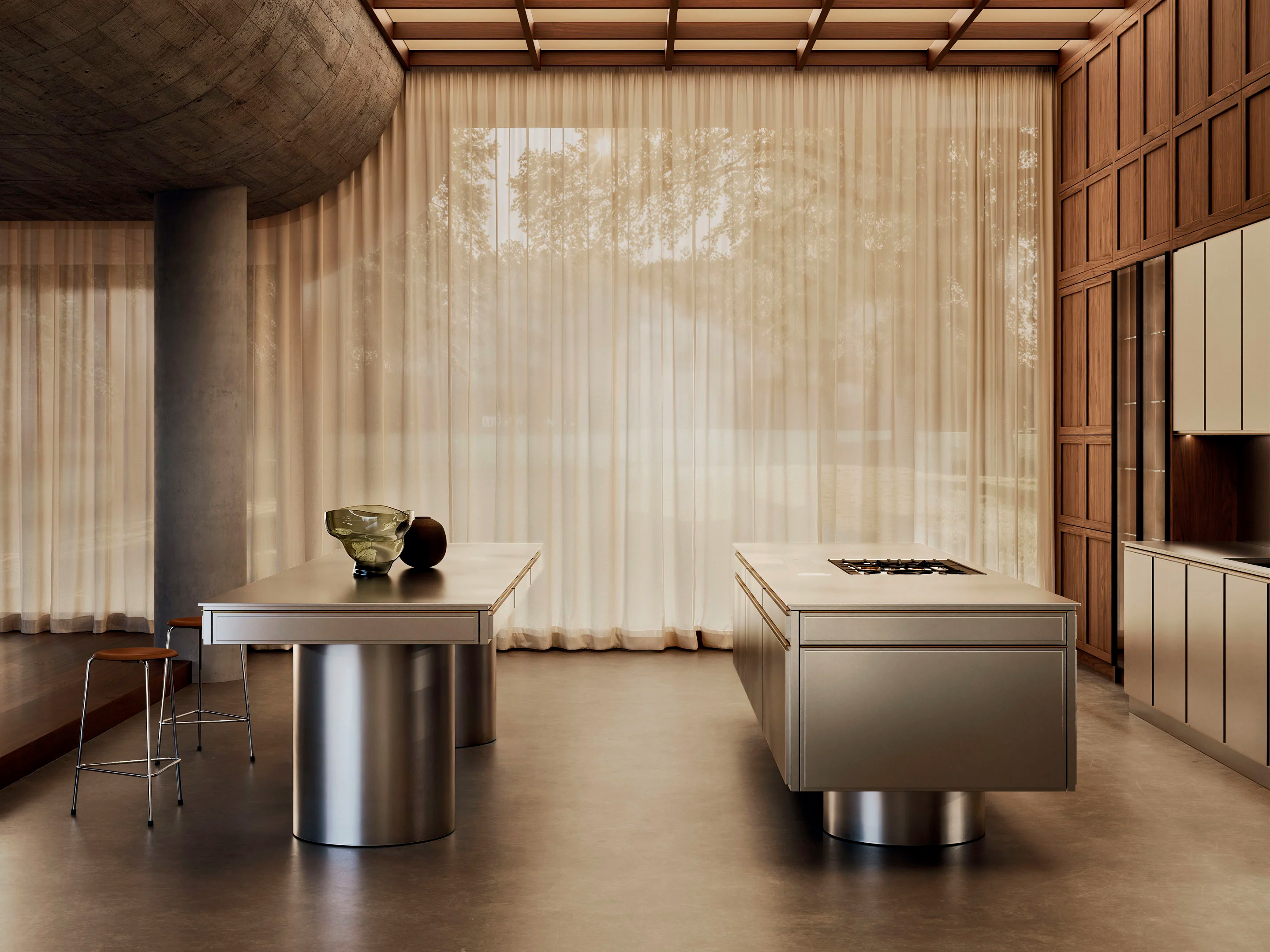 Il metallo in cucina non passa mai di moda, e Virtus di makethatstudio per L’Ottocento lo dimostra. Acciaio vintage spazzolato, opaco, tattile, con ante riquadrate che cambiano faccia a seconda della luce. Un profilo in ottone ammorbidisce i bordi.