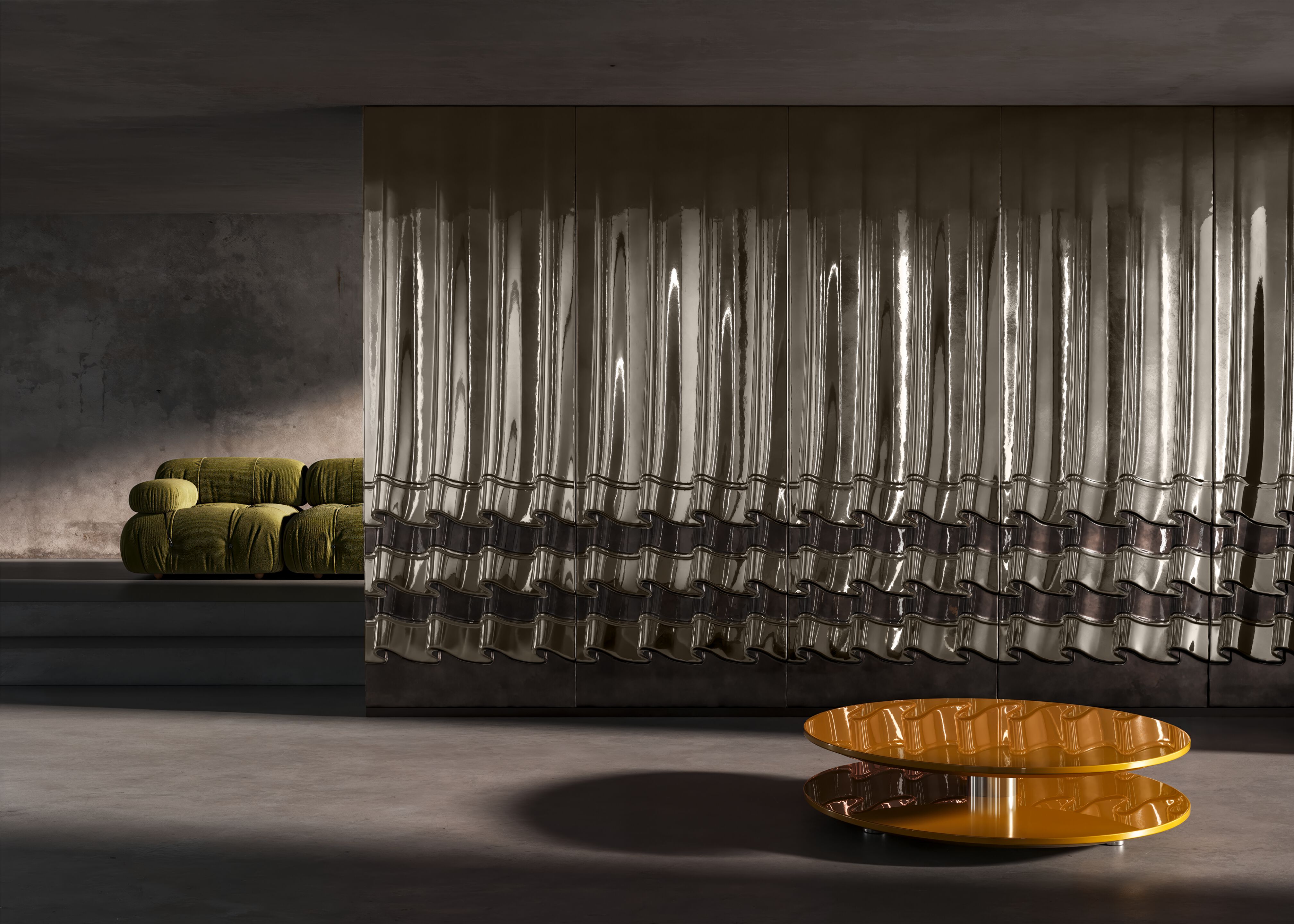 Dall’oggetto alla superficie, il metallo entra in relazione diretta con l’architettura. SIPARIO, la boiserie disegnata da Matteo Cibic per Materica, trasforma la parete in una superficie in movimento ed evoca il mistero di un palcoscenico. La boiserie in alluminio è un trompe-l’œil di pieghe che mutano al variare della luce, come un drappeggio sospeso che riflette e diffonde la luce con variazioni continue.