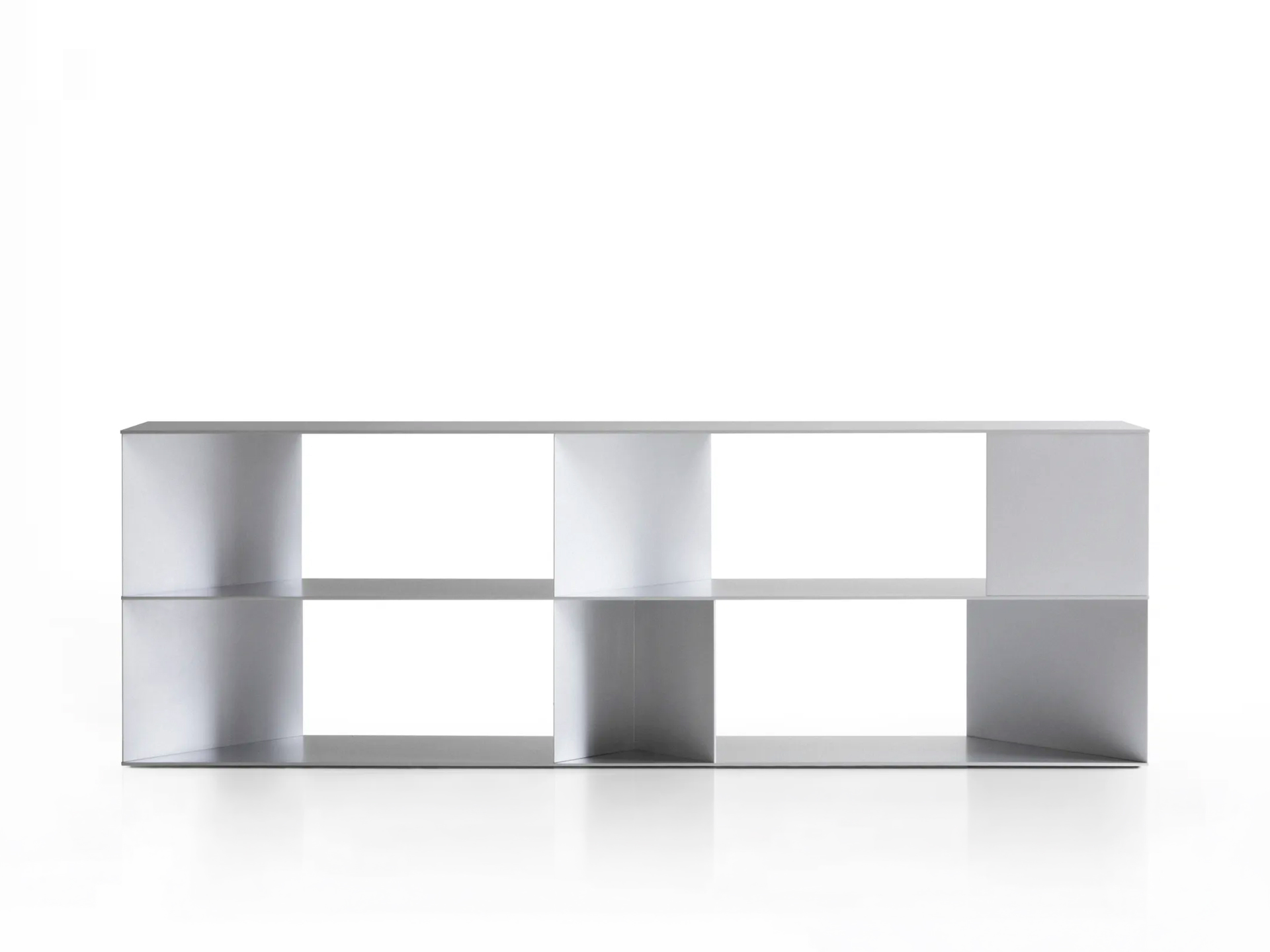 Nao Tamura firma per Porro la libreria Ryo composta da lunghi piani d’appoggio, sorretti da elementi portanti triangolari orientabili ottenuti dalla piegatura di una singola lastra di alluminio. L’oggetto combina funzionalità e impatto visivo, trasformandosi in un elemento che modula luce e ombre sulla sua superficie.