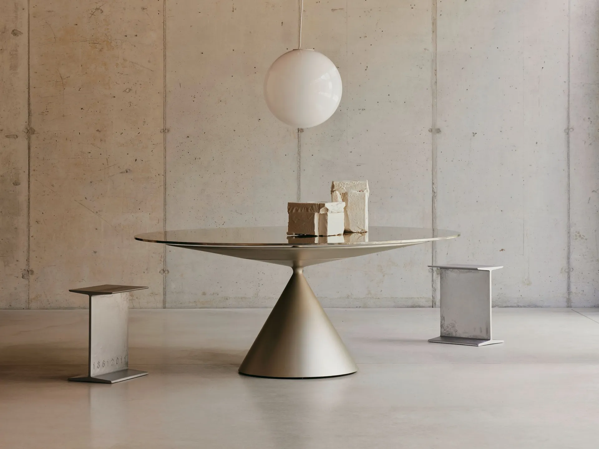 Per il decennale di Clay, Marc Krusin firma Clay Metal per Desalto, in edizione limitata di dieci pezzi. La forma originaria a due coni resta invariata, ma la superficie metallica riflettente trasforma la percezione del volume. L’oggetto appare dinamico e mutevole nello spazio, attivando un gioco continuo tra luce e forma.