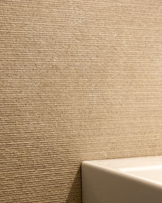 Qui la superficie assume un ruolo silenzioso ma fondamentale, garantendo comfort percettivo, resistenza e continuità estetica con il resto della struttura. Negli ambienti si alternano la superficie naturale (NAT) ed antiscivolo (AS) a pavimento, mentre nel rivestimento a parete si presenta una leggera struttura rigata.