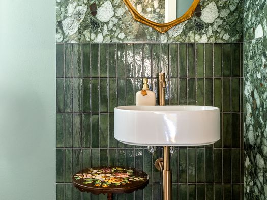 All’interno dei bagni, la collezione Tetris, nella variante Forest in finitura lucida, introduce un segno dall’estetica più decorativa. La sua composizione nella classica posa a muretto con formato da 5x20cm scandisce le superfici verticali con un ritmo naturale e vibrante, rafforzando l’identità degli spazi di servizio e trasformandoli in ambienti curati e dalla forte vitalità. Un’interpretazione del grès porcellanato in cui il colore riveste un ruolo fondamentale: il verde bosco richiama una dimensione organica, in equilibrio tra energia e armonia.