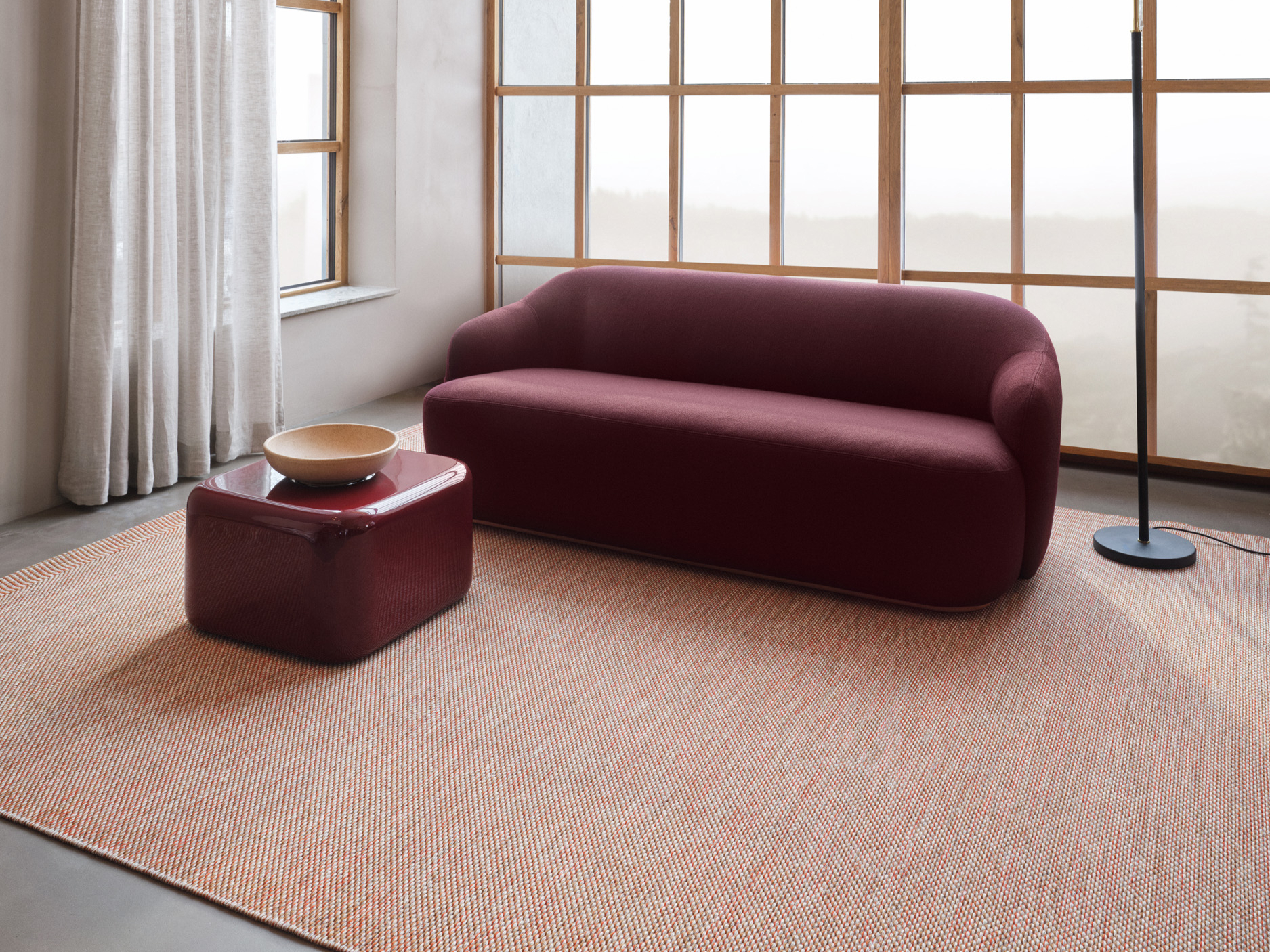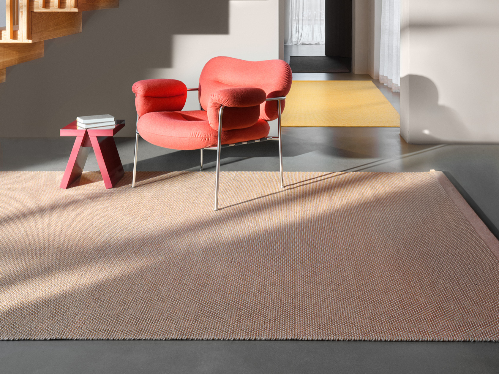 Bonbon propone una tessitura più densa e un carattere vivace. “È espressione di pura gioia” – afferma Jay Osgerby ‐ “Un colore quasi da gustare”. Realizzato nei colori Berry, Rhubarb, Lemon e Damson, il tappeto intreccia filati tono su tono, creando una profondità delicata e avvolgente. Il bordo ad anello, realizzato a tripla navetta, aggiunge una finitura ricercata e tattile, completando l’insieme con un elegante dettaglio sartoriale. Pensato per dare vivacità agli interiors architettonici, Bonbon porta un tocco di giocosità negli spazi personali ‐ o, come suggerisce Barber ‐ sarebbe “il tappeto perfetto per la camera dei bambini”.