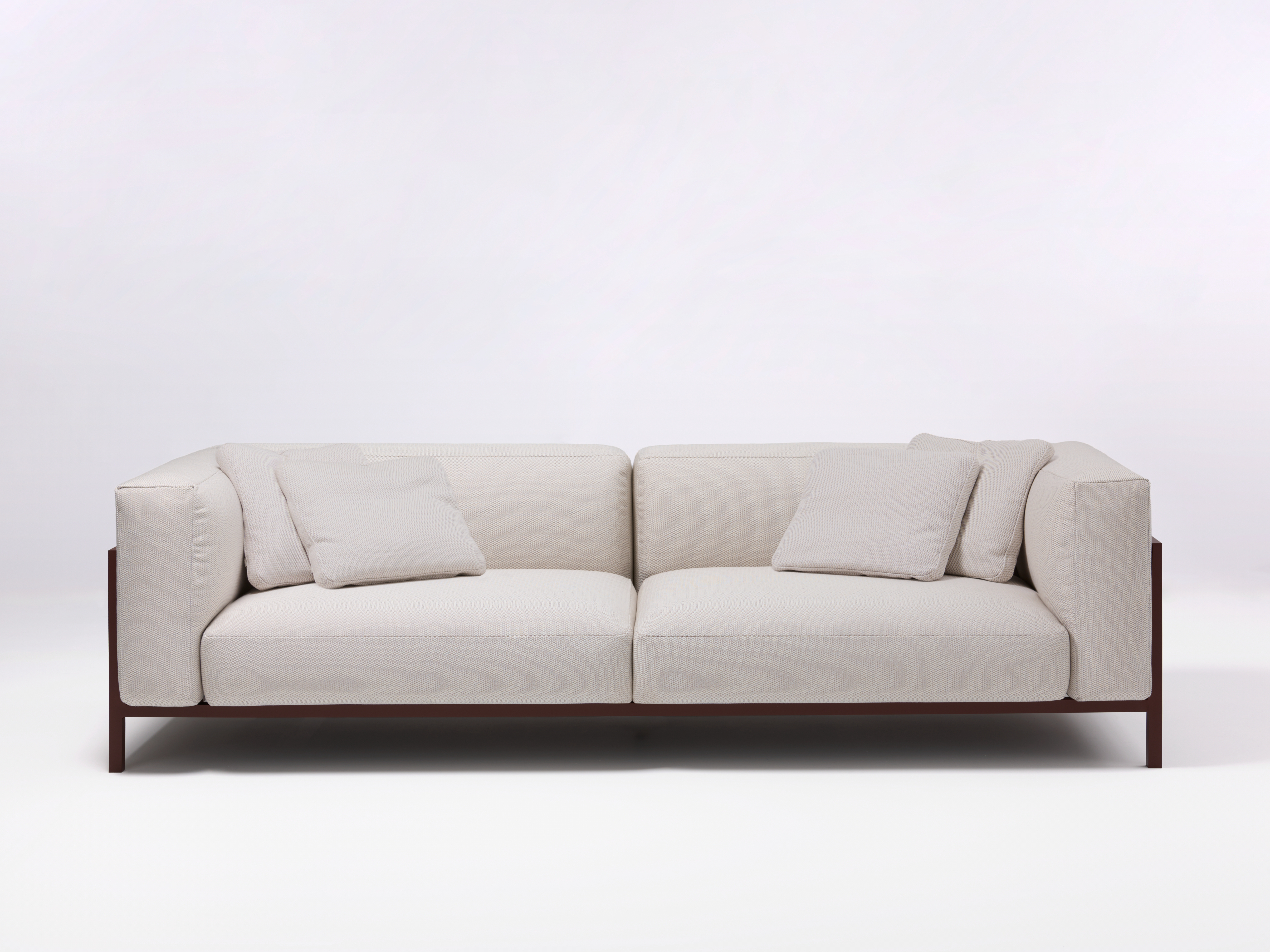 La collezione comprende divani a due e tre posti, poltrone e una gamma di moduli che permettono configurazioni dinamiche, tra cui pouf, elementi centrali, angoli e chaise longue. A questi si affiancano una famiglia di sedute con cuscini nelle versioni lounge, dining large e dining small, dei coffee table coordinati oltre a un lettino con materassino dedicato.