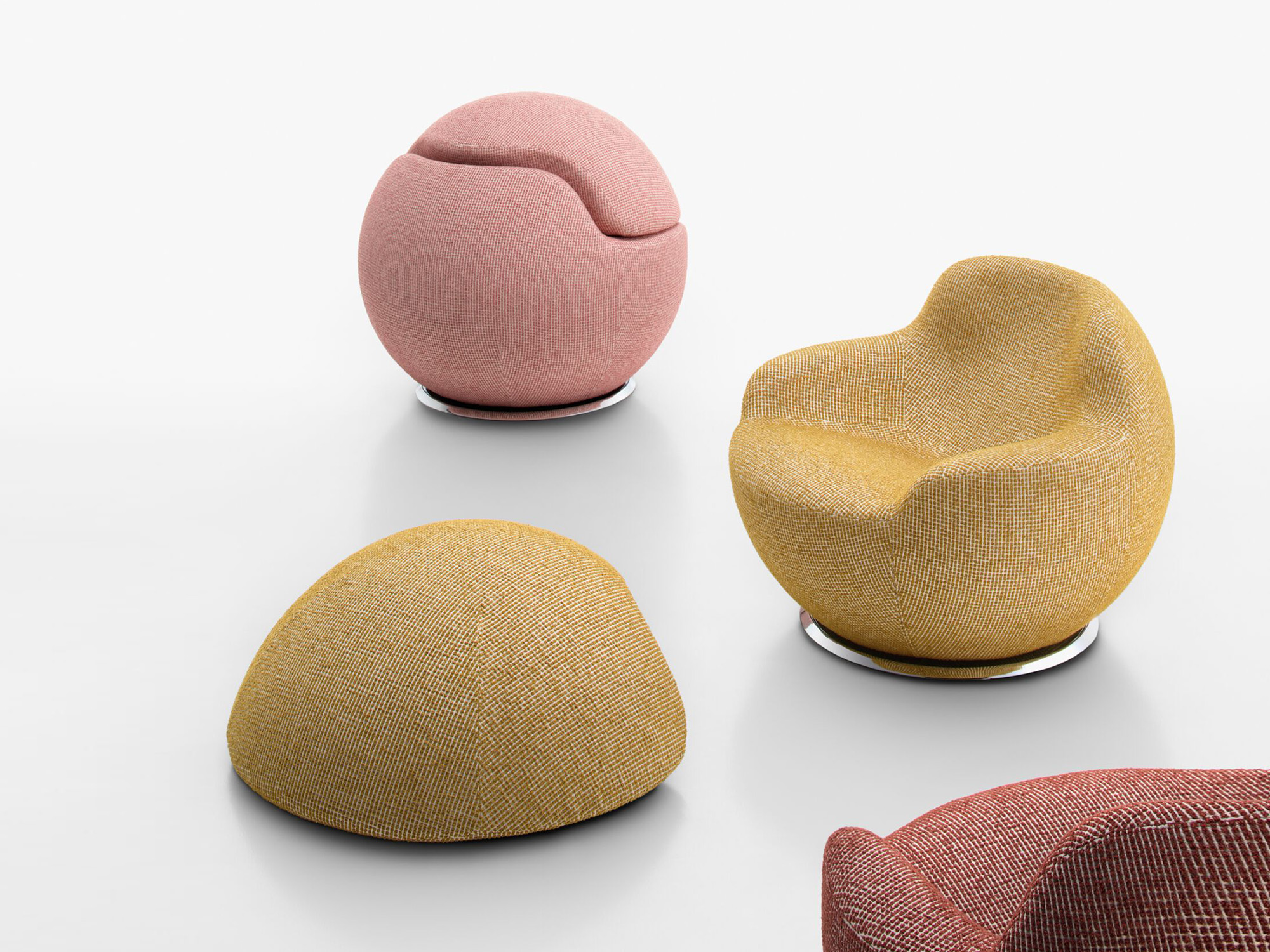 Nella versione Palla Round About Seventies, la poltrona è rivestita con il tessuto Brionne di Torrilana, riedizione di un tessuto storico degli anni Settanta. Una palette pop, fatta di contrasti netti e ritmo cromatico, che dialoga con i volumi generosi della poltrona. Brionne segue le forme di Palla, le sottolinea e le rende ancora più espressive, trasformando la morbidezza in un segno grafico deciso.
