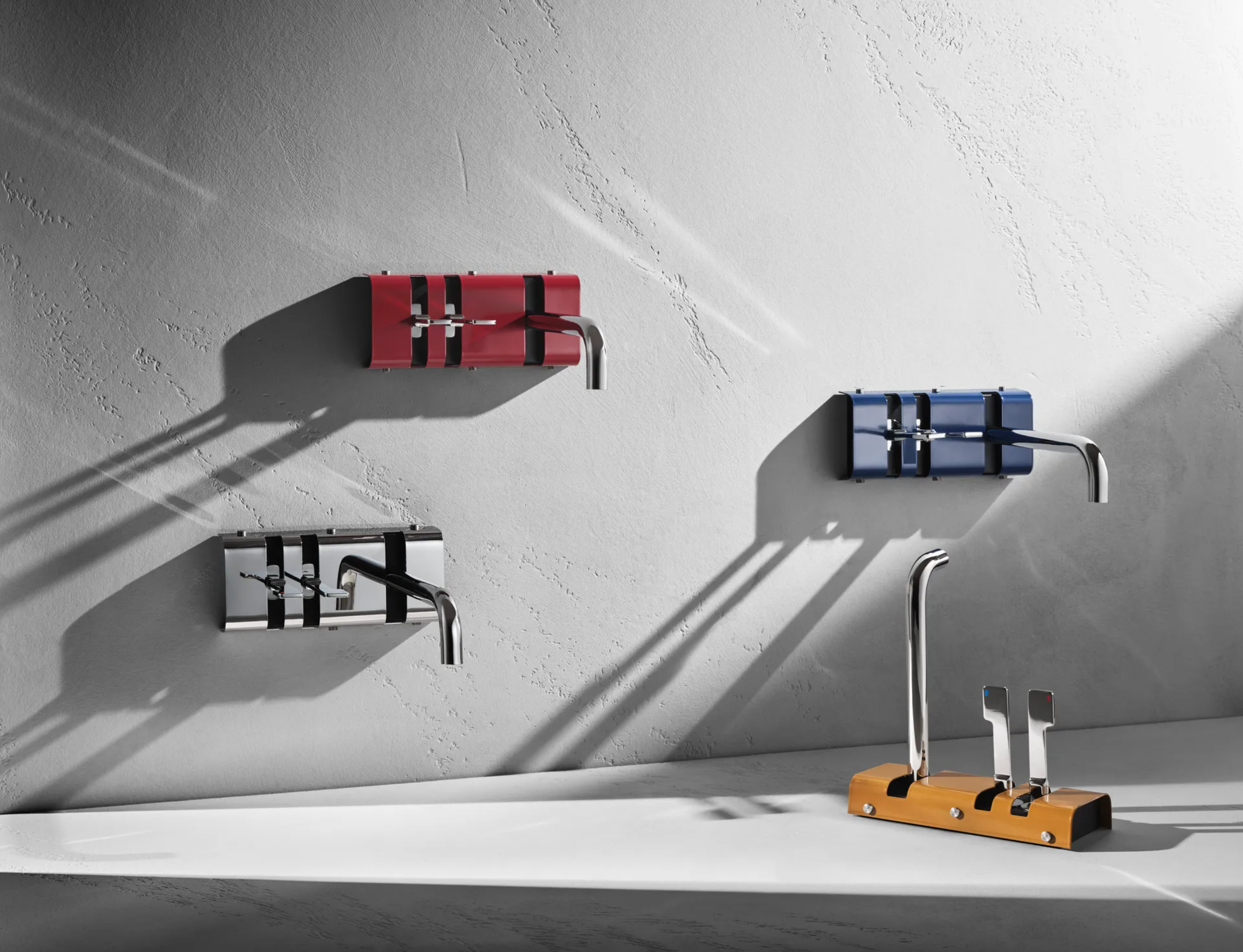 La collezione Joe Colombo nasce da due progetti iconici del designer: Visiona 1 (realizzato per Bayer a Colonia nel 1969) e Total Furnishing Unit (presentato alla mostra Italy: The New Domestic Landscape al MoMA di New York nel 1972). La collezione è attraversata dal colore, in tonalità sature e vibranti: il cromo viene affiancato da Giallo Mustard, Rosso Scarlet e Blu che colorano manopole e carter in modo deciso.