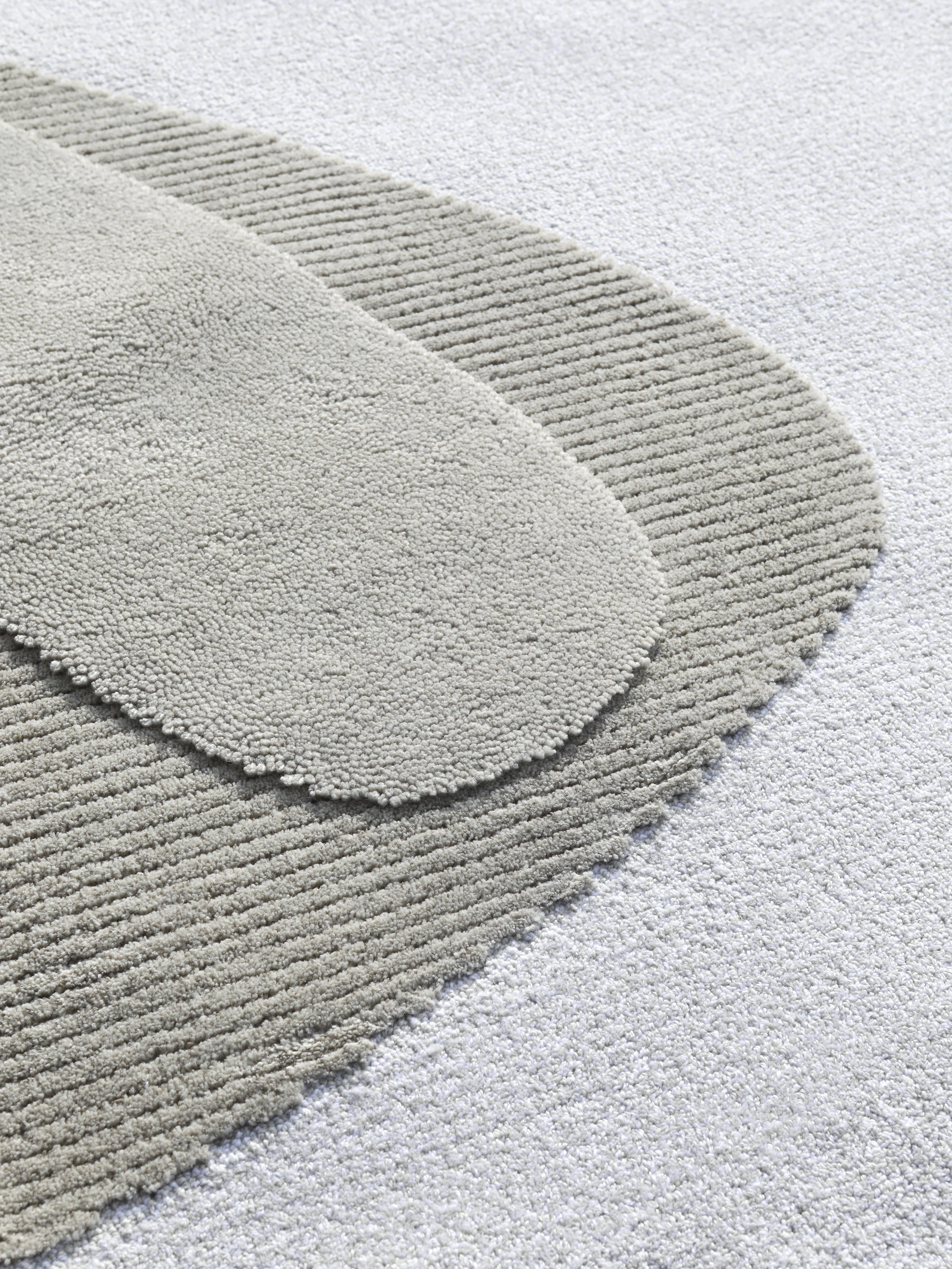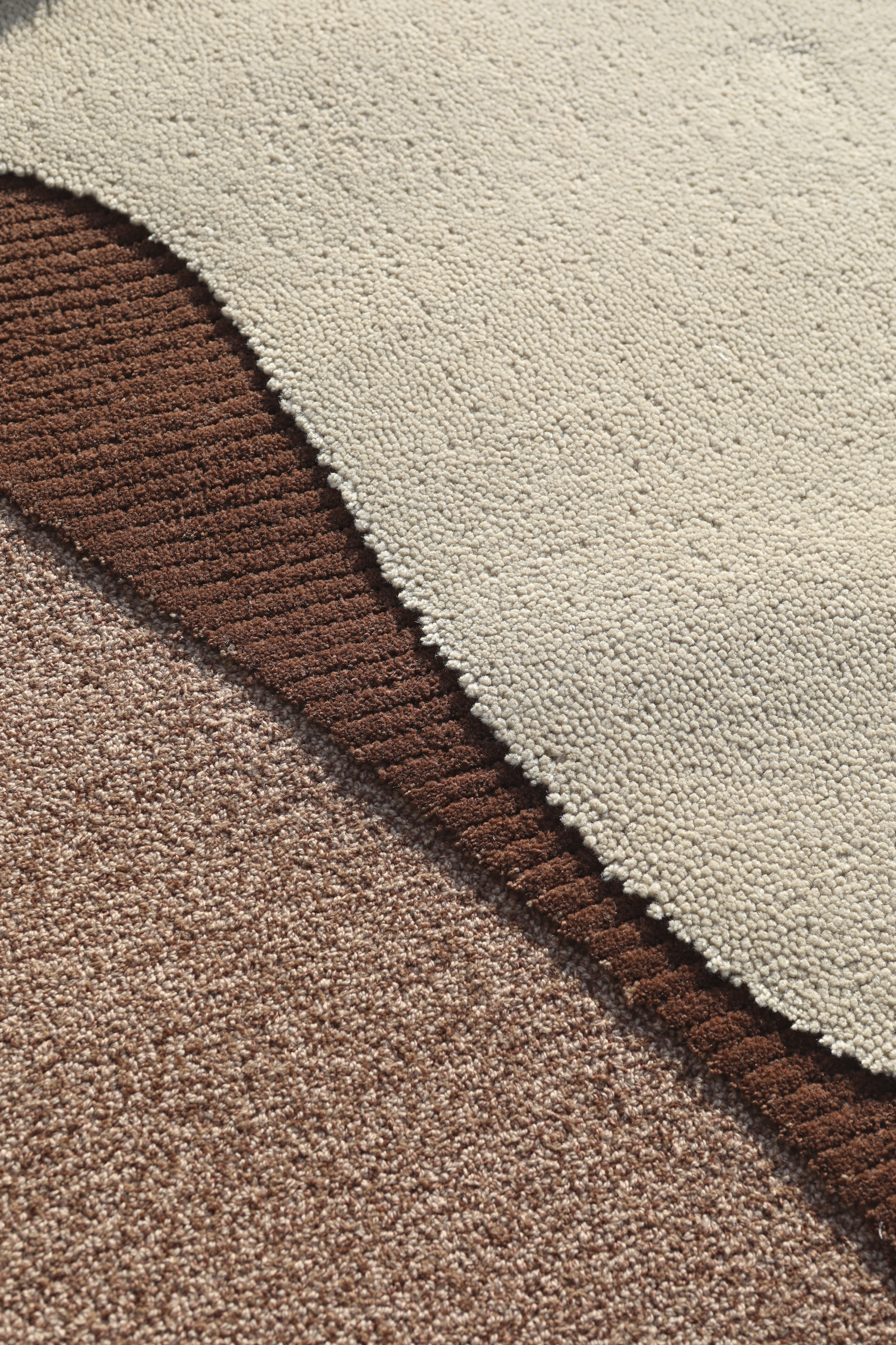 Per raggiungere questo risultato la ricerca materica è stata parte significativa del progetto: l’impiego di Lana Nuova Zelanda, Lana Nuova Zelanda Felted, Lana Nuova Zelanda Hardtwist e Lino crea un equilibrio tra struttura e morbidezza, mentre le variazioni di altezza (10 mm velluto/bouclé, 10 mm bouclé, 14 mm velluto, 20 mm velluto, 40 mm peloso) riproducono i diversi livelli del paesaggio lagunare, generando rilievi che amplificano la percezione tattile e visiva. Ogni tappeto diventa, così, un “atollo” profondamente evocativo e carico di significato da immaginare “in uno spazio che permette alle superfici di respirare, di essere percorse tattilmente, per apprezzare le emersioni dei livelli”, conclude Marco Zito.