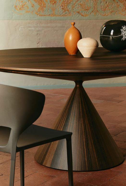 Le nuove finiture in legno introducono una dimensione più calda e tattile al progetto. Il tavolo-scultura viene ora realizzato attraverso l’applicazione di segmenti di legno disposti con estrema precisione, in una perfetta sintesi fra tradizione artigianale e qualità industriale Desalto.