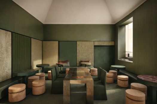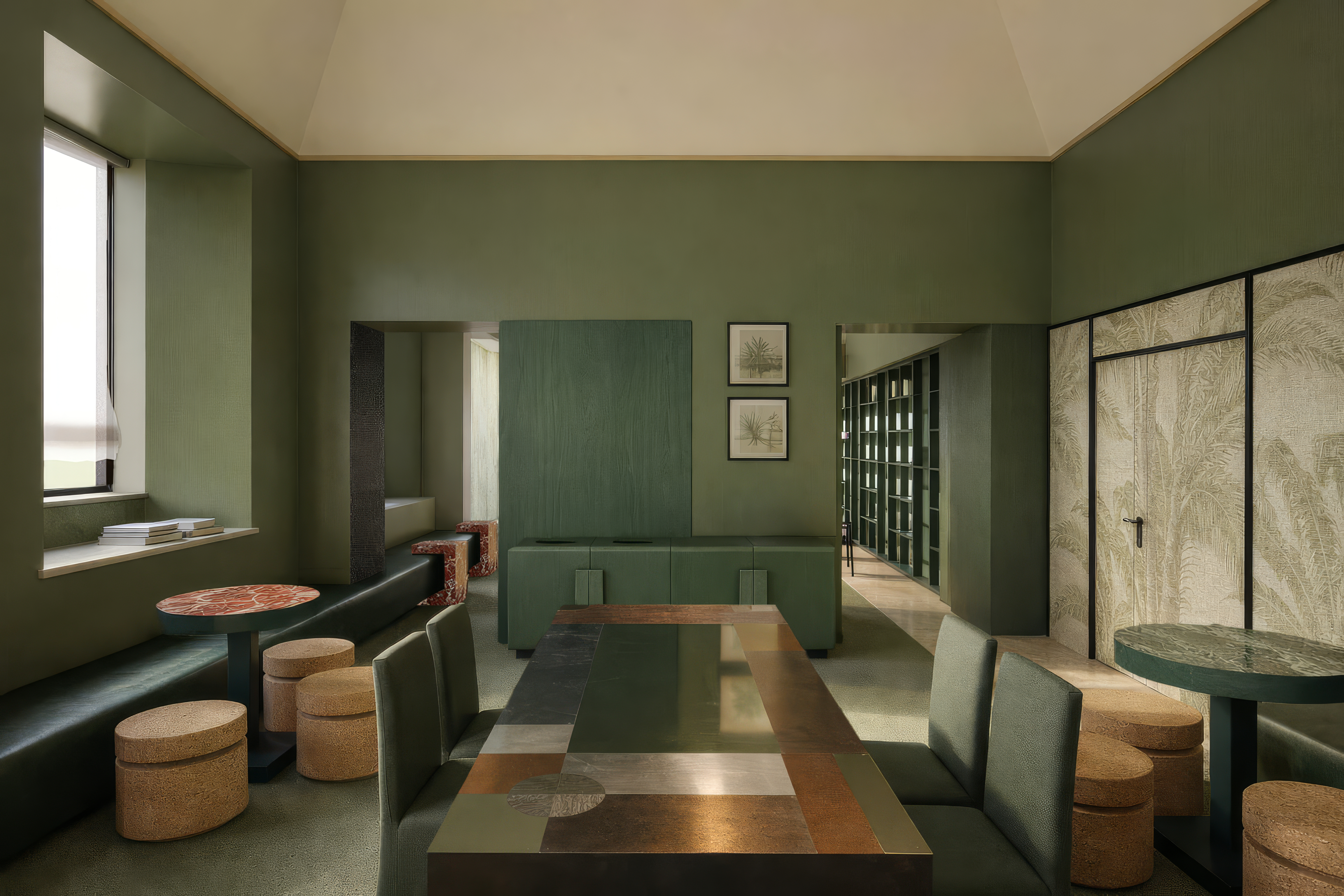 All’interno del progetto, dove superfici diverse dialogano attraverso il colore e la percezione tattile, le carte da parati Jannelli&Volpi contribuiscono a definire l’identità dello spazio. I wallcovering delle collezioni JV 106 Amazzonia e JV 604 Penelope, nella tonalità del verde, animano le pareti con effetti materici e profondità visiva, trasformandole in superfici espressive capaci di dialogare con gli altri materiali dell’allestimento.