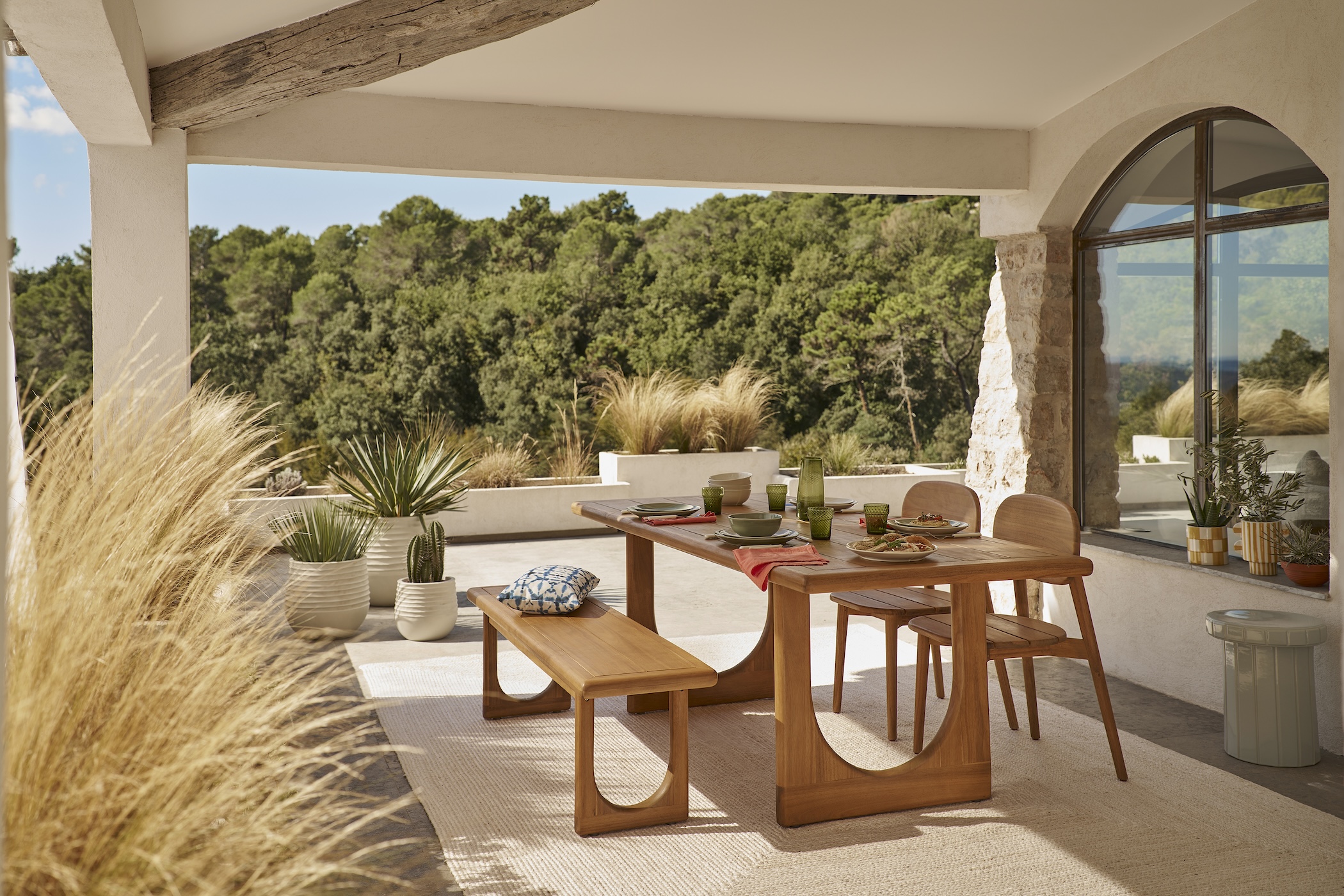 Prodotto rappresentativo dell’approccio de La Redoute è il dining table Douve, reinterpretato oggi in versione outdoor.  Realizzato in acacia massiccia, la sua estetica scultorea rilegge in chiave contemporanea i tavoli tradizionali di conventi e abbazie. Il top spesso con bordi arrotondati - qui scanalato per favorire il deflusso dell'acqua - dialoga con la base ad arco rovesciato, tra solidità strutturale e leggerezza visiva.