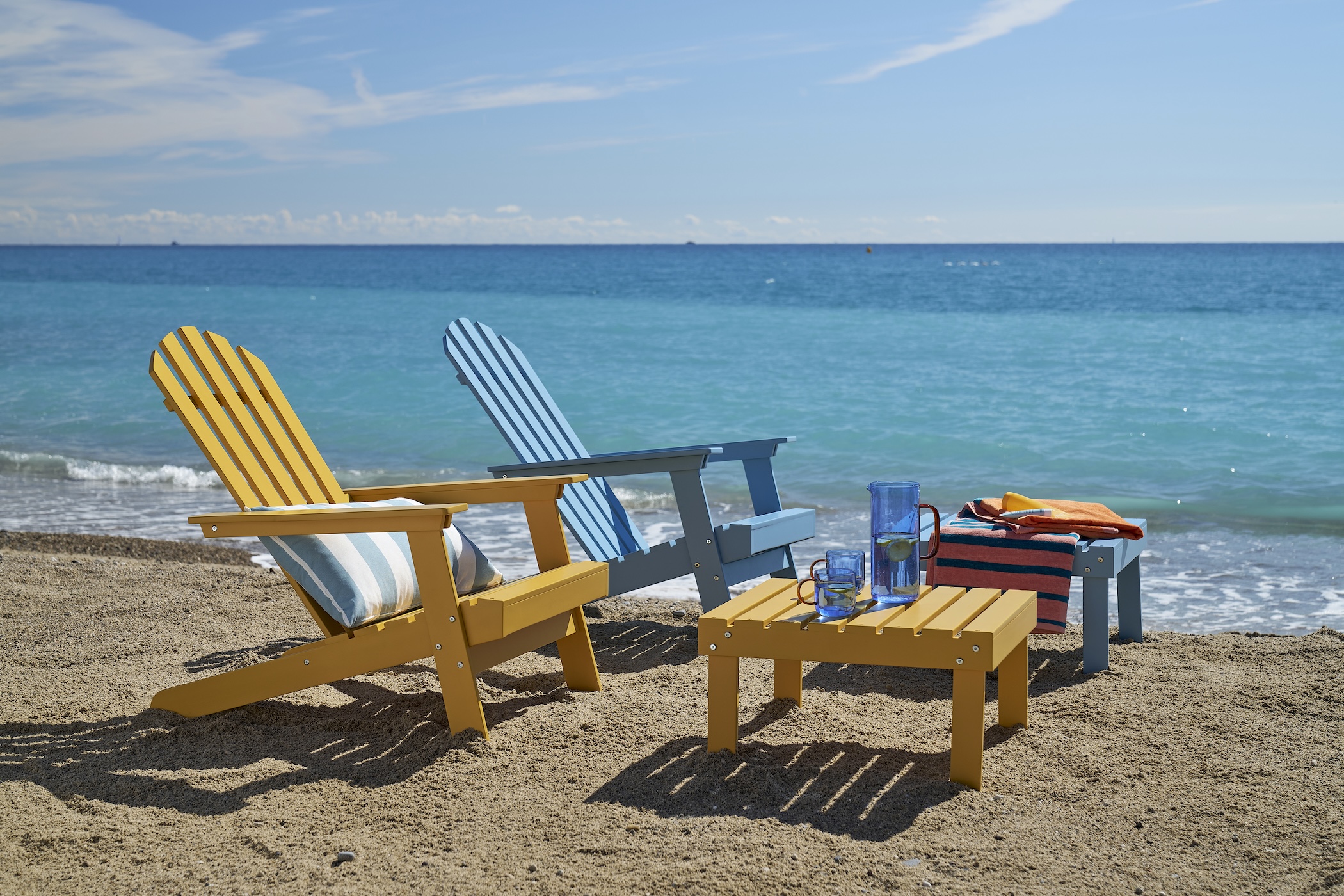 Zeda è un set da giardino composto da poltrona e tavolino in legno verniciato: arredi agili e pieghevoli disponibili nelle tonalità fresche e luminose del giallo e dell’azzurro, ideali per favorire il relax e la convivialità nelle giornate più soleggiate.
