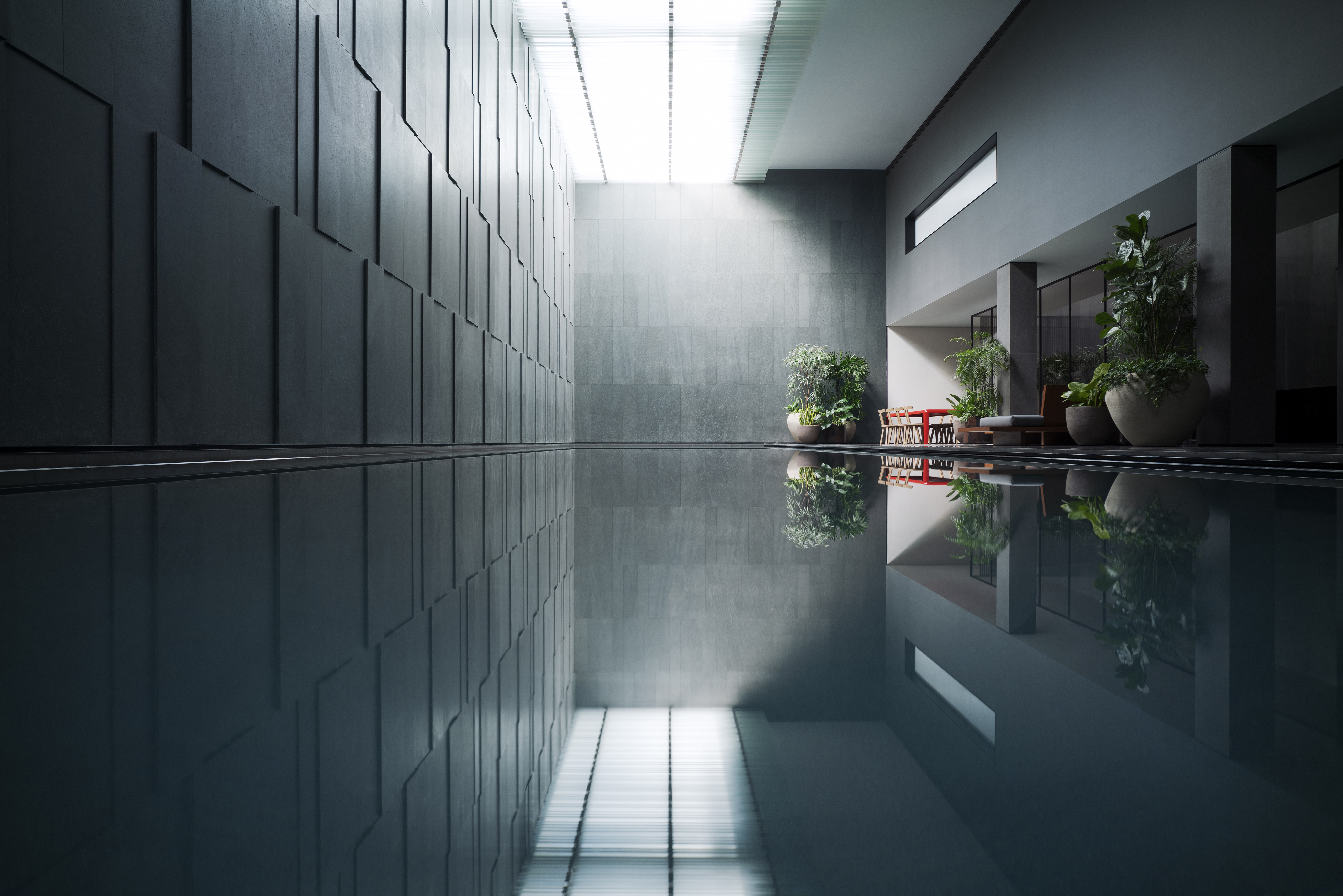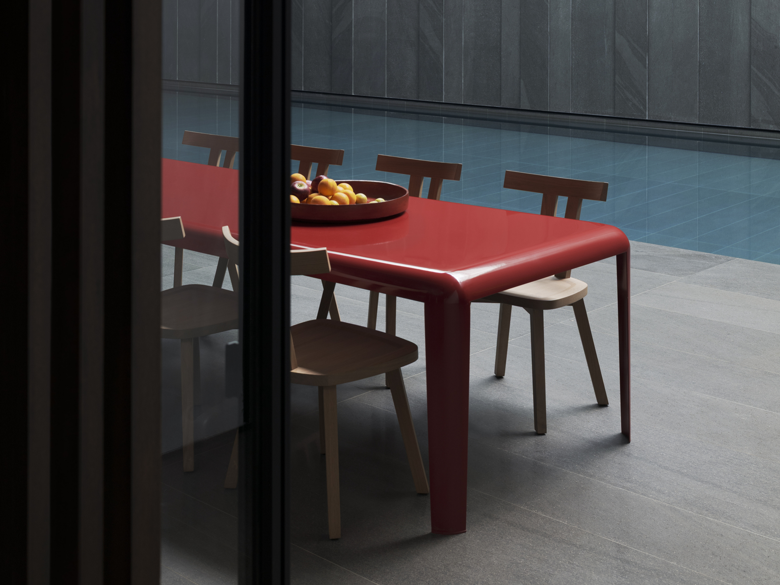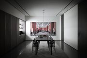 Nel basement, affacciato sulla piscina, il tavolo Ferro di Piero Lissoni per Porro, è proposto in una inaspettata versione verniciata in rosso, in netto contrasto con i toni di grigio scelti per l’architettura. Con la sua silhouette aerodinamica ispirata alle ali di un aereo, l'arredo amplifica l’effetto scenografico dell'ambiente.