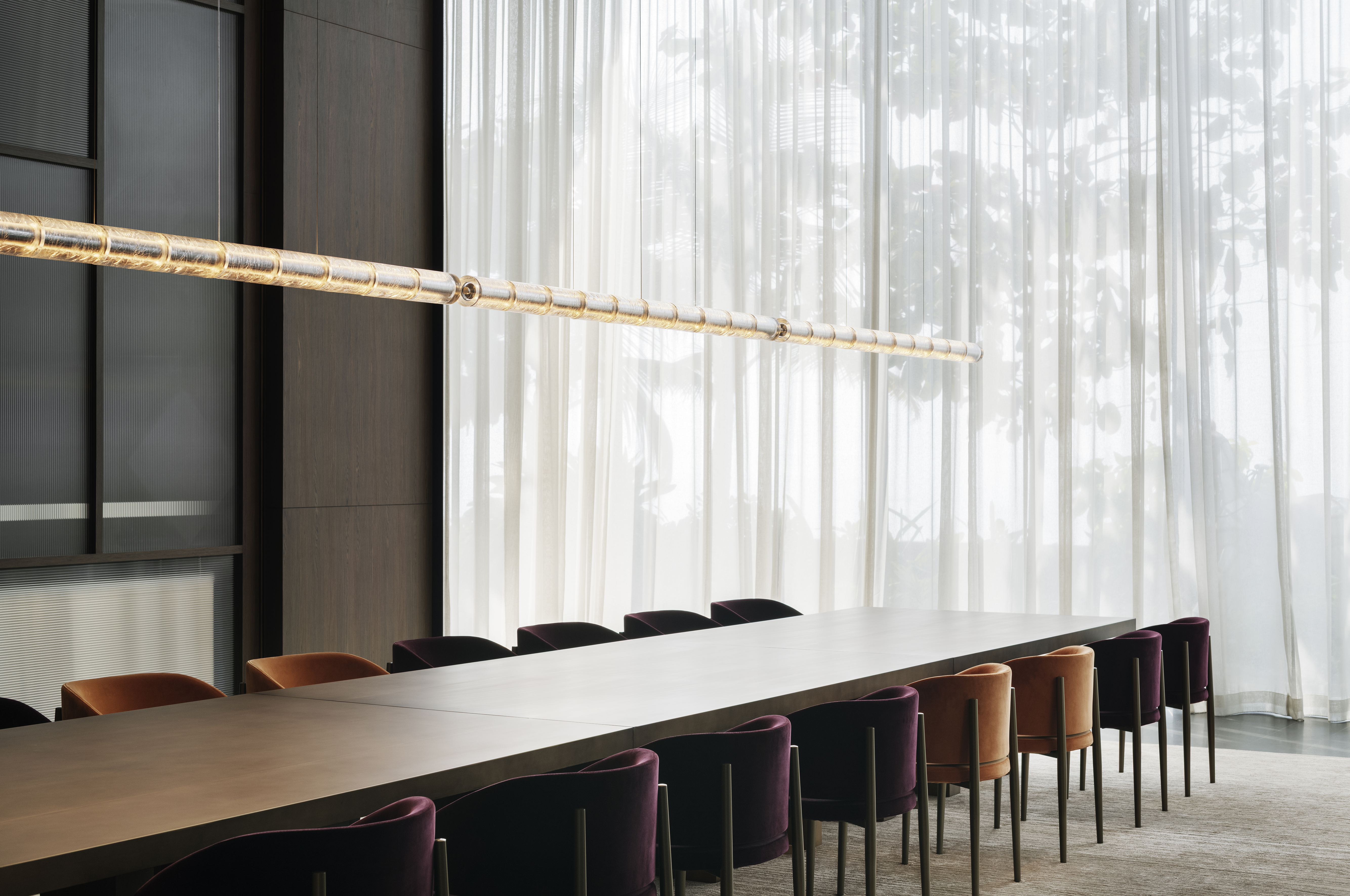 Al piano terra nella sala da pranzo per eventi, attorno ad un lungo tavolo su misura trovano posto le poltroncine Frank di Piero Lissoni, interpretate in toni bordeaux e arancio scuro. Ispirate al design francese, uniscono in un unico segno armonico tre elementi distintivi: schienale a conchiglia, struttura in metallo e seduta imbottita.