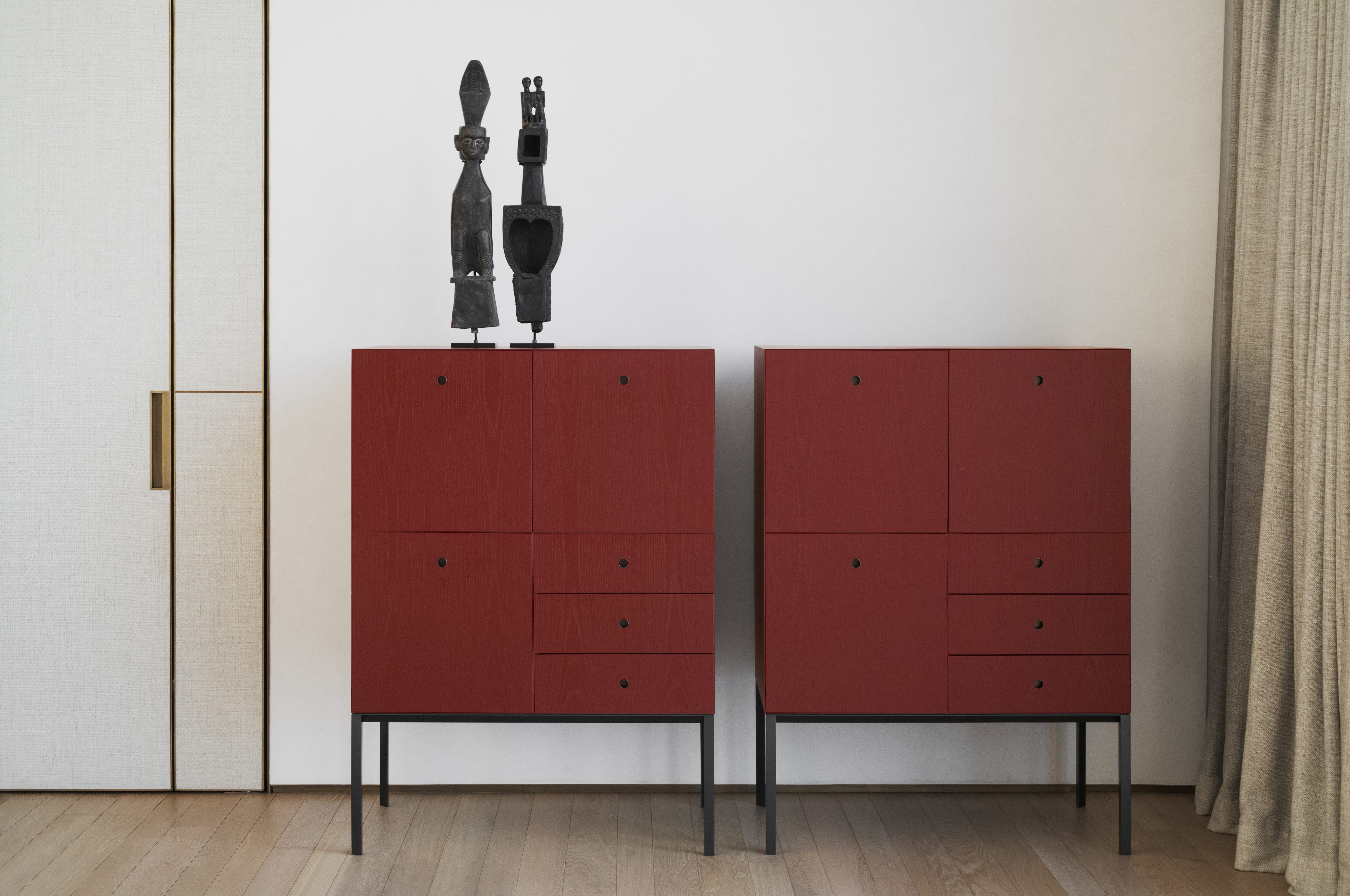 La madia alta Offshore di Piero Lissoni in frassino tinto rosso cina con interni in acero naturale e gambe triangolari si impone come totem domestico nella stanza da letto: l'arredo Porro è qui proposto nella versione con 3 ante e 3 cassetti.