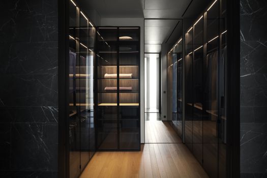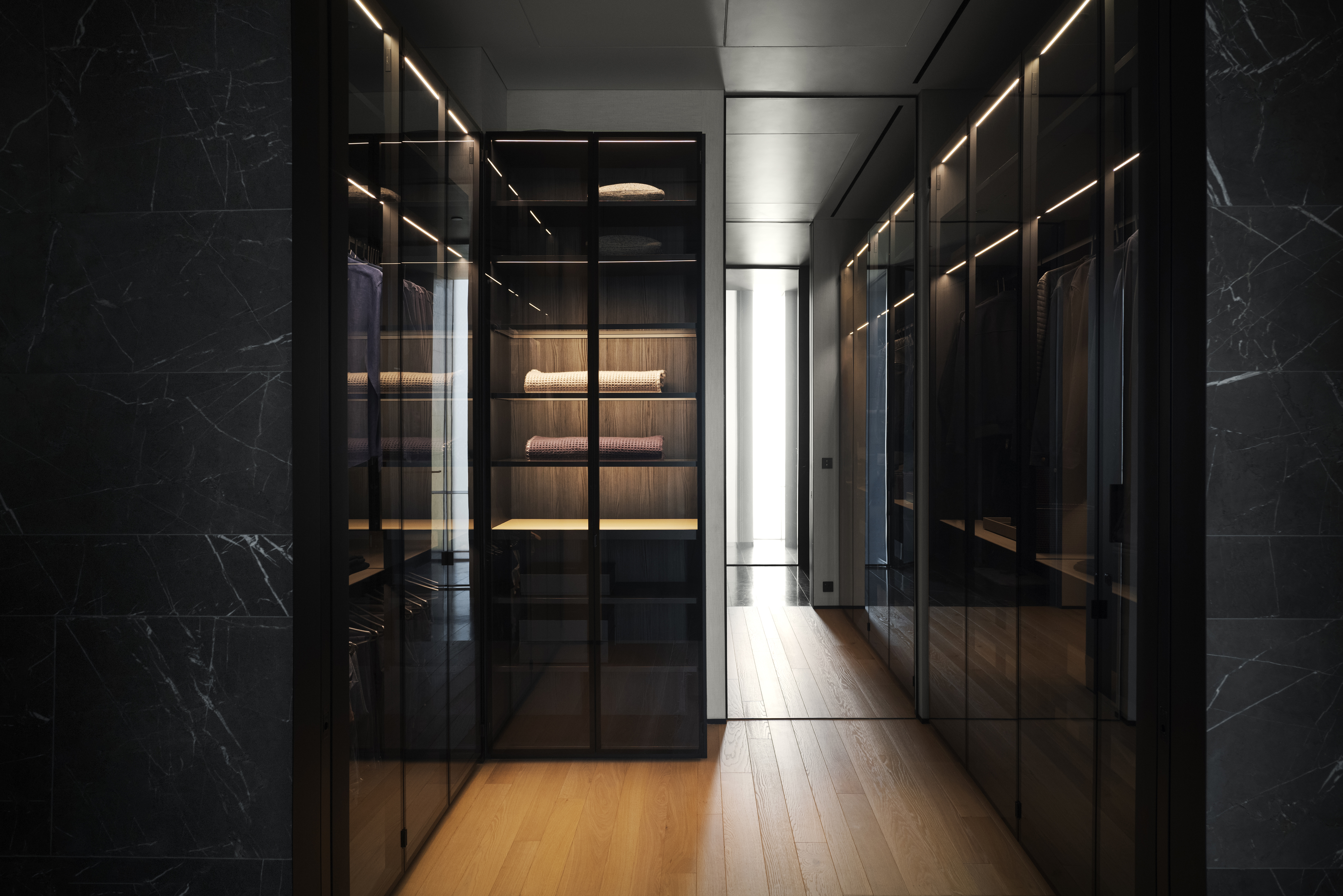 Al quinto piano, riservato ai proprietari, il sistema di armadi e cabine armadio firmato da Piero Lissoni + CRS Porro diventa un palcoscenico per gli abiti in un gioco di luci e ombre. Proposto nella vasta dressing room in diverse configurazioni e finiture, in parte con ante chiuse a specchio e retro color cioccolato, in parte nella sensuale finitura eucalipto, coniuga funzionalità, estetica e leggerezza visiva.