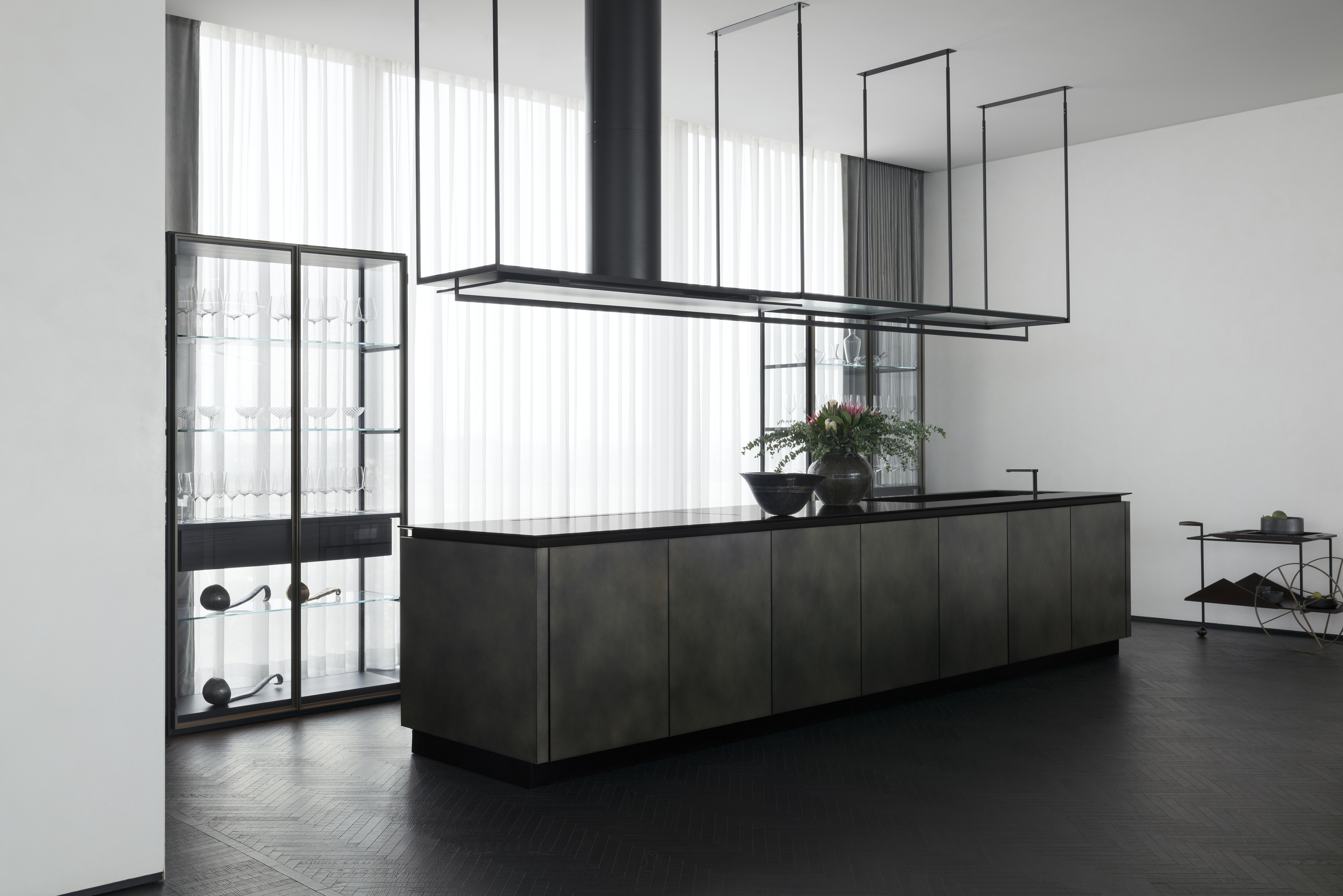 Al servizio della cucina al sesto e ultimo piano, due vetrine Ex-Libris di Piero Lissoni con ante Iron in cristallo trasparente e telaio in ottobre brunito, top e base in melamminico black sugi, fungono da contenitore, esaltando il contenuto come in un’installazione museale.