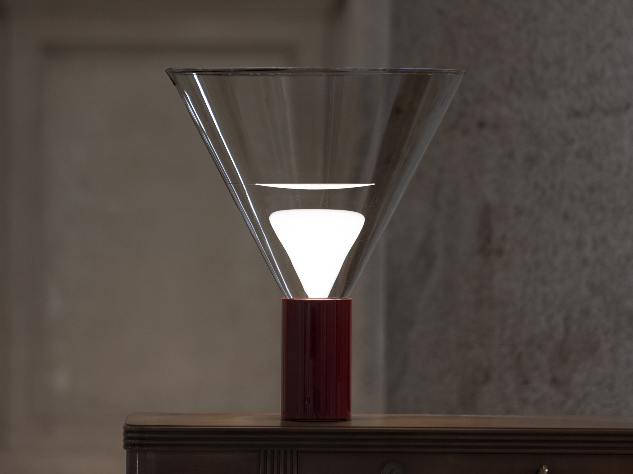 In occasione della mostra viene presentata VERA, Limited Edition in finitura amaranto laccato a tiratura limitata per Volumnia. In VERA, la lampadina è un ologramma che appare all’accensione. Un gioco di prestigio per una lampada da tavolo che genera luce diretta, indiretta e diffusa. Una sintesi di geometrie: il cono è in vetro trasparente, la base è un cilindro in alluminio che abbandona le finiture naturali, per vestirsi di un rosso laccato vibrante, il riflettore garantisce una qualità della luce molto alta.