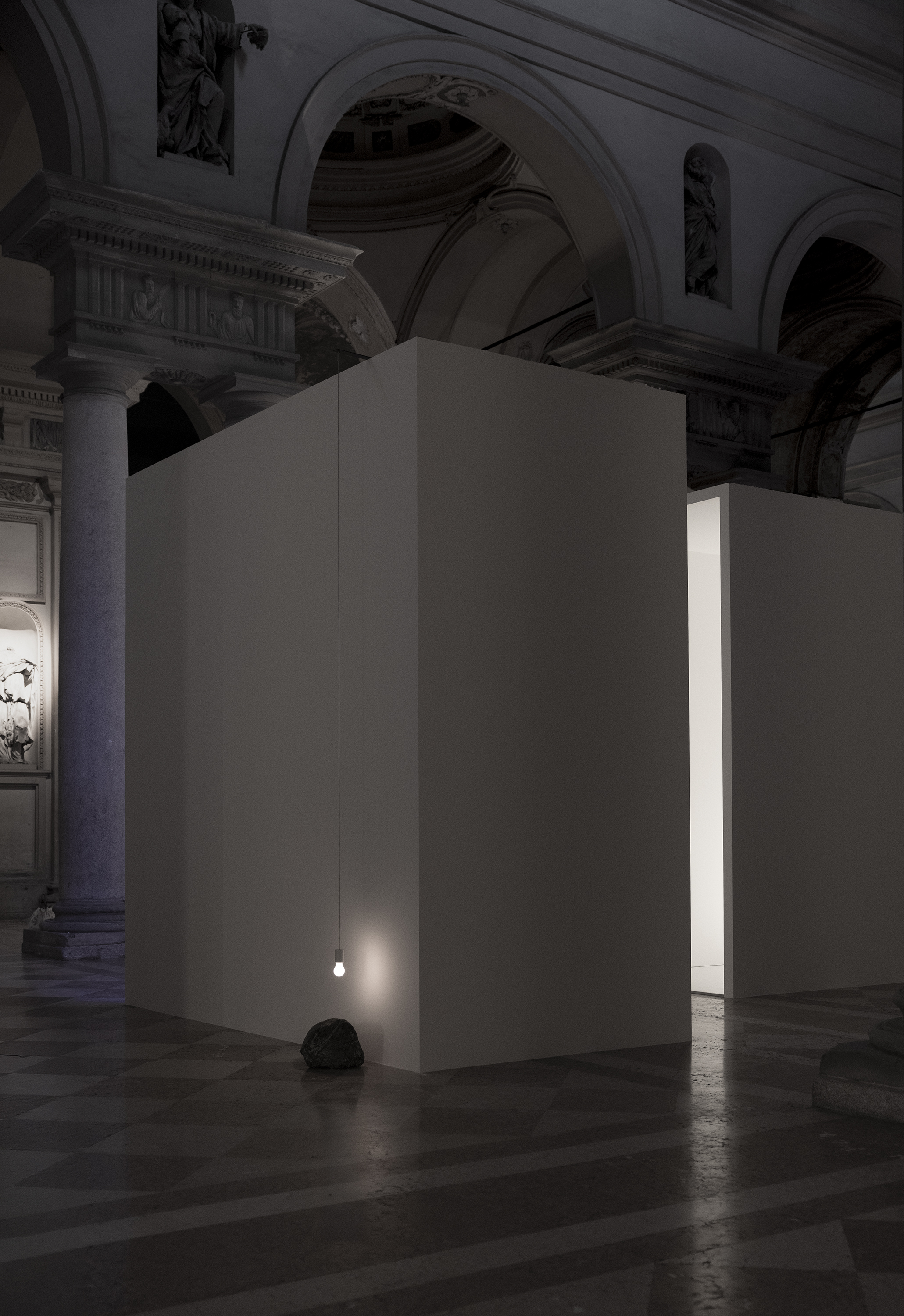 Gli spazi sono neutri, spesso valicabili, e all’interno di essi le lampade sono come fiaccole, cadono nello spazio, costruendo un percorso che prosegue fino a guadagnare inediti dialoghi con la storia, quella evocata dai tesori di Volumnia, che, in questa occasione, sono sorpresi dall’agguato luminoso dei progetti che hanno puntellato la carriera di Davide Groppi.