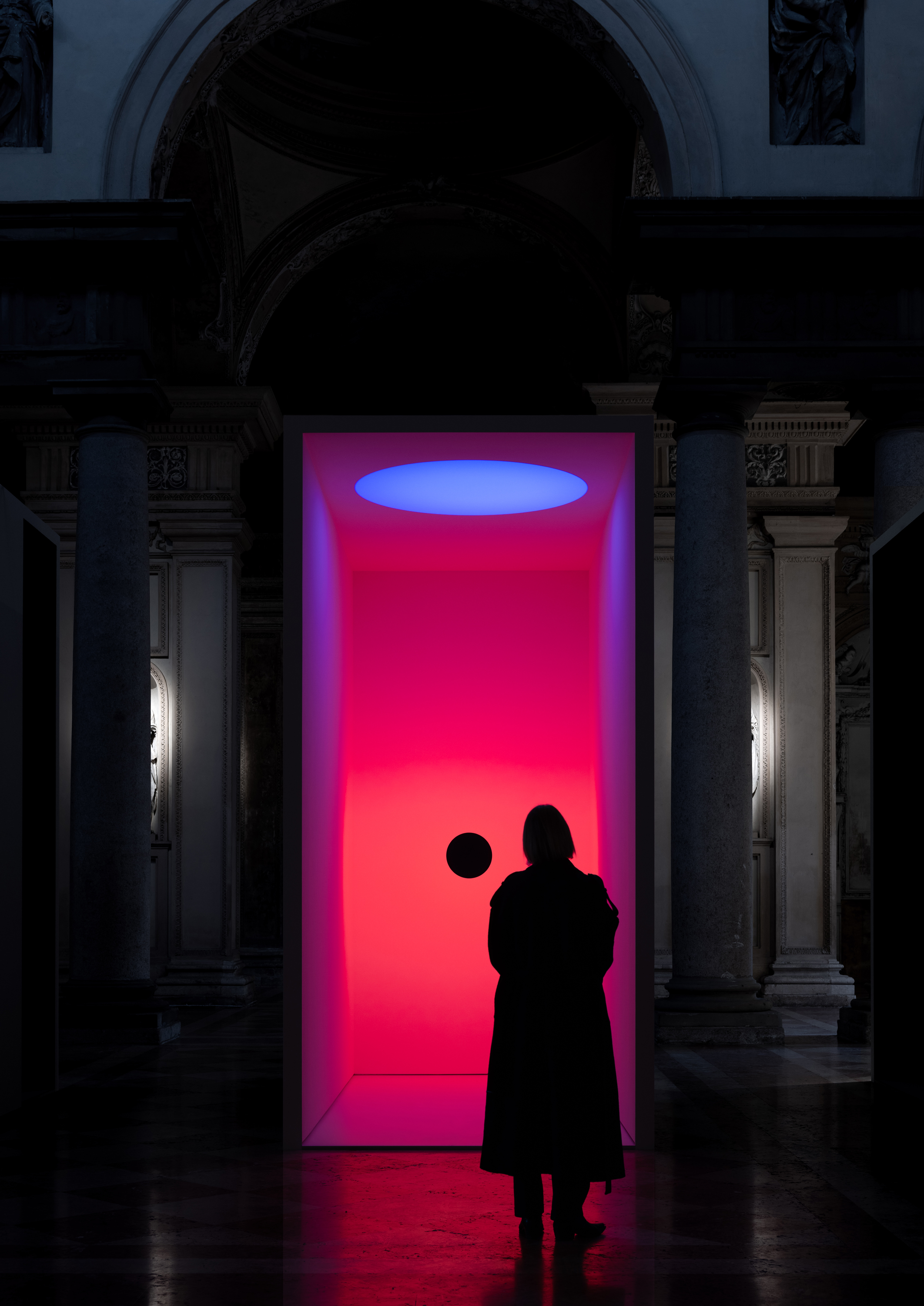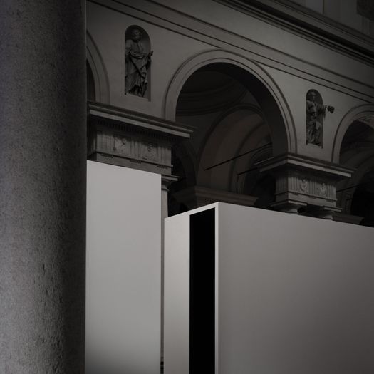 L’allestimento disegnato per la mostra si estende lungo la navata principale della chiesa di Sant’Agostino. Groppi suddivide il percorso espositivo con volumi metafisici che scandiscono lo spazio, inserendosi nell’ospitalità di Volumnia insieme alla fondatrice Enrica De Micheli, il luogo restituito alla città dalla fondatrice Enrica De Micheli e già illuminato dal designer stesso nel 2018.