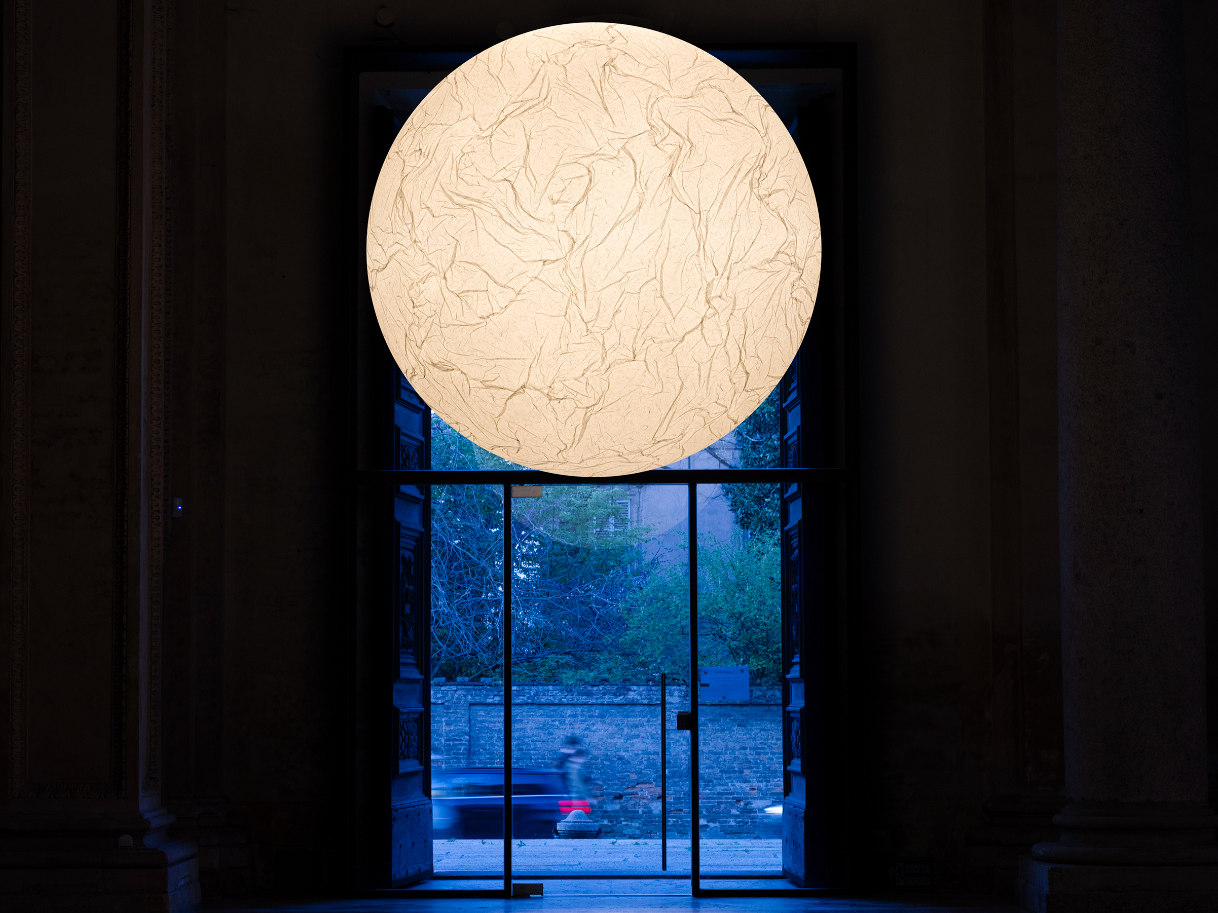 L’ingresso della mostra è una soglia dove la lampada MOON segna il confine tra interno ed esterno, è una cerniera che annuncia uno stradone di architetture bianche, geometriche.