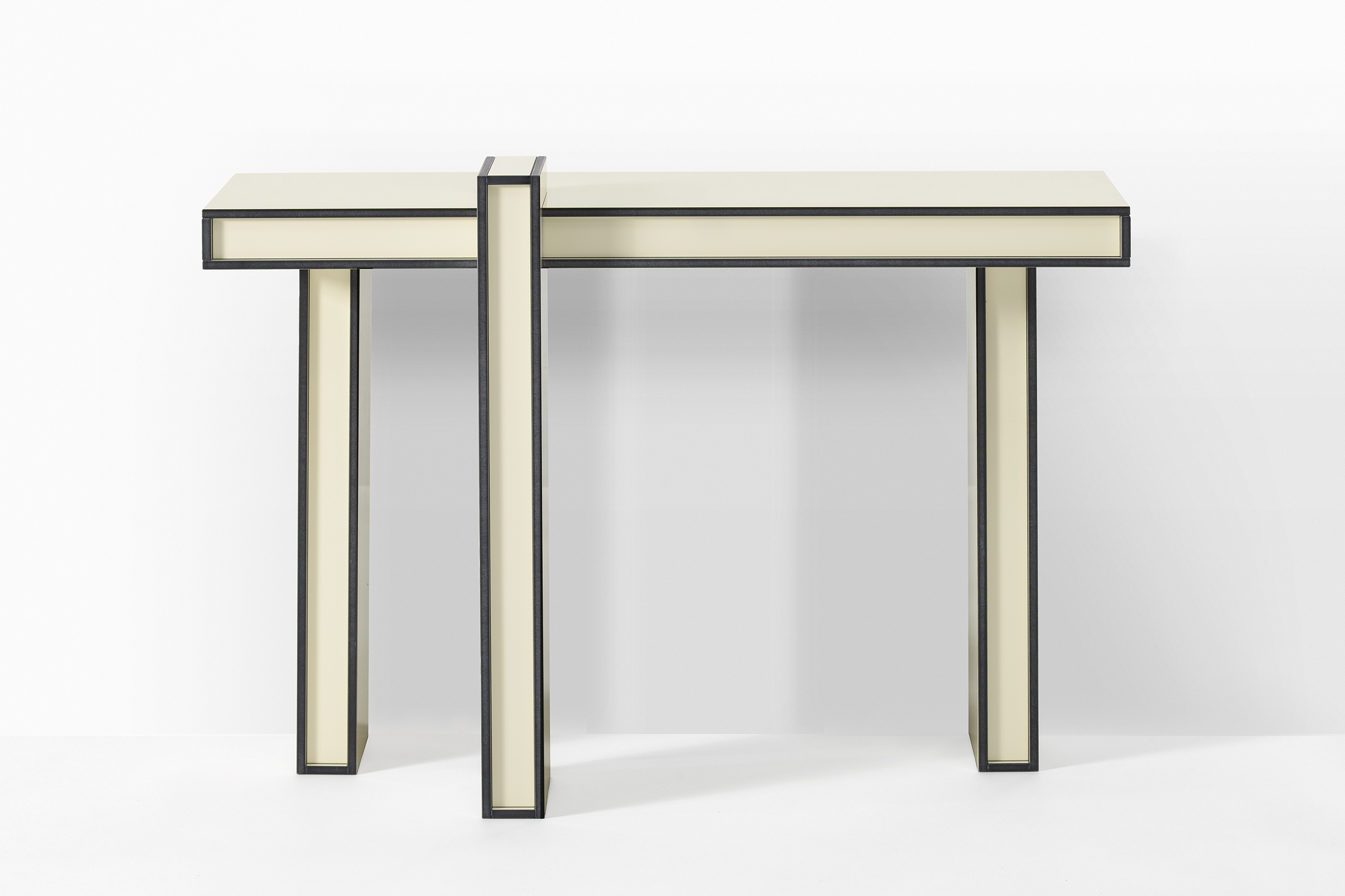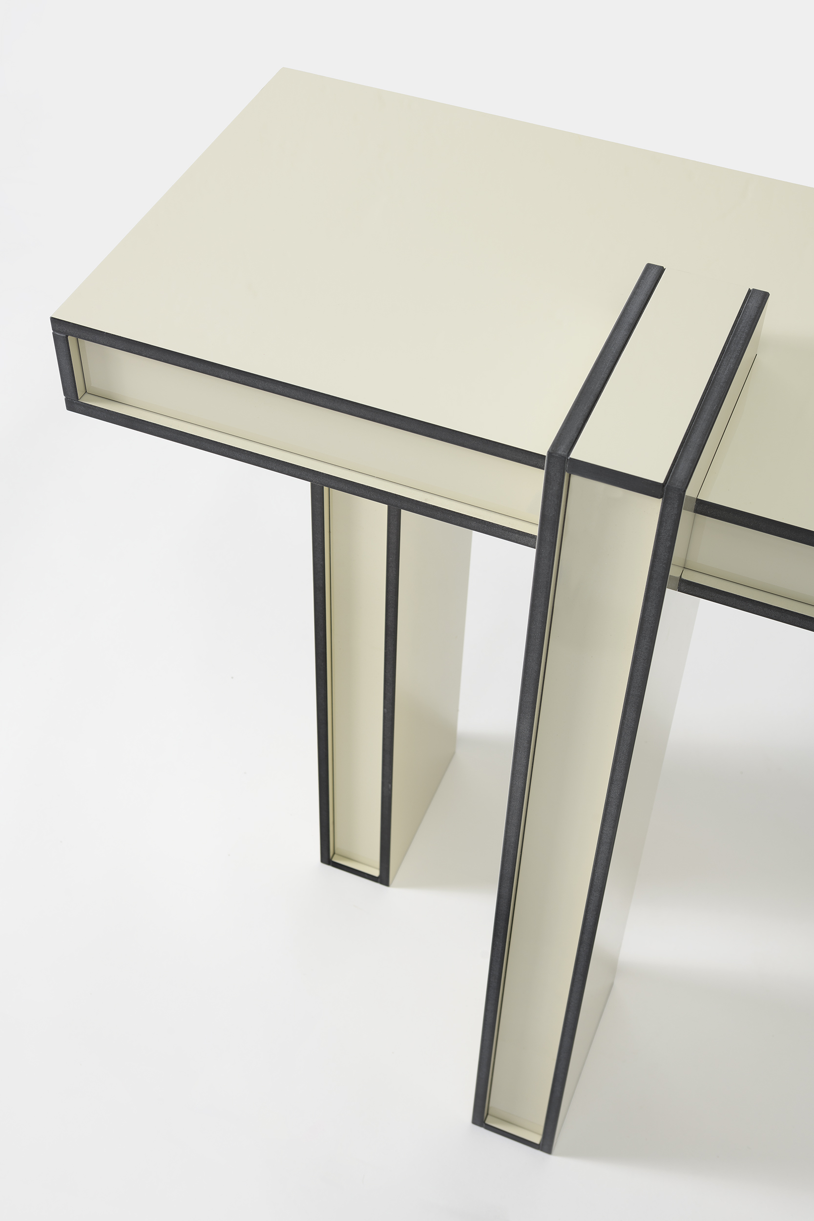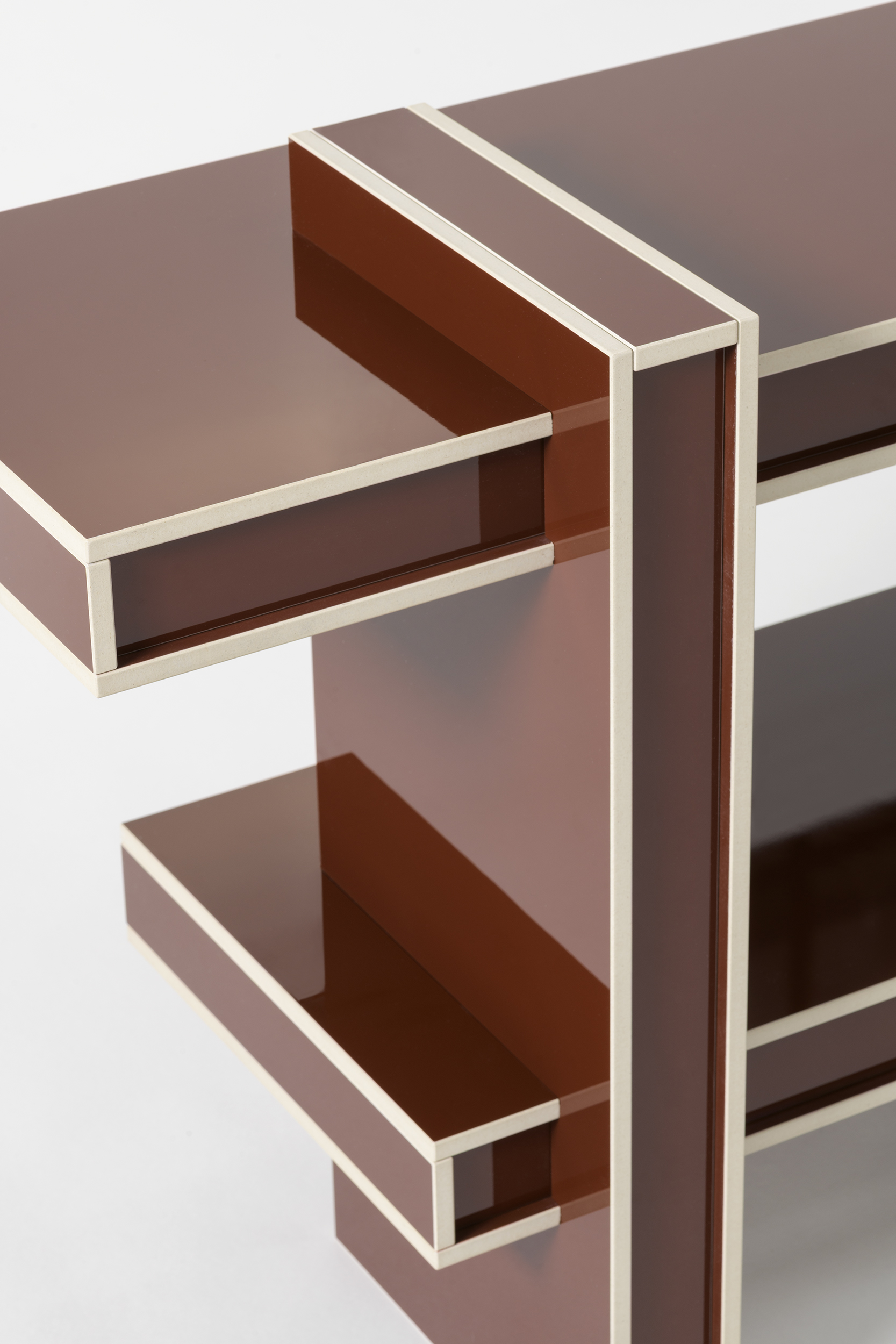 Il caratteristico profilo cromatico nasce dall’impiego di uno speciale pannello in MDF colorato in massa: una soluzione tecnica che permette di ottenere contrasti netti e precisi tra superfici e bordi, trasformando un dettaglio costruttivo in un gesto grafico capace di definire l’identità della collezione.