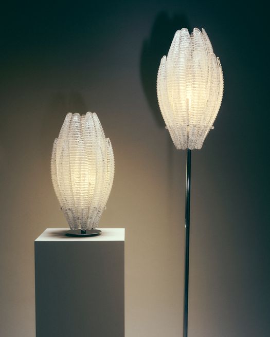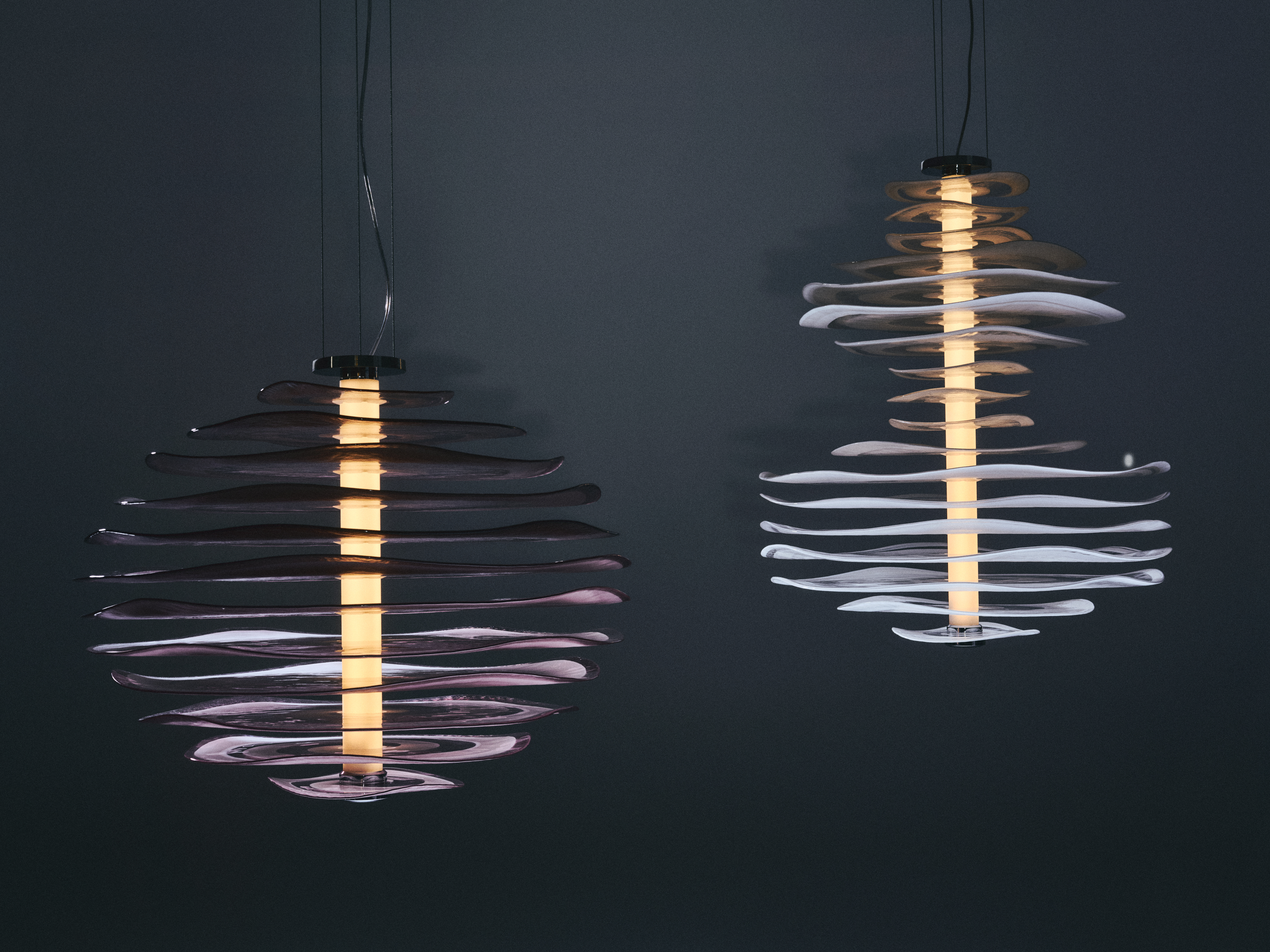 Il percorso prosegue con ulteriori novità e con l'ampliamento di collezioni esistenti. Le nuove versioni da tavolo e da terra di Agave, progettate da García Cumini, accentuano la tensione verticale e la leggerezza materica della collezione, valorizzata dalla tecnica della rugiada e da un effetto sfumato ottenuto con graniglia di vetro colorato.