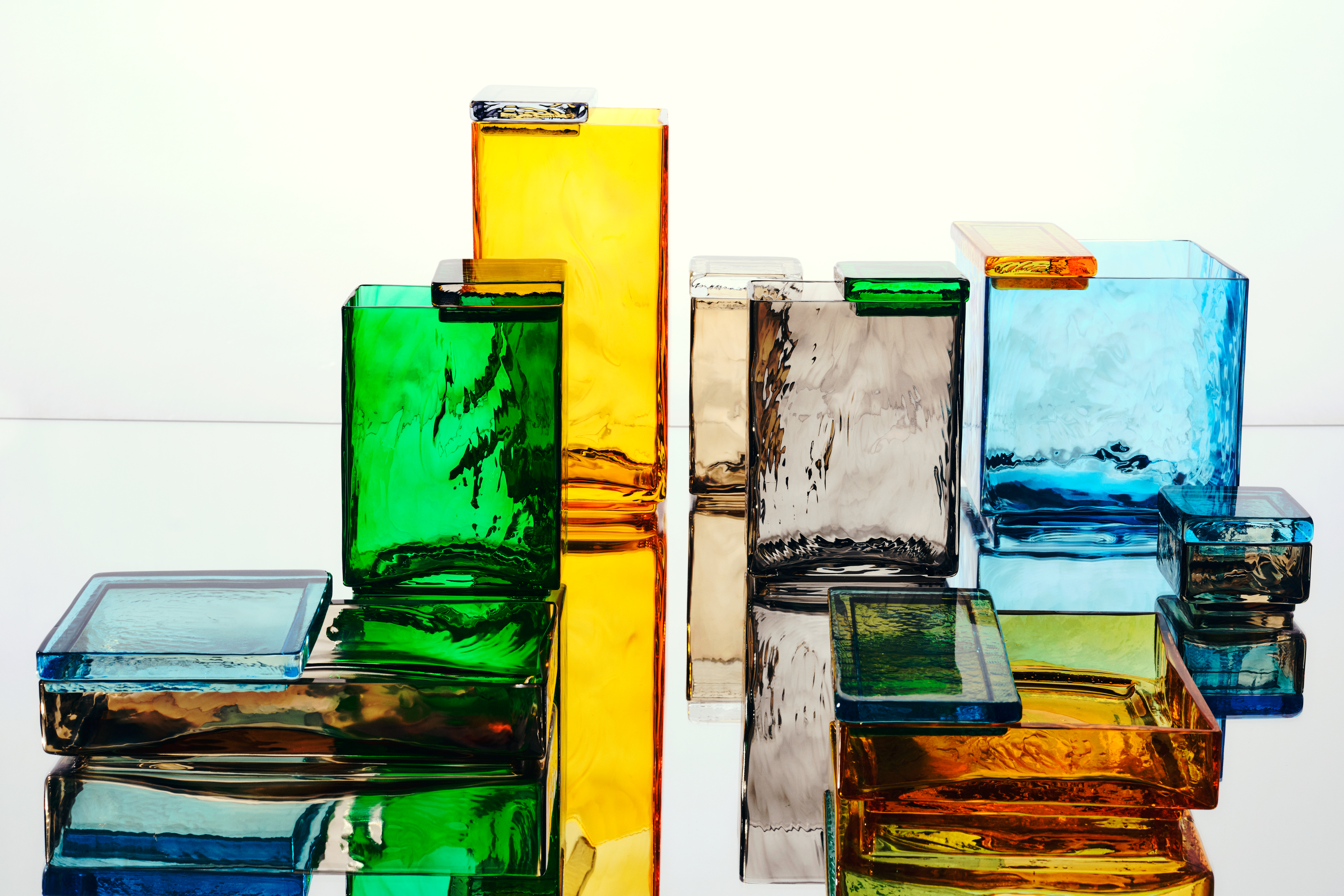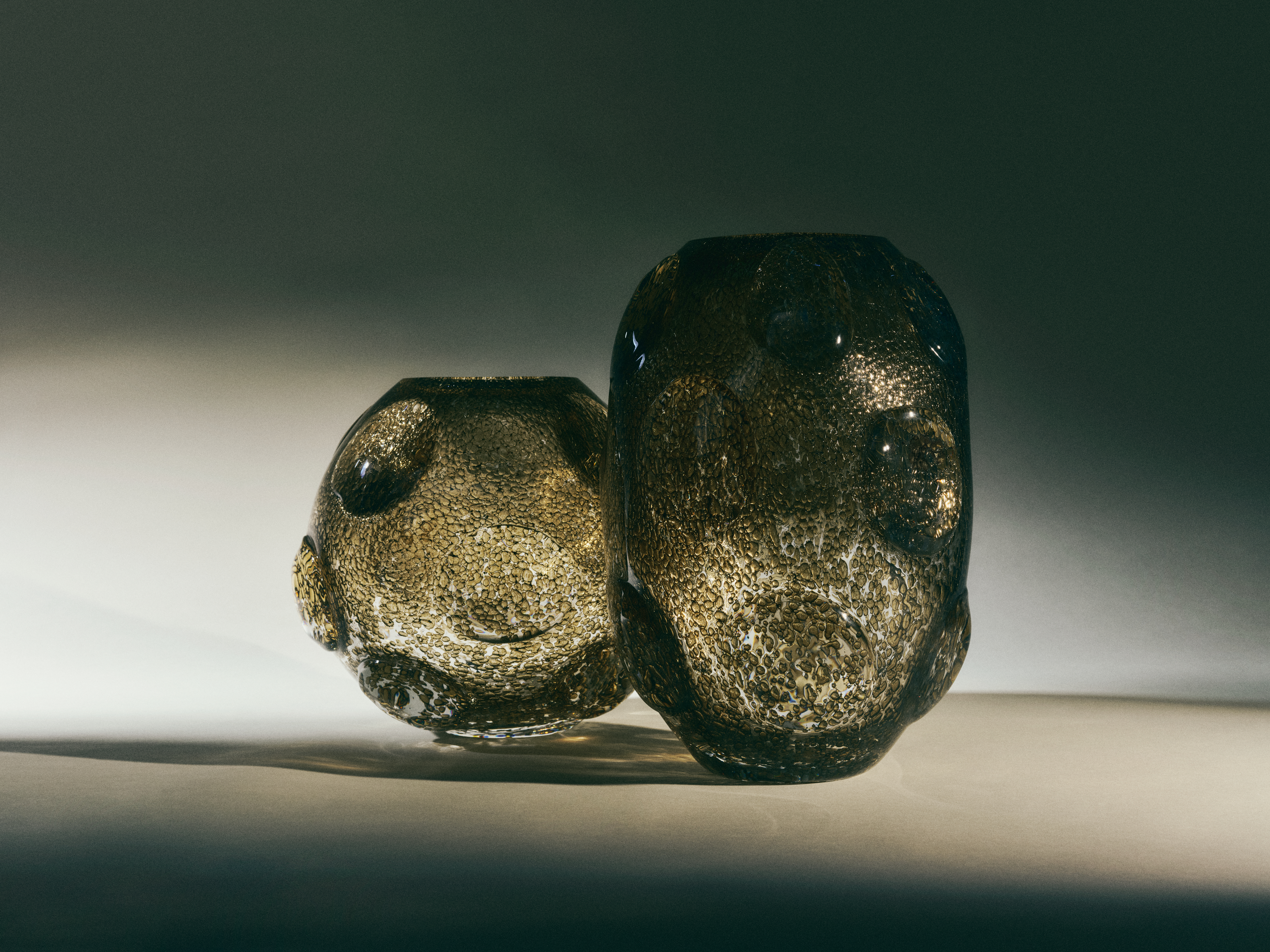 I vasi Lithos, di Emmanuel Babled, esplorano il vetro come materia geologica. Una polvere minerale reattiva genera bolle e inclusioni che si cristallizzano in una pelle compatta e irregolare, evocando roccia e stratificazioni fossili. Lenti ottiche integrate amplificano la morfologia interna, rendendo ogni pezzo unico e profondamente materico.