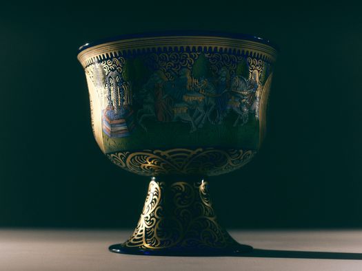 A conclusione del percorso, la Coppa Barovier, capolavoro del Rinascimento muranese, realizzata intorno al 1460 e tradizionalmente attribuita ad Angelo Barovier, riafferma il legame dell’azienda con la propria storia. Dipinta a smalti policromi e oro su vetro blu intenso, continua ancora oggi a essere prodotta secondo le tecniche originarie, custodendo una tradizione che attraversa oltre cinque secoli.