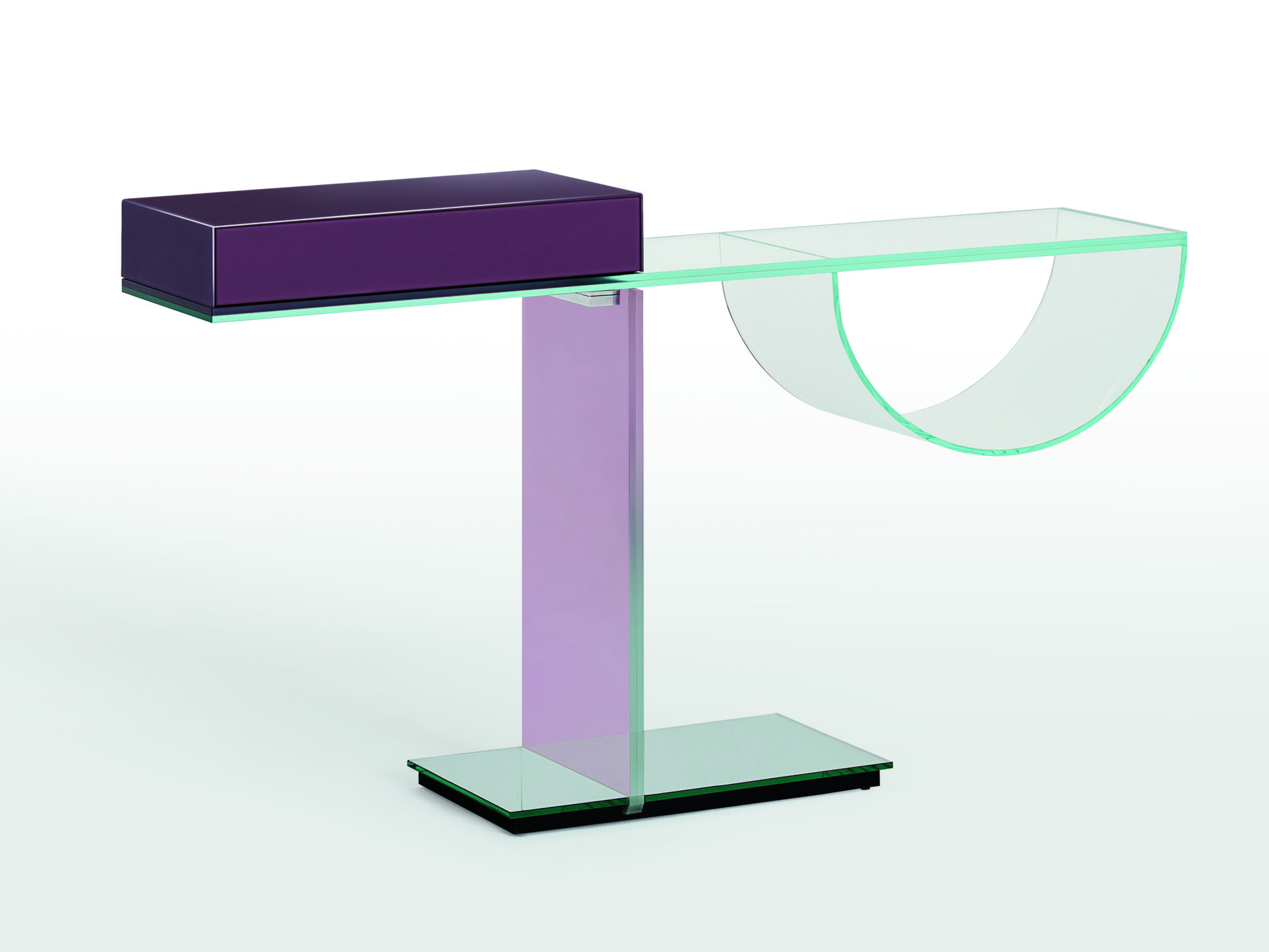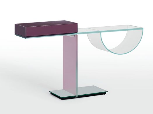 Ollie per Glas Italiaè una consolle in cristallo dalle raffinate ed innovative soluzioni tecniche ed estetico-decorative. Sulla superficie inferiore del top, in cristallo extrachiaro stratificato, è incollato a UV un cristallo extrachiaro curvo con funzione porta oggetti, mentre sulla superficie superiore è fissato un cassetto, rivestito in cristallo laccato lucido di colore viola-lilla. La piantana verticale è in cristallo temperato stratificato con finitura trasparente colorata e la base è rivestita in specchio.