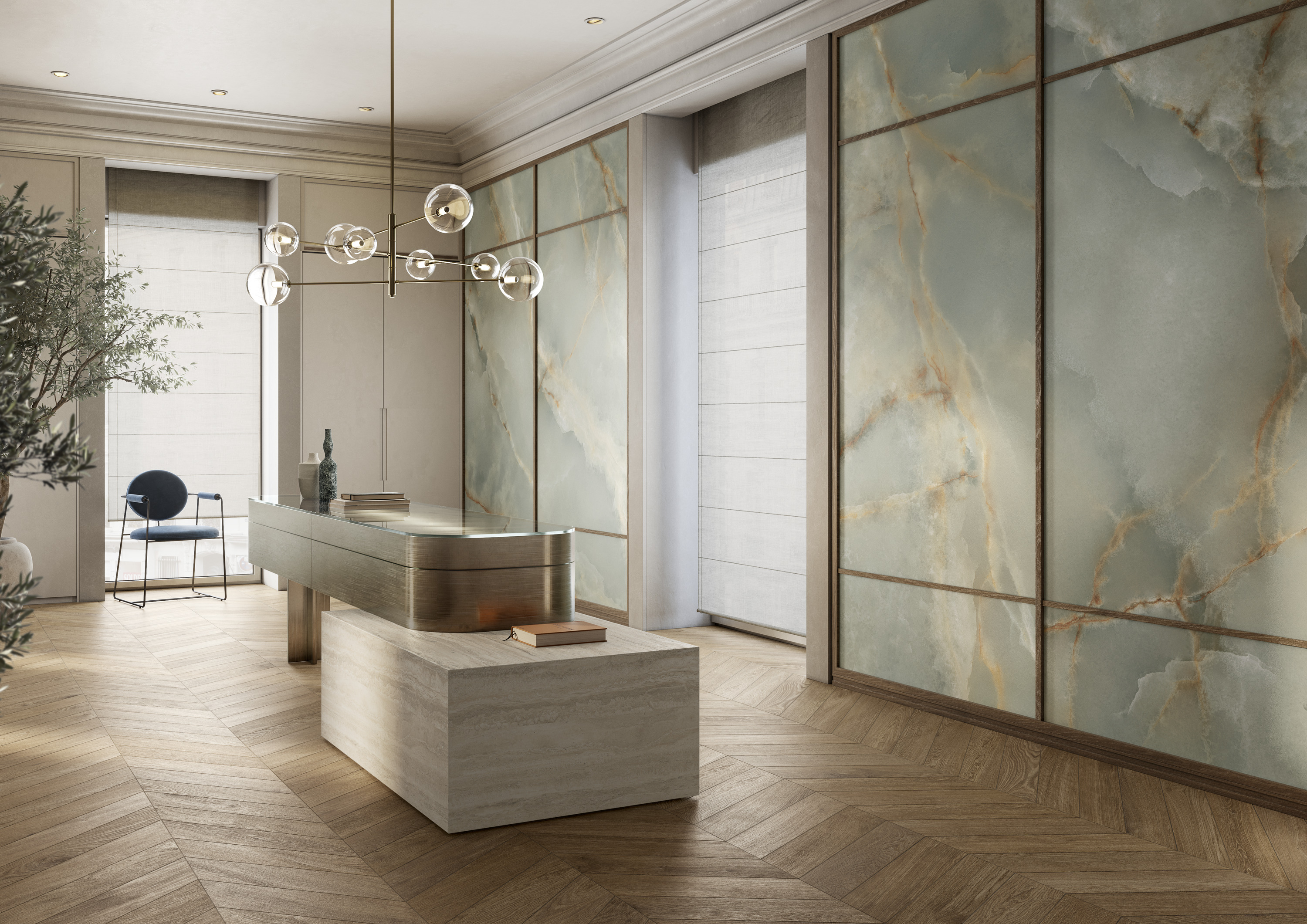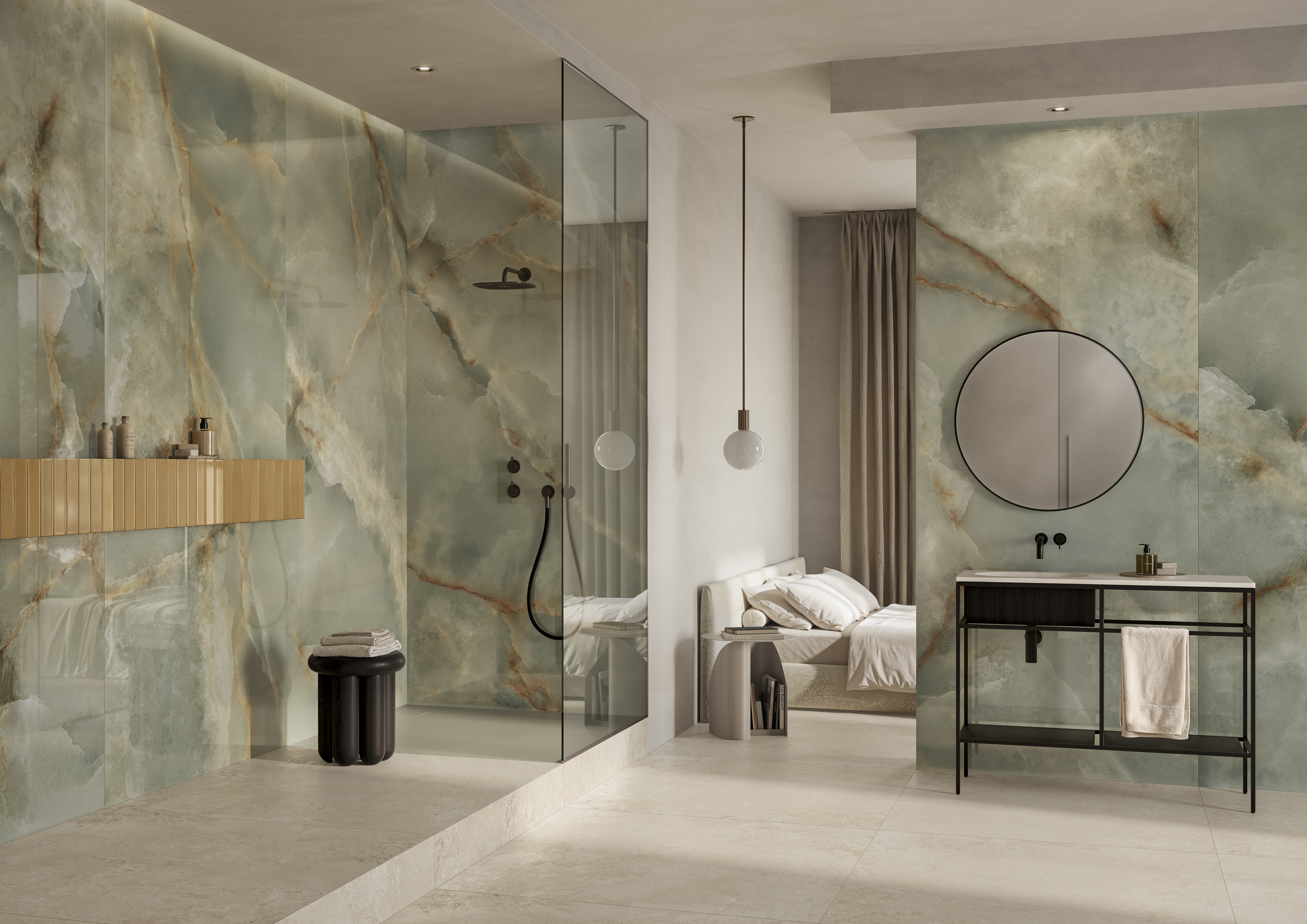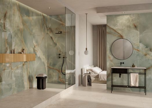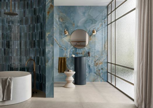 Le cinque nuove finiture si ispirano all'onice e includono Avorio, Venato Avorio, Perla, Blu e Verde. Ognuna è accompagnata dal mosaico Ventaglio, che aggiunge movimento e originalità al progetto.