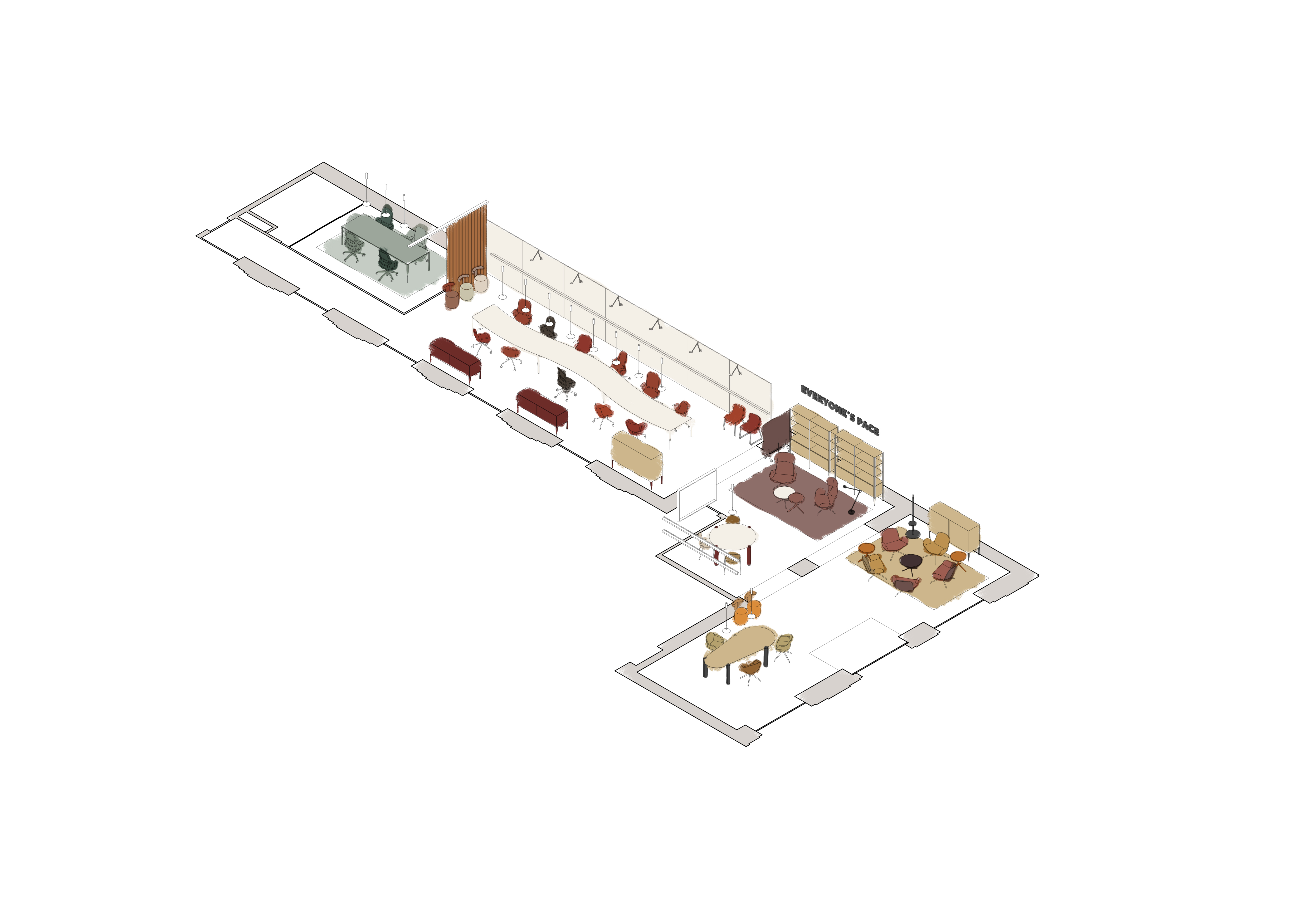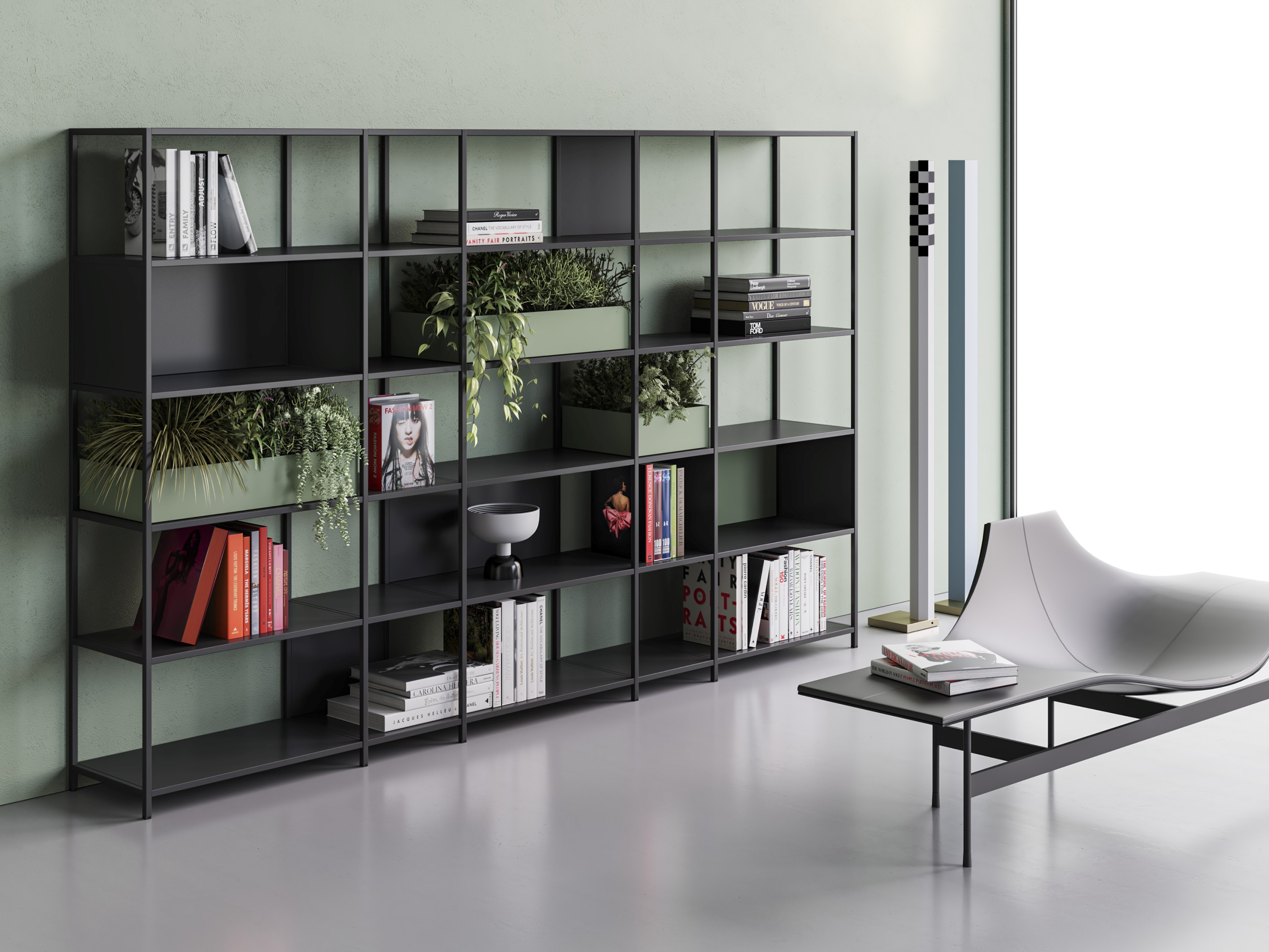 Il terzo ambiente è un grande open space allestito come uno studio creativo, in cui protagonista principale è una configurazione a onda di tavoli Silhouette, design di Robin Rizzini per DVO, completata da madie, contenitori della stessa collezione. Tutti gli elementi condividono un segno progettuale chiaro e riconoscibile: un unico profilo in acciaio che scorre dall’alto fino a terra, modellato in una sottile U che unisce precisione e leggerezza, trasformando la rigidità del materiale in un ritmo morbido e armonioso.
