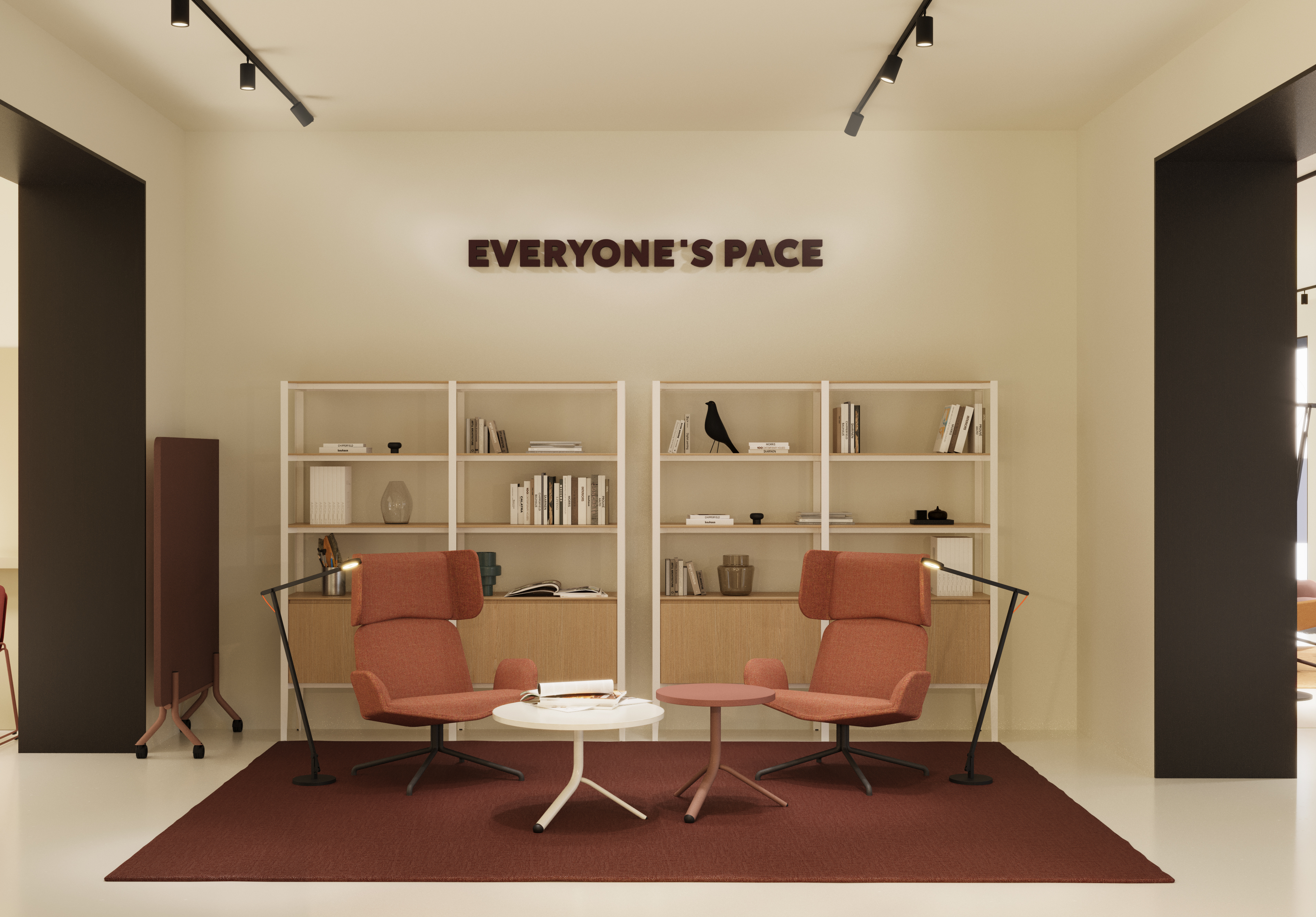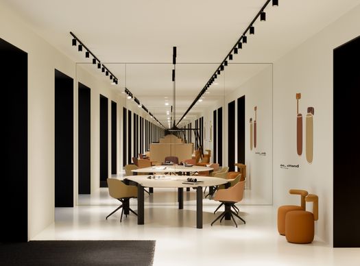 La gallery d’ingresso si presenta come un grande showcase in dialogo con la città: qui, in un allestimento volutamente essenziale e rarefatto, trovano spazio due nuovi prodotti. Il tavolo Anchor disegnato da Robin Rizzini per DVO, con il piano dalla forma organica, è dedicato al lavoro e alla condivisione, mentre le poltrone lounge Vyra di Marco Zito per Sitland, nella versione con schienale basso, accompagnano momenti di relax, conversazione e attesa.