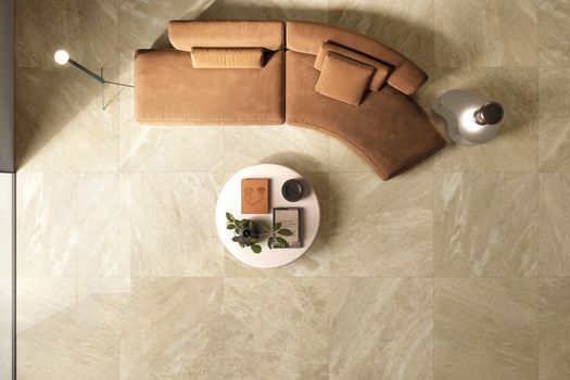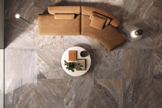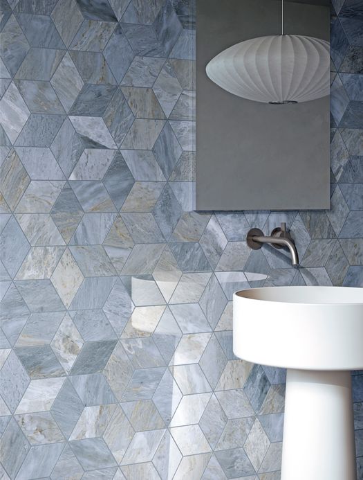 Nuance nei toni del grigio perla, l’azzurro cenere e l’ocra dorato tingono le superfici in ceramica: accenti cromatici che si inseriscono a contrasto col fondo, mantenendo una perfetta armonia con il colore e integrandosi con coerenza in ogni variante. La texture esalta la ricchezza naturale del marmo, donando movimento e profondità con un risultato visivo mutevole e avvolgente, animato da chiaroscuri e riflessi che valorizzano la tridimensionalità.