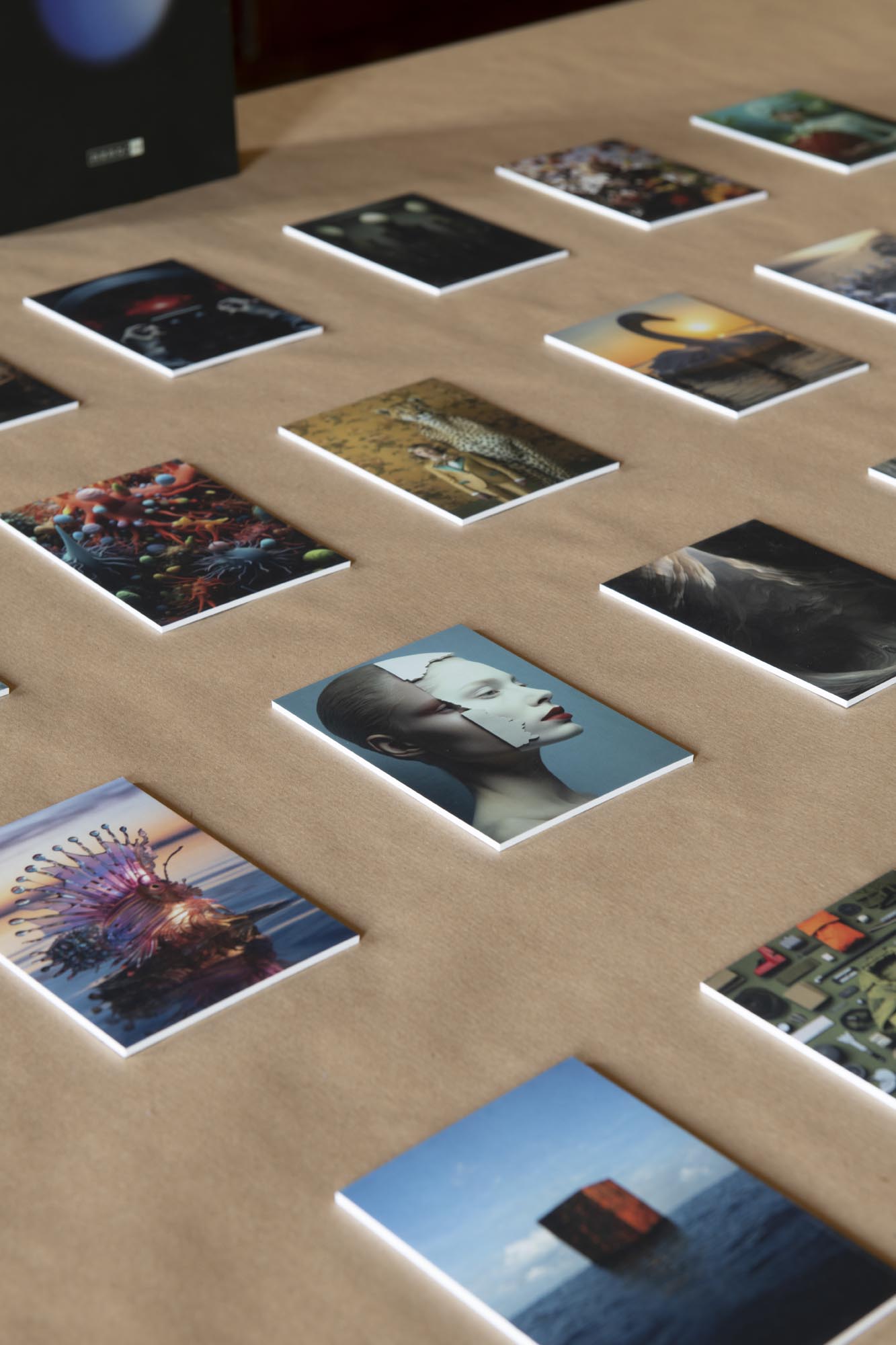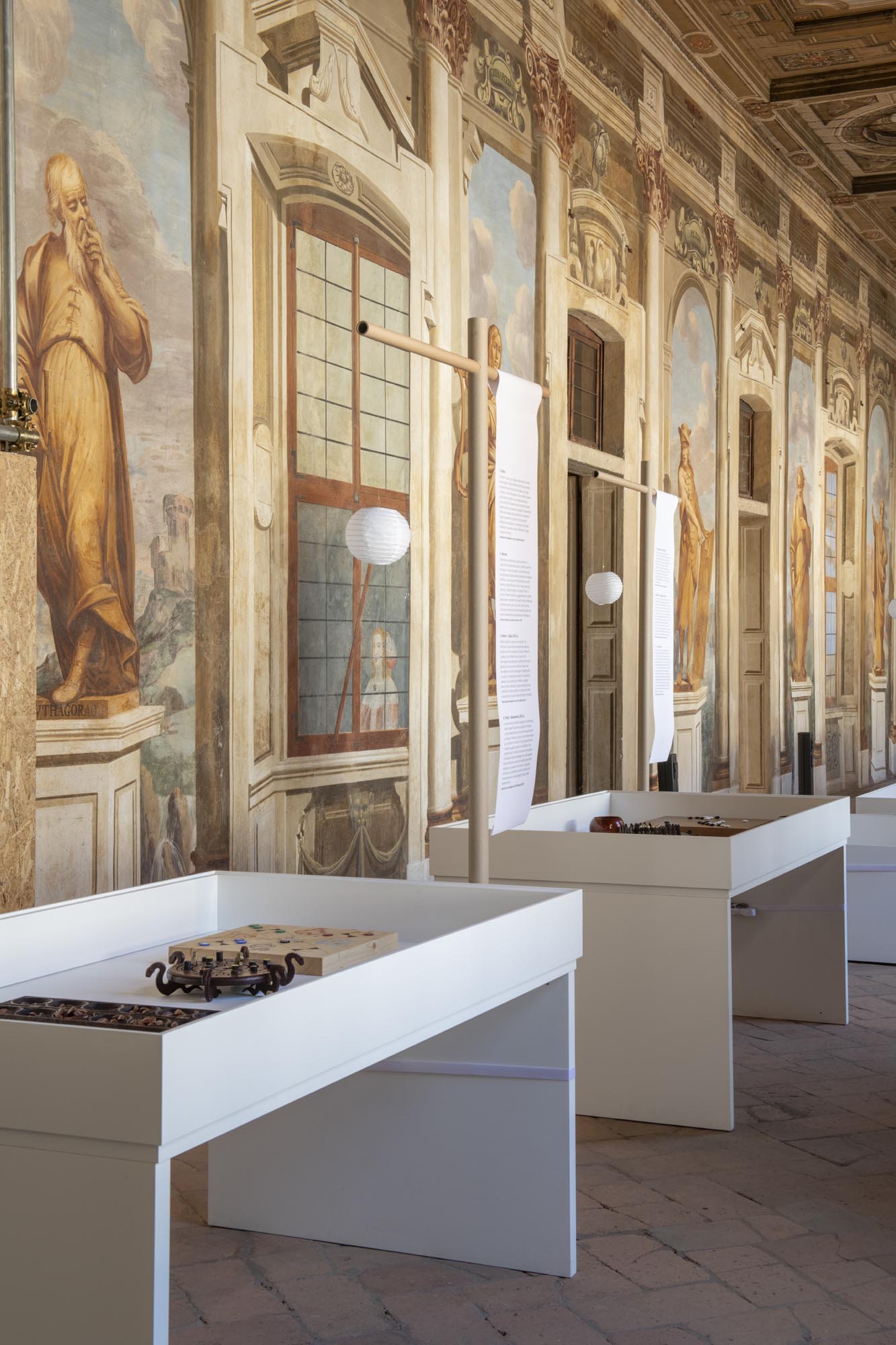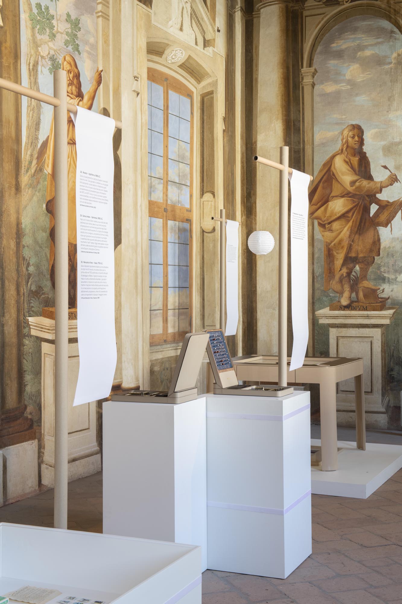 Materiali essenziali – carta, cartone, superfici neutre – costruiscono un sistema espositivo sobrio, in cui il colore avana della carta Kraft unifica segnaletica e tavoli da gioco, rafforzando la dimensione tattile e manuale dell’esperienza.