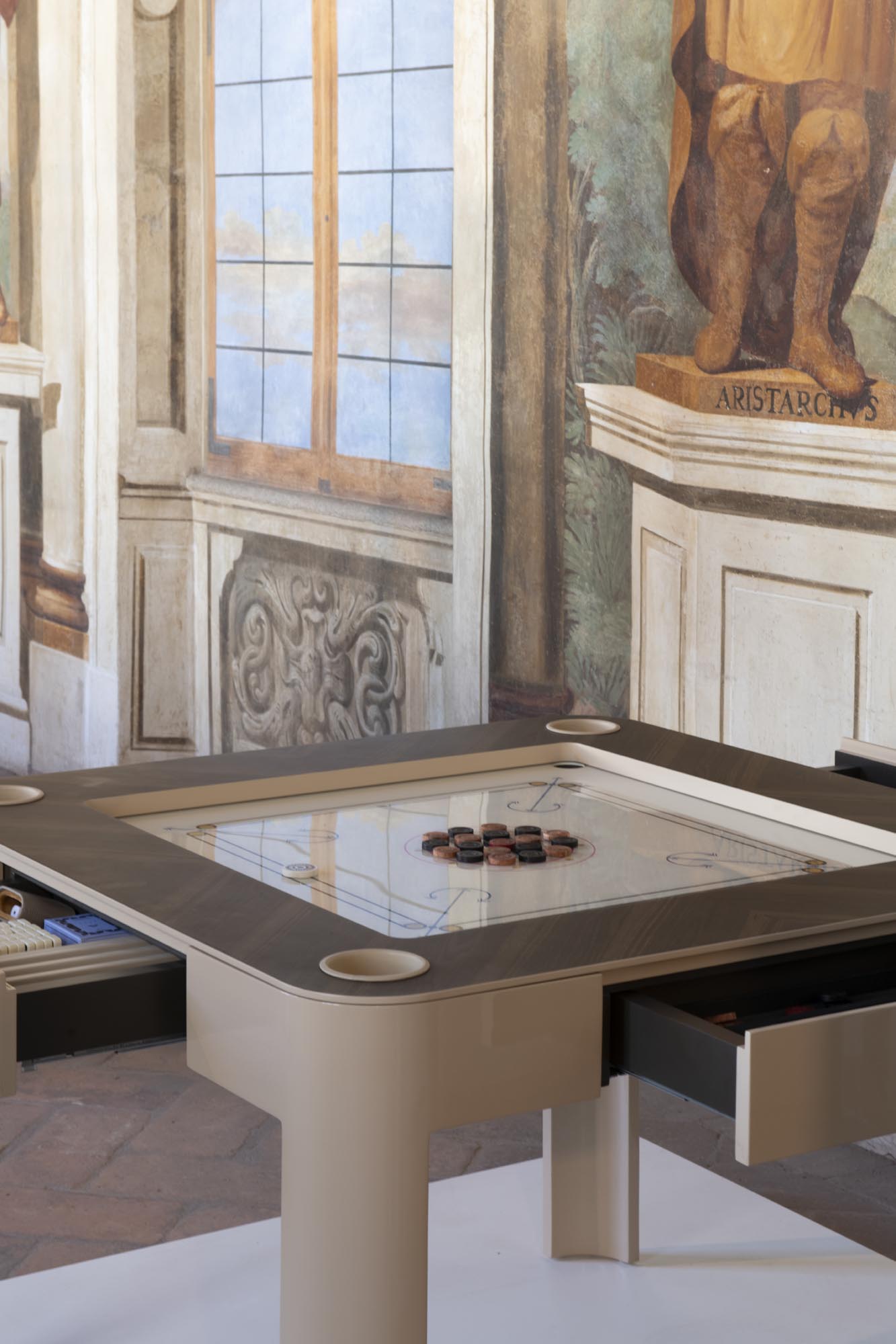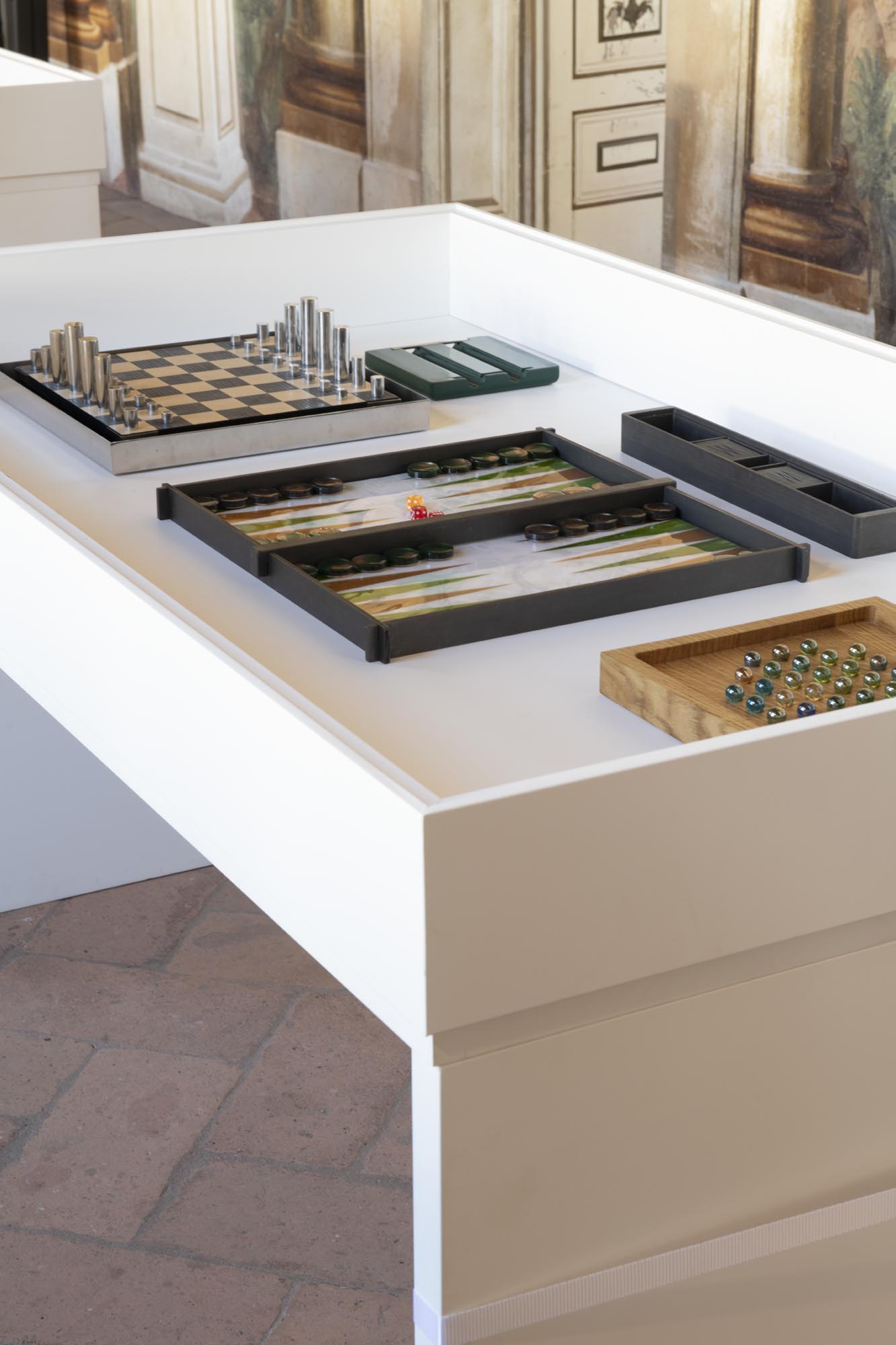 Accanto a questi, trovano spazio interpretazioni firmate da designer e aziende: dagli scacchi in acciaio di Gianfranco Frattini ai giochi in legno e pelle di Pinetti, fino agli oggetti progettati da Vismara Design e Pineider, che mostrano il dialogo tra design e cultura ludica.
