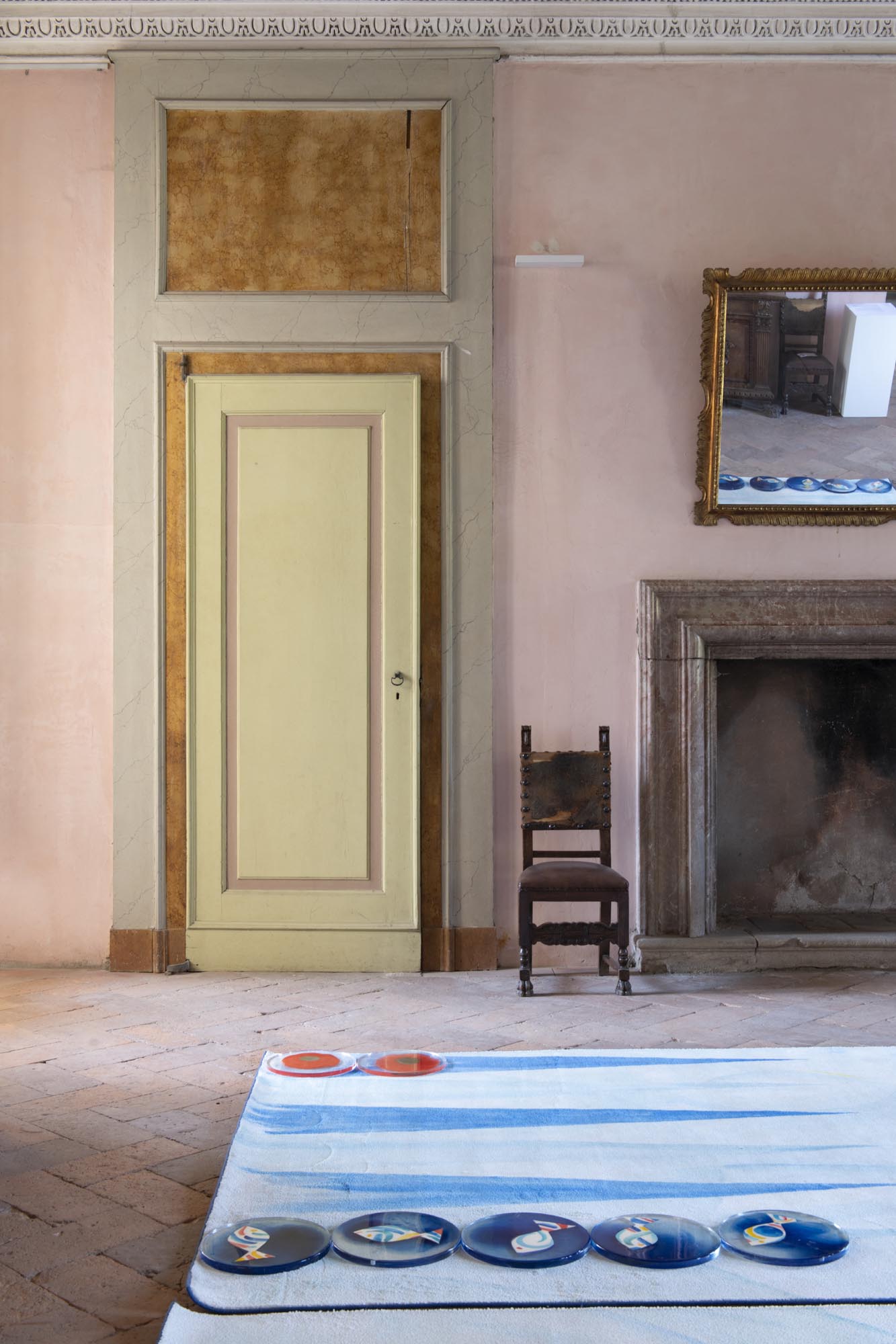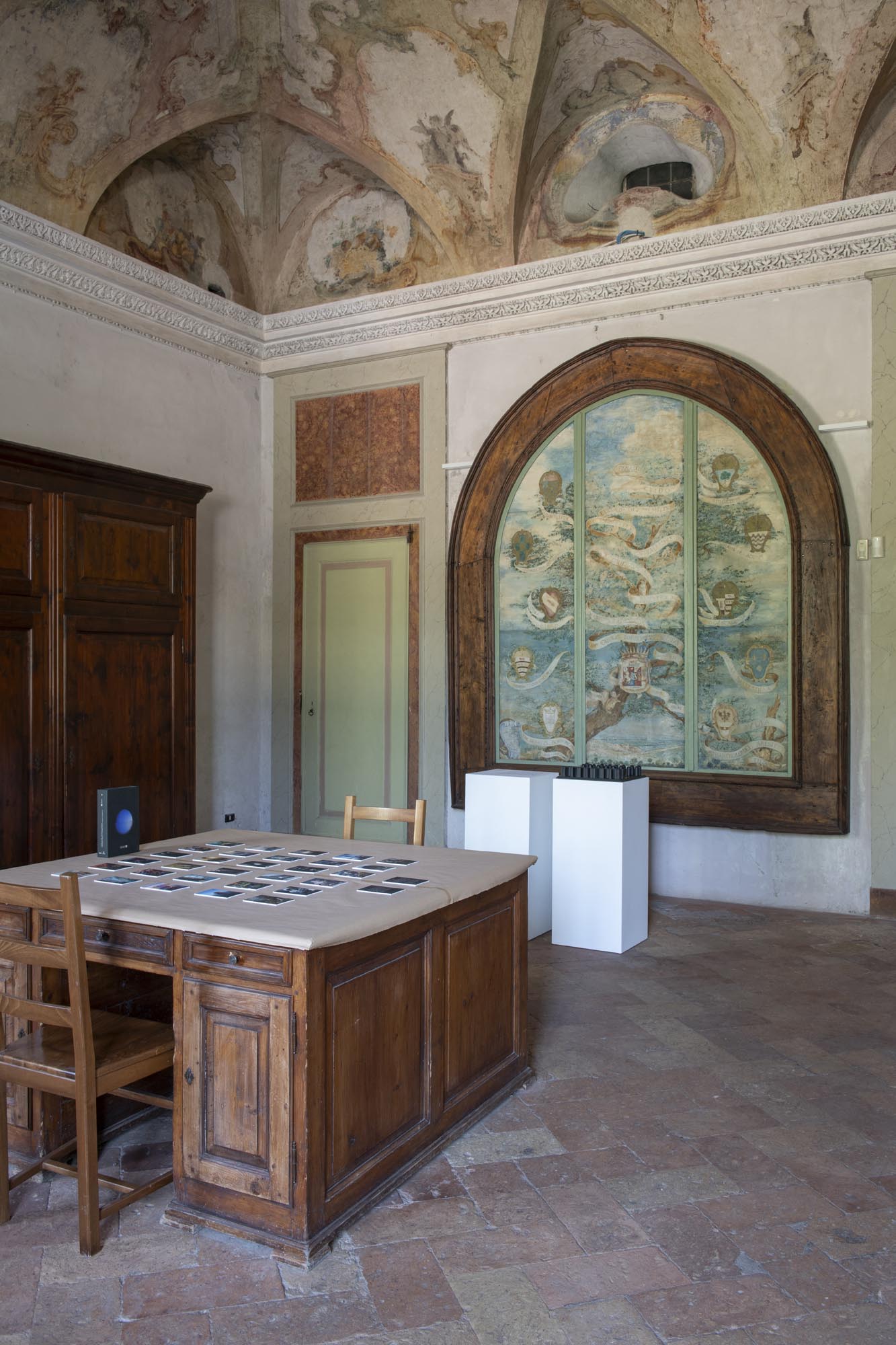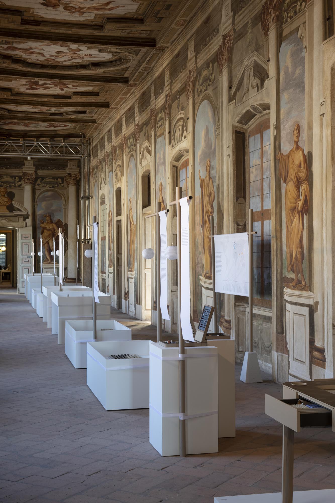 L’allestimento, curato da Six Plus Architetti con Lola Ottolini e Gabriella Cipolla, si ispira ai sashimono, gli stendardi giapponesi utilizzati in battaglia. Questi elementi diventano dispositivi segnaletici che organizzano il percorso, in dialogo leggero con gli ambienti affrescati del palazzo.