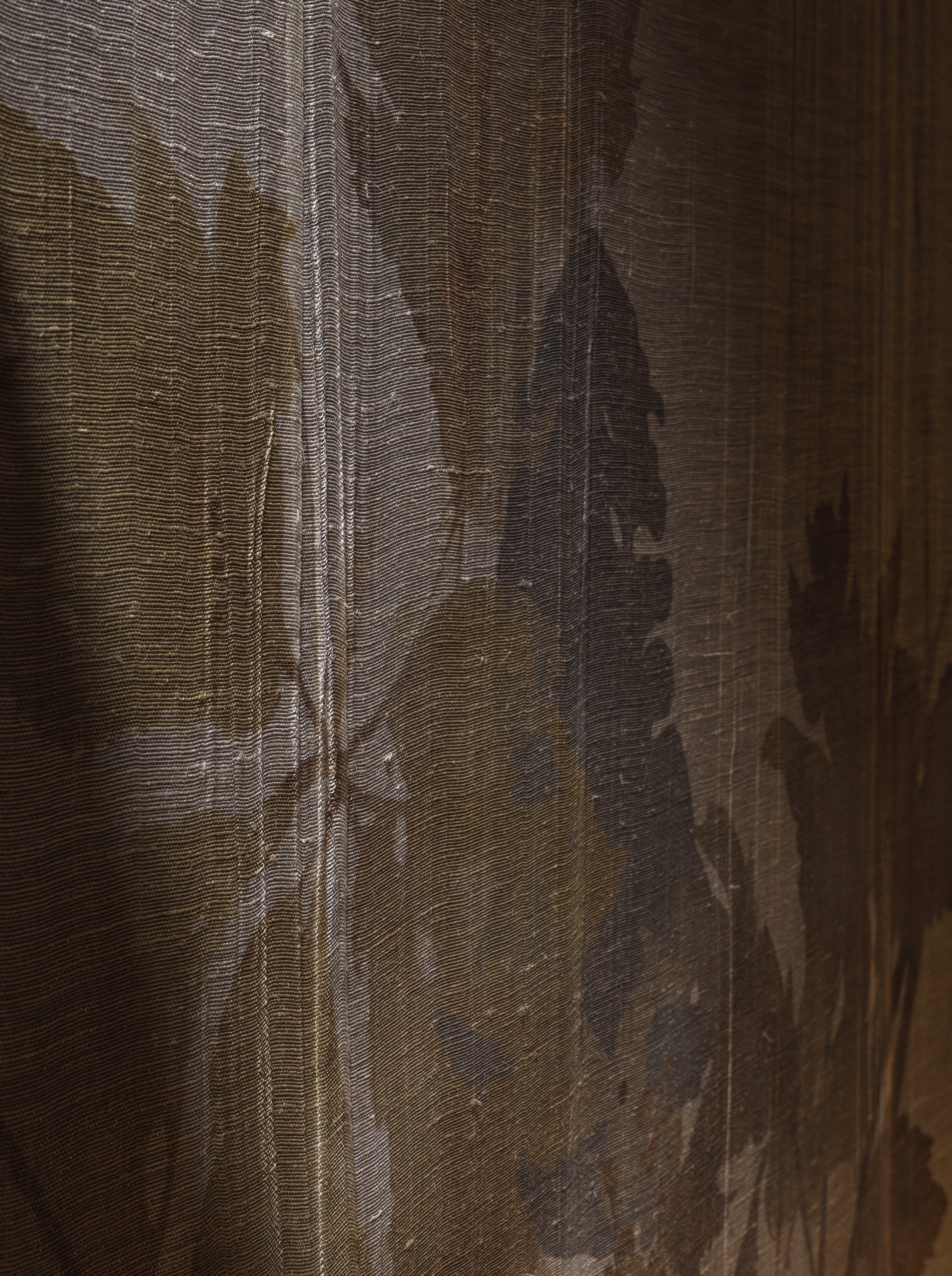 I motivi di Vespera Collection emergono in modo tenue e stratificato, come immagini polverose nella memoria: accenni ai decori di un servizio da tè, alle ombre della vegetazione che si proiettano sui panni stesi al sole, ai tessuti e ai corredi che custodiscono storie familiari. Il figurativismo non è mai dichiarato, ma si lascia intuire attraverso segni misurati e rarefatti, lasciando spazio al linguaggio della materia e alle sue increspature.